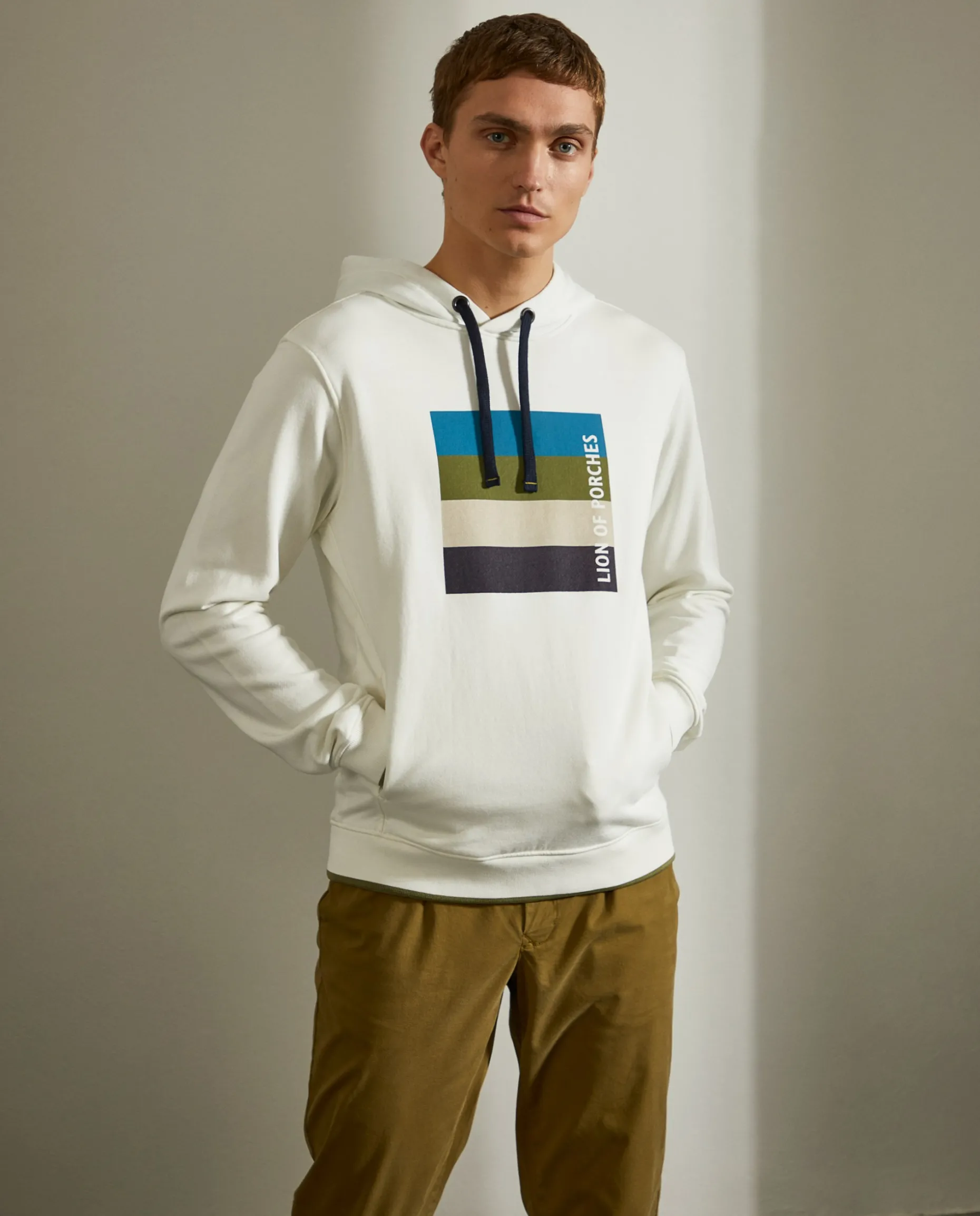 Sweatshirt com capuz. Interior do capuz em contraste. Estampado na frente com branding Lion of Porches. Ilhós prata mate com cordões noutra cor. Risca em contraste nos punhos e base.