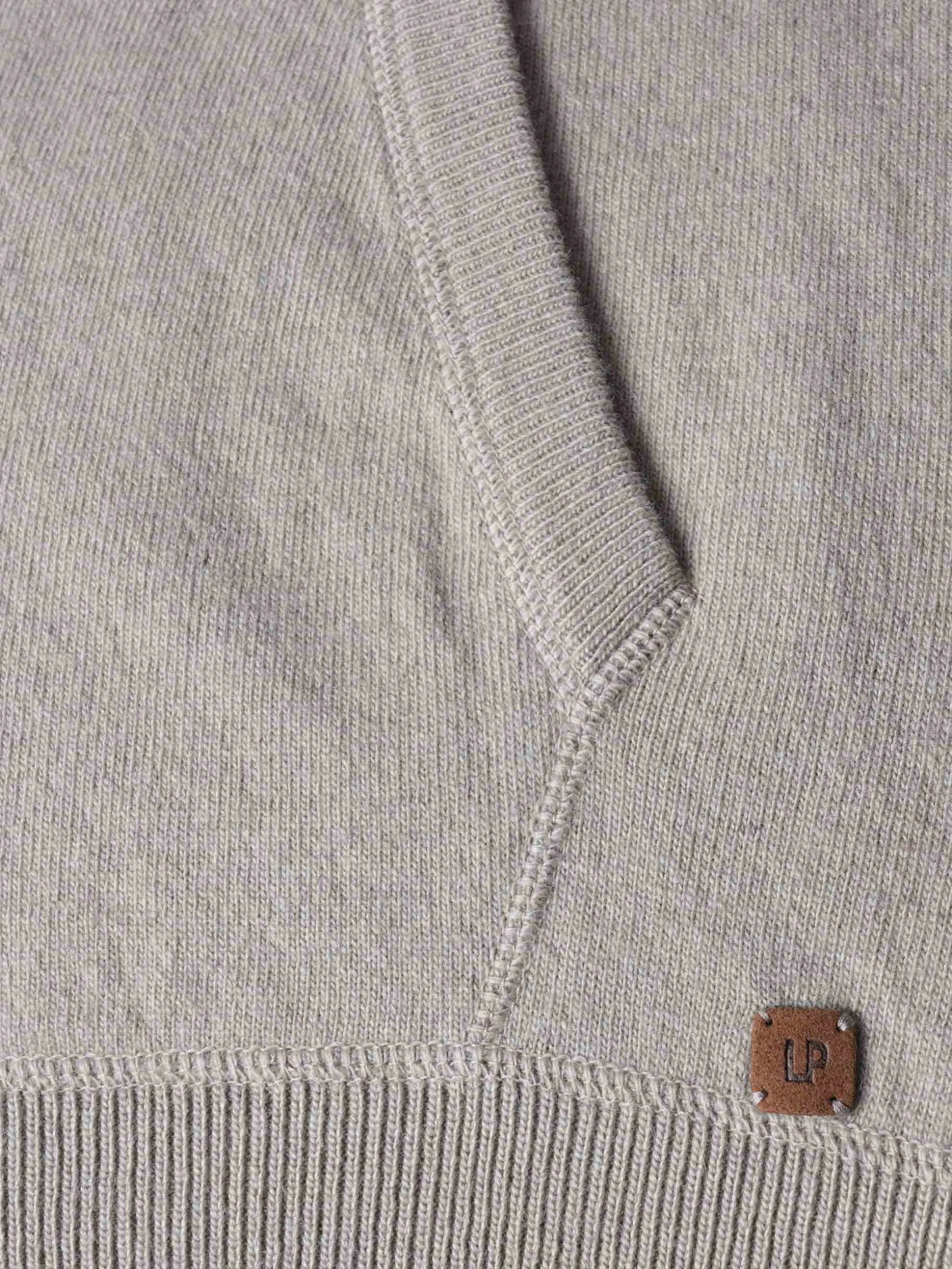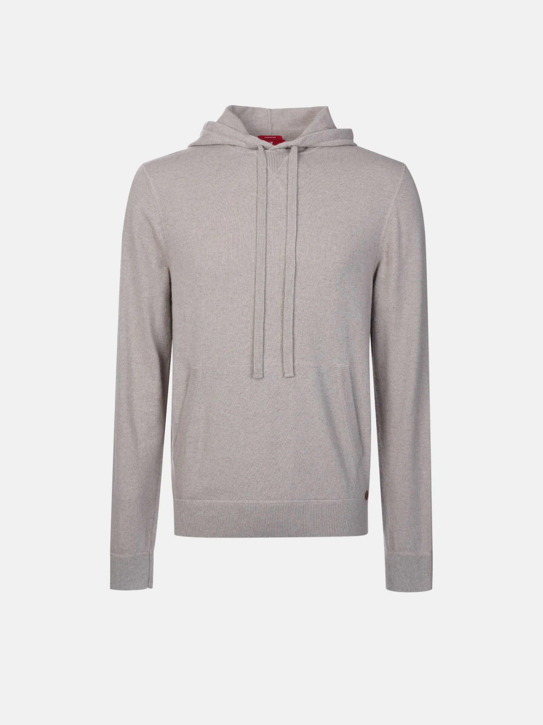 Sweatshirt com capuz confecionada em lã e caxemira. Cordões espalmados à cor. Detalhe em baixo com etiqueta de camurça personalizada.
