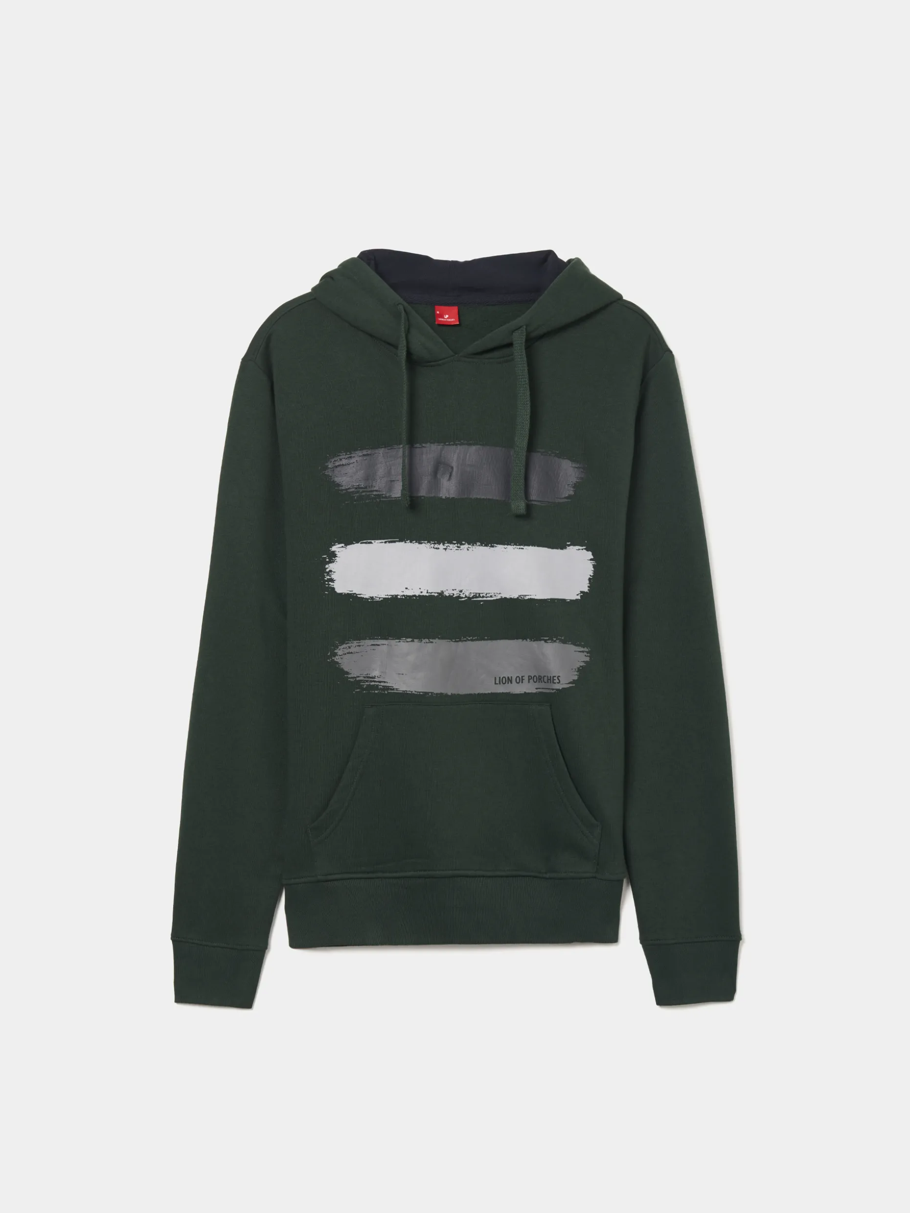 Sweatshirt hoodie com estampado tricolor na frente. Com capuz ajustável cujo interior é em contraste de cor. Bolso canguru e extremidades caneladas. Disponível em várias cores.