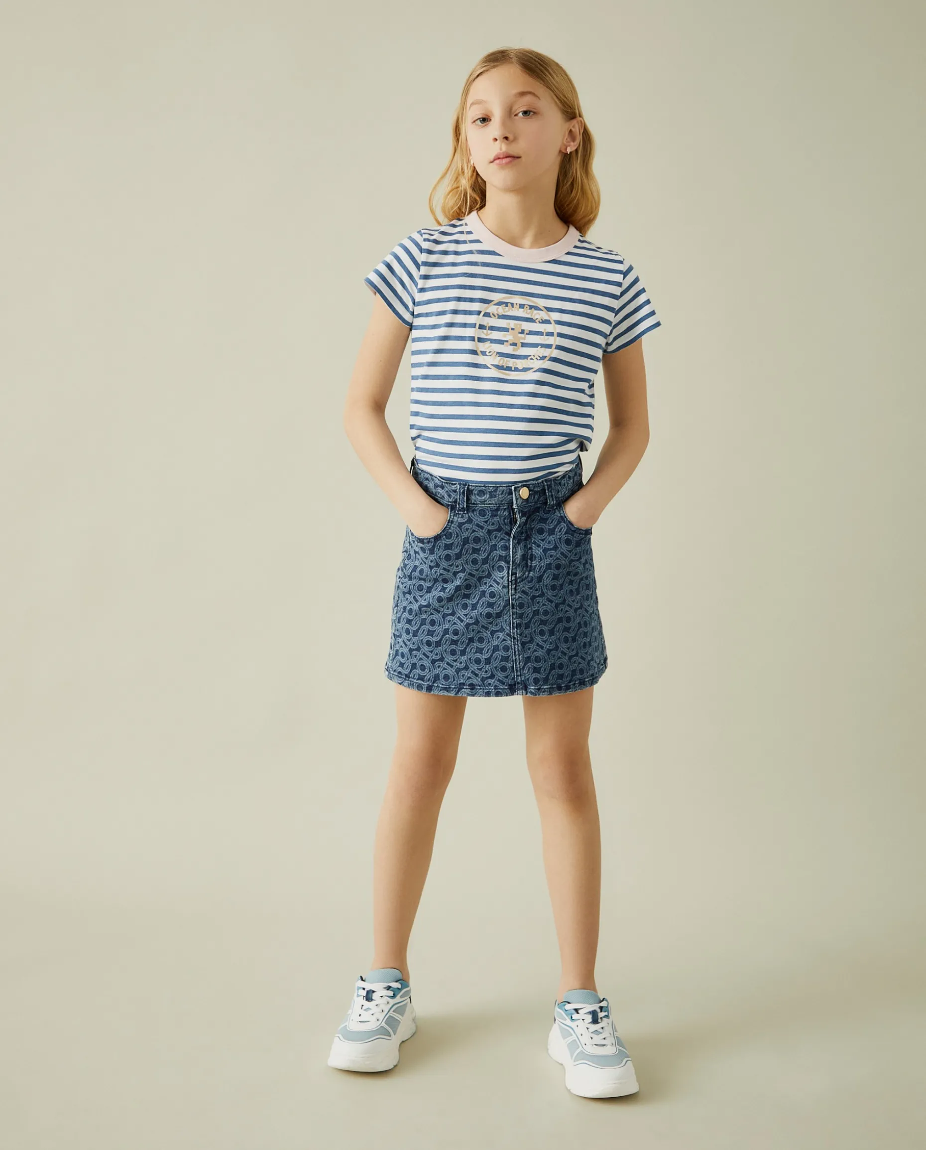 T-shirt de manga curta com padrão de riscas horizontais. Pormenor de logotipo estampado na frente e gola redonda em contraste de cor. É confecionada, na totalidade, em algodão para maior conforto.