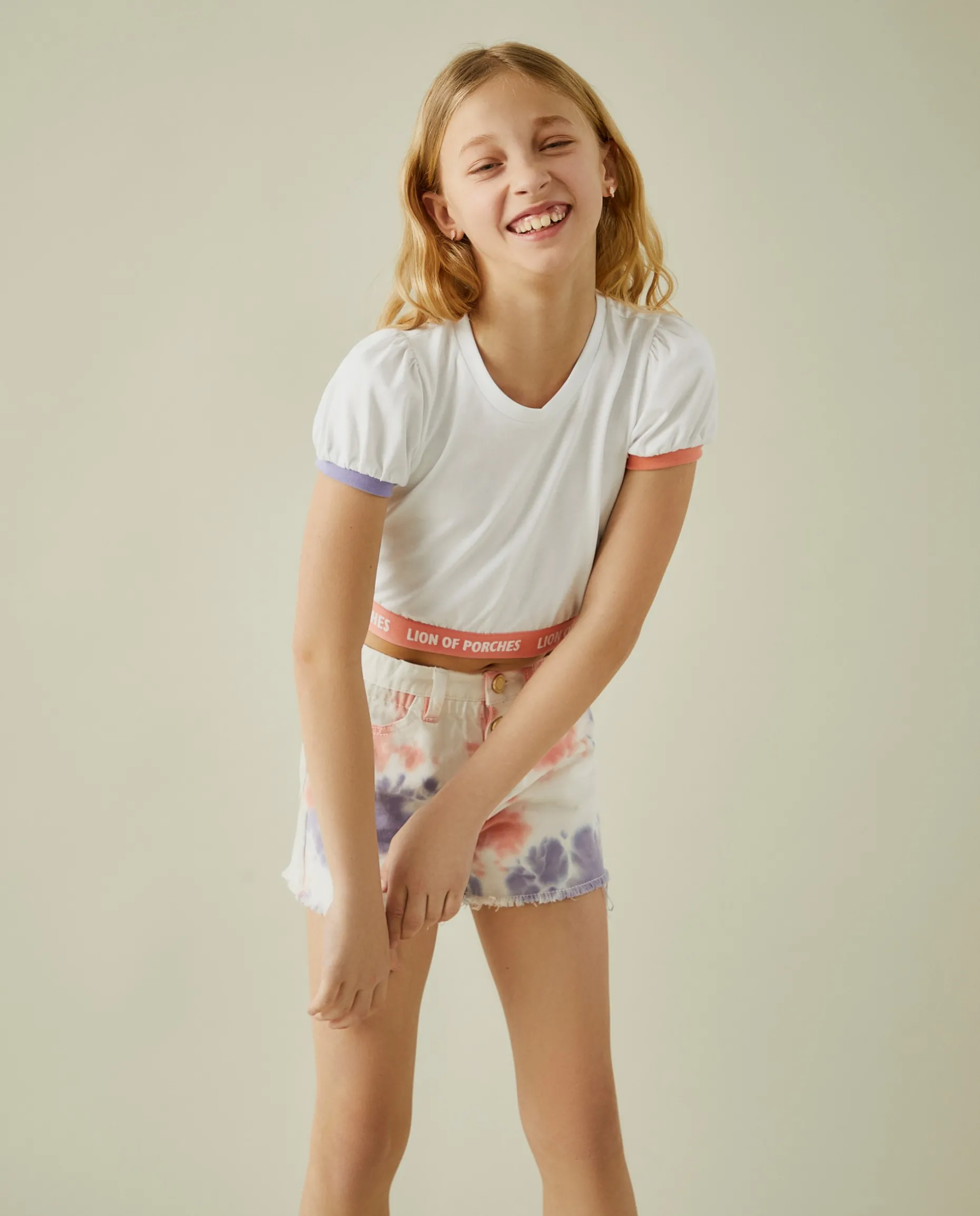 T-shirt cropped de manga curta em balão que finaliza com fita de cor diferente em cada manga. Pormenor semelhante na cintura com fita elástica e branding Lion of Porches. A gola é redonda. É confecionada, na totalidade, em algodão para maior conforto e suavidade. Para um total look, veja também os calções de malha, da mesma coleção.