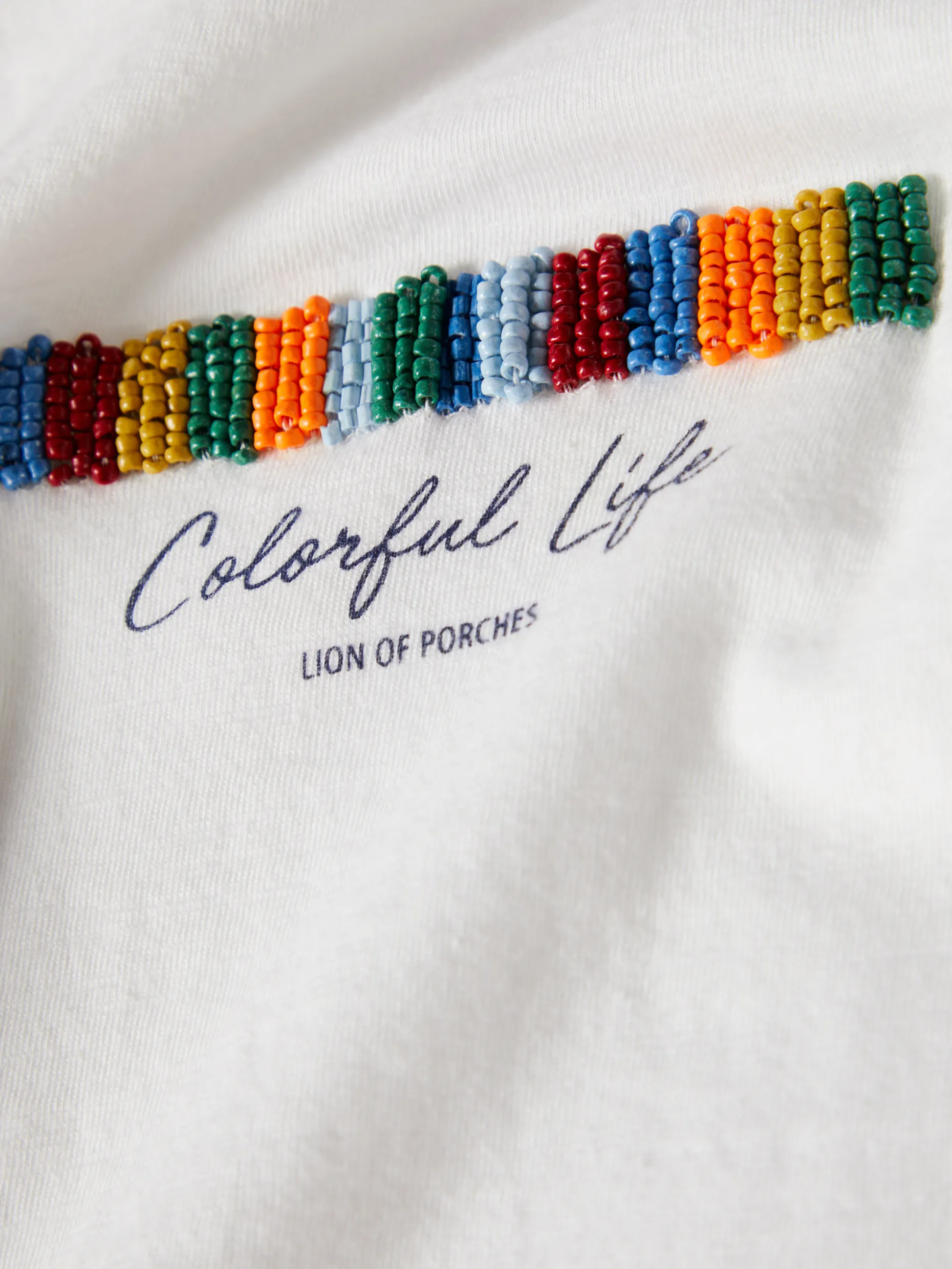 T-shirt de manga curta com mensagem e barra de missangas coloridas no peito. A gola é redonda. É confecionada, na totalidade, em algodão para maior conforto e suavidade.