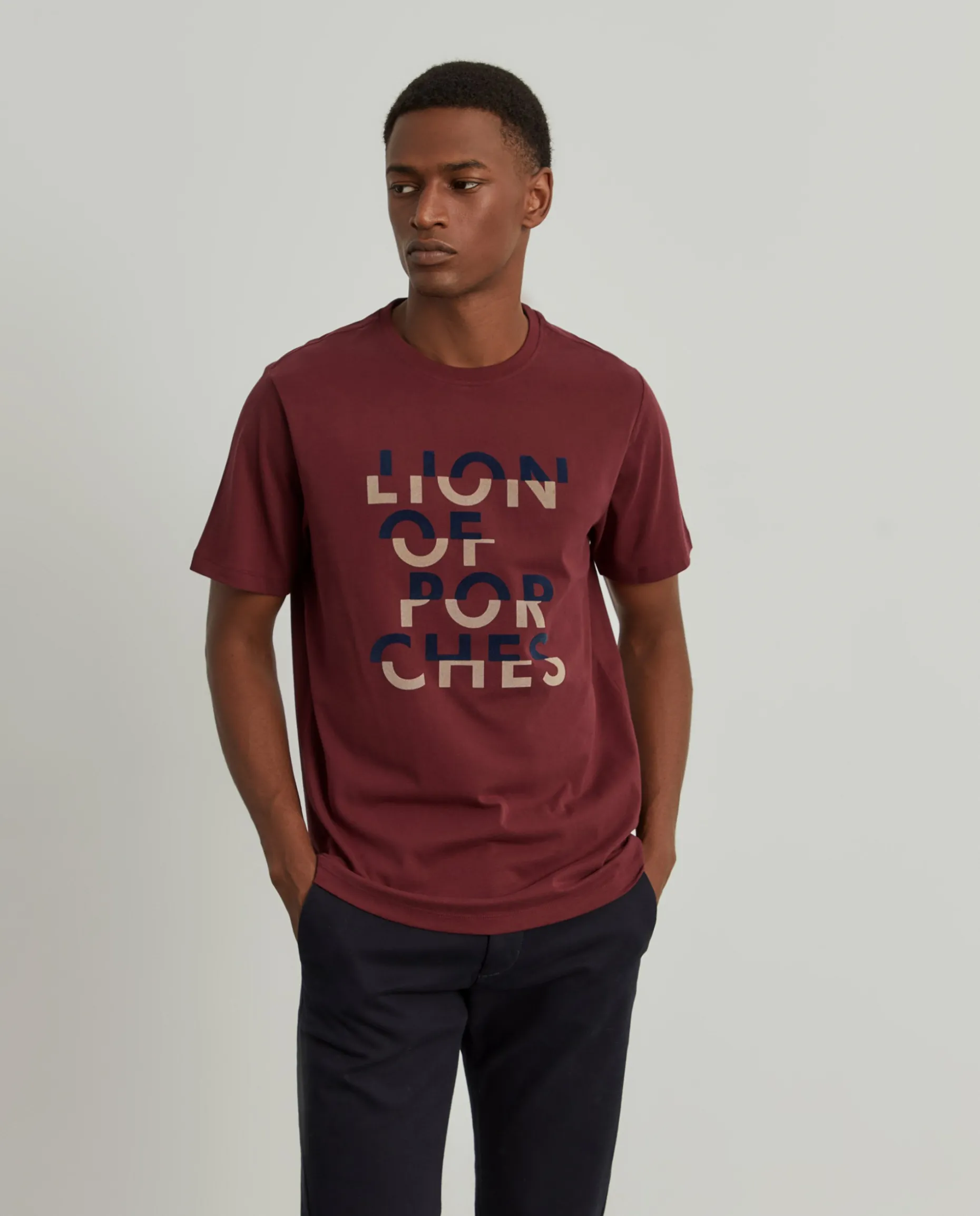 T-shirt de manga curta com estampado Lion of Porches em contraste na frente. É confecionada em algodão para maior conforto e suavidade. Disponível em várias cores.