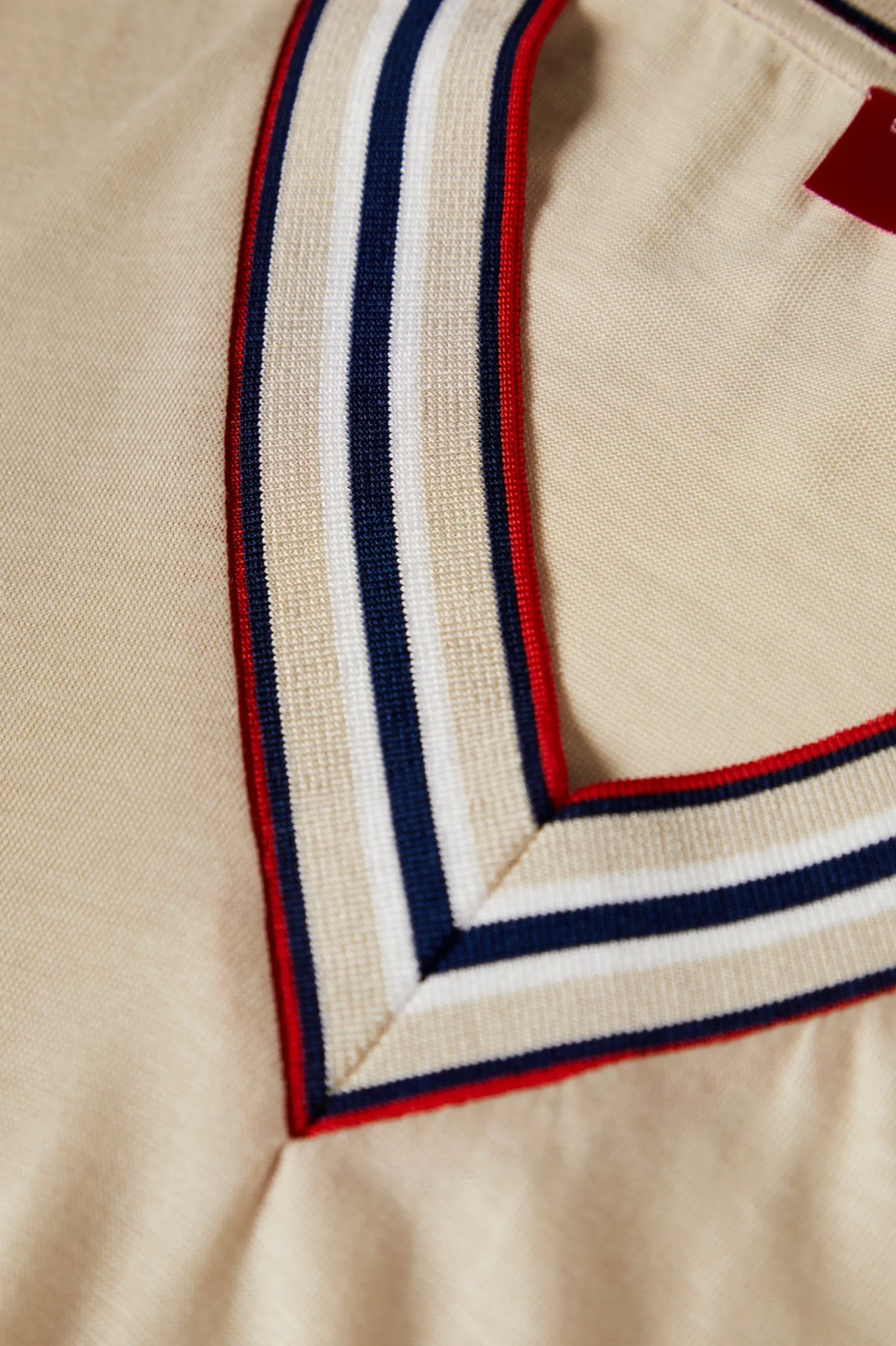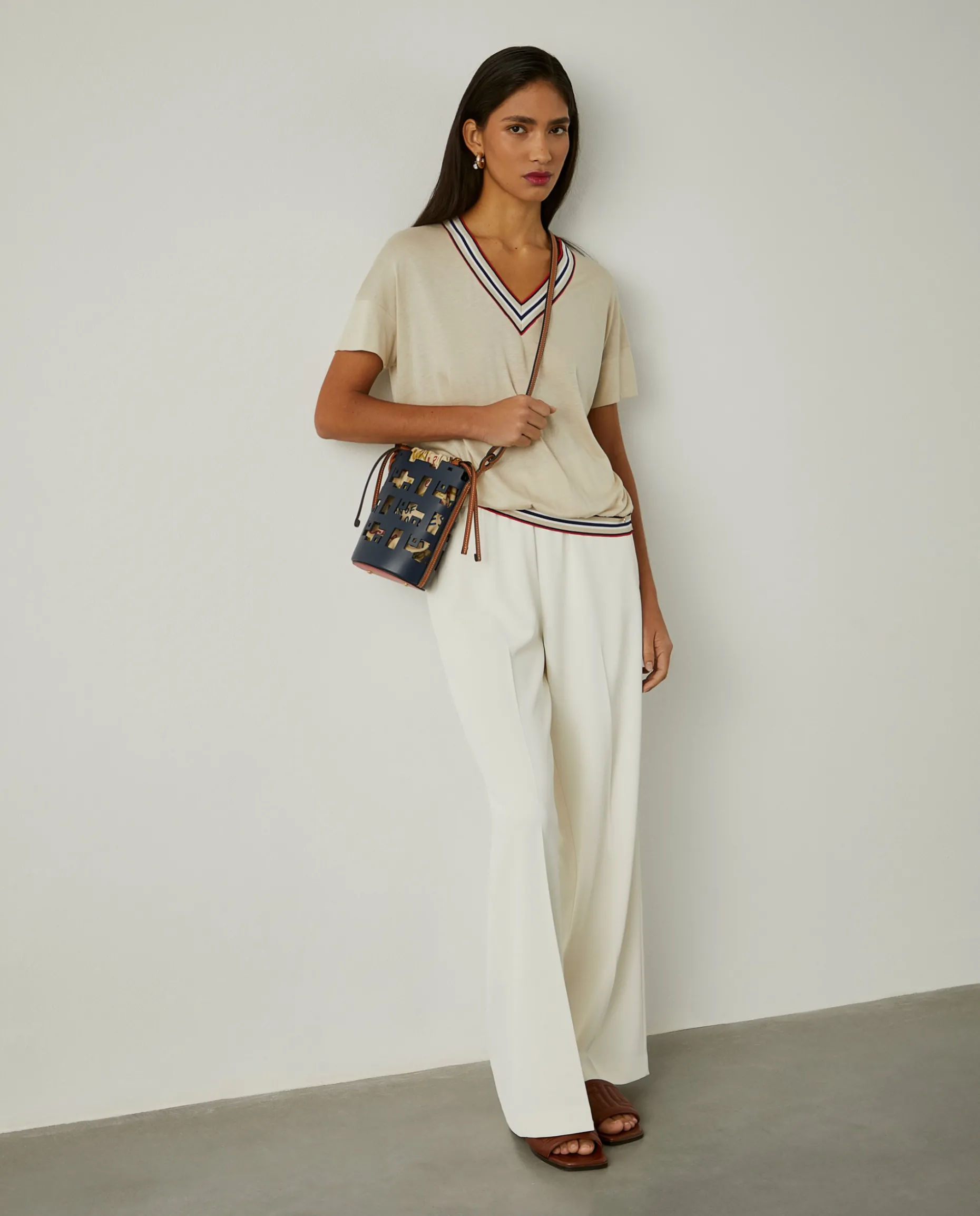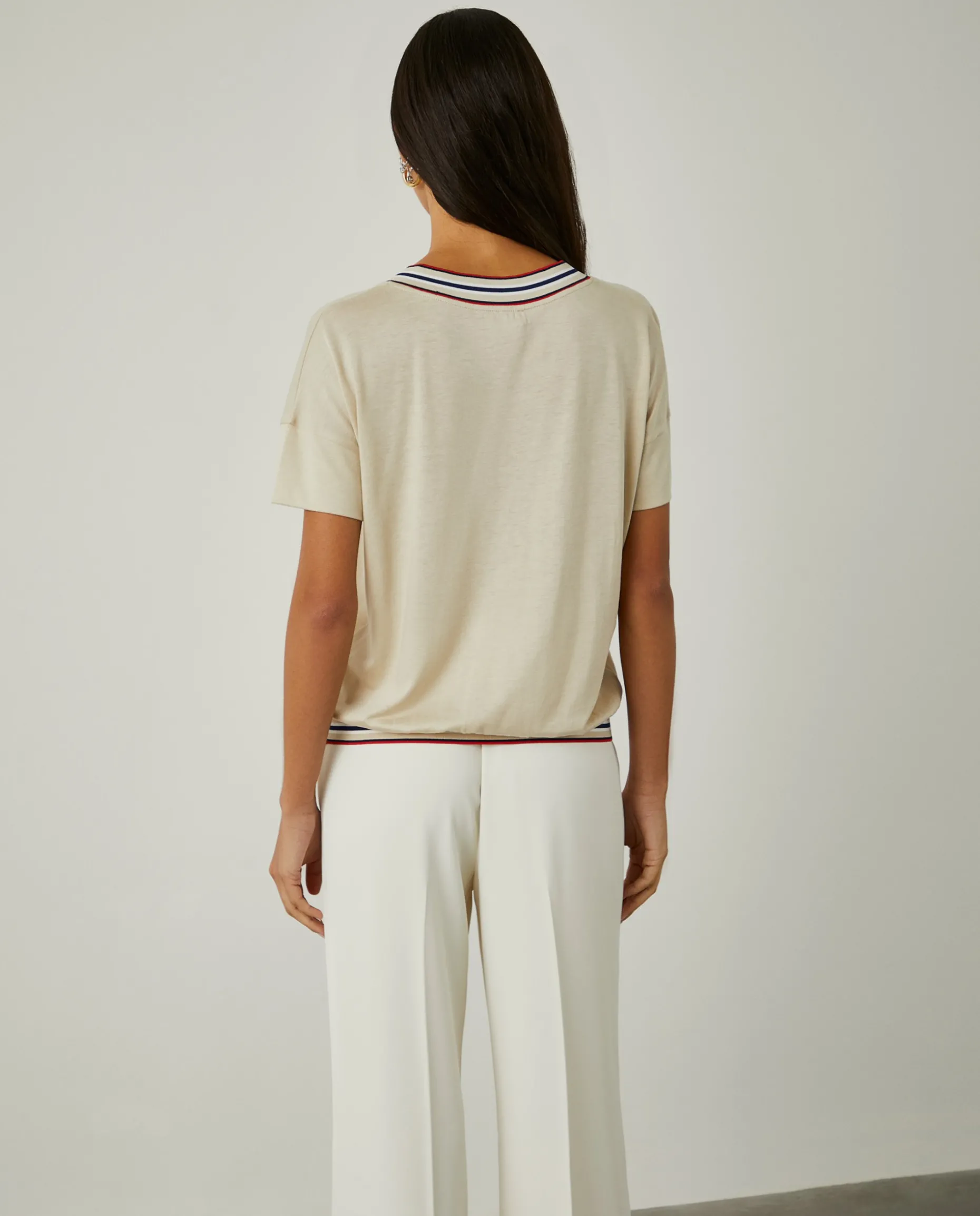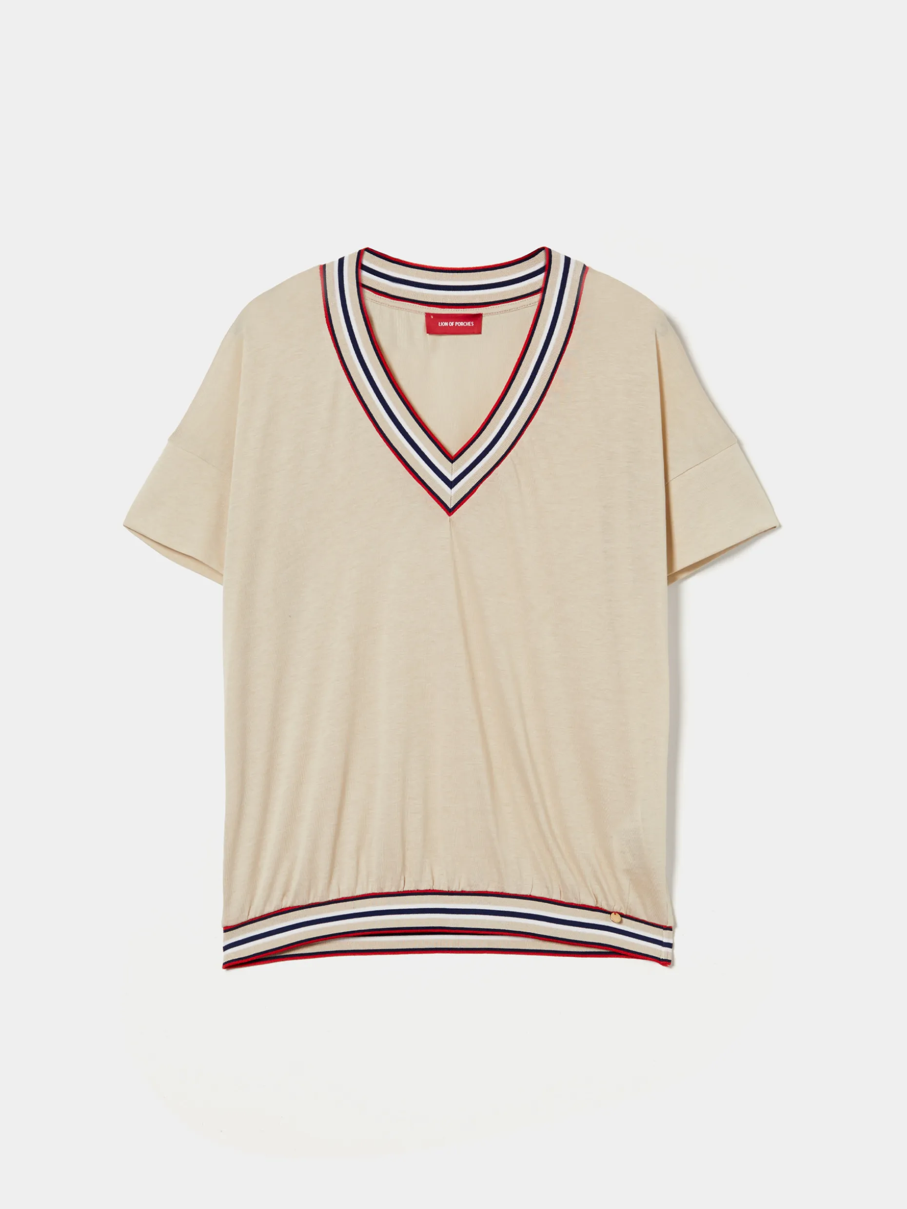 Para um look leve e descontraído, opte por esta t-shirt de manga curta com decote em V. Pormenor diferenciador de base e decote canelados com riscas em contraste. Disponível em várias cores.