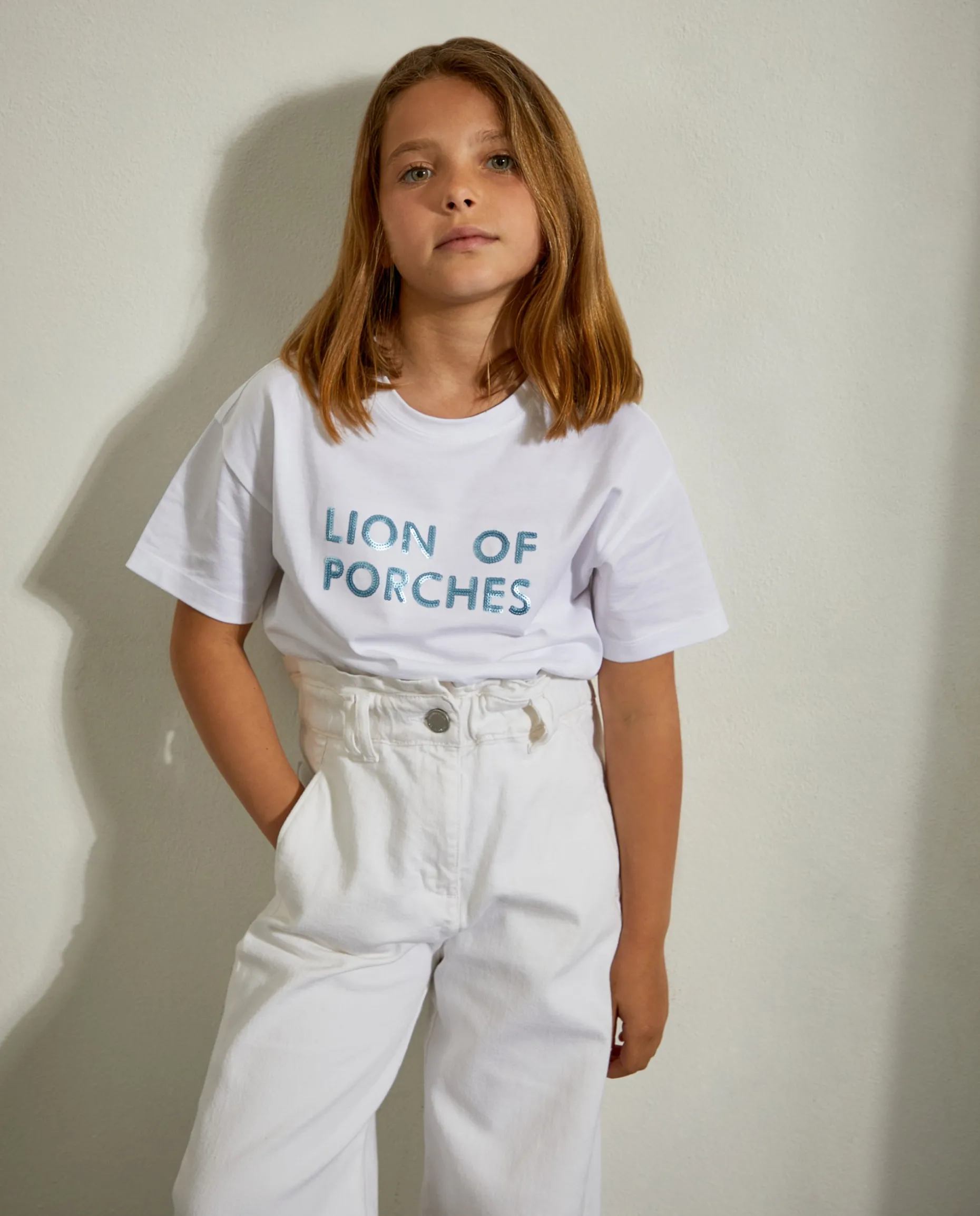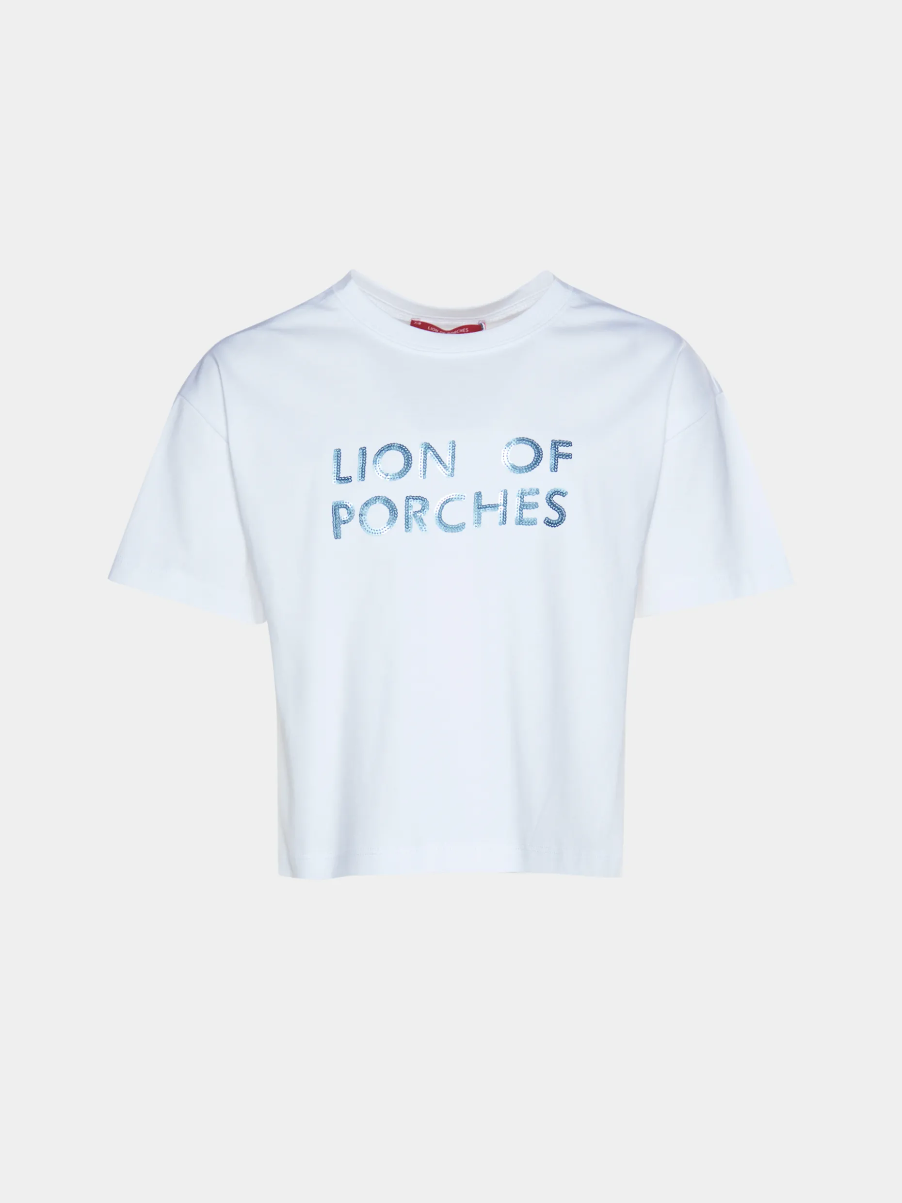 T-shirt oversize de manga curta com estampado Lion of Porches em lantejoulas na frente em contraste.