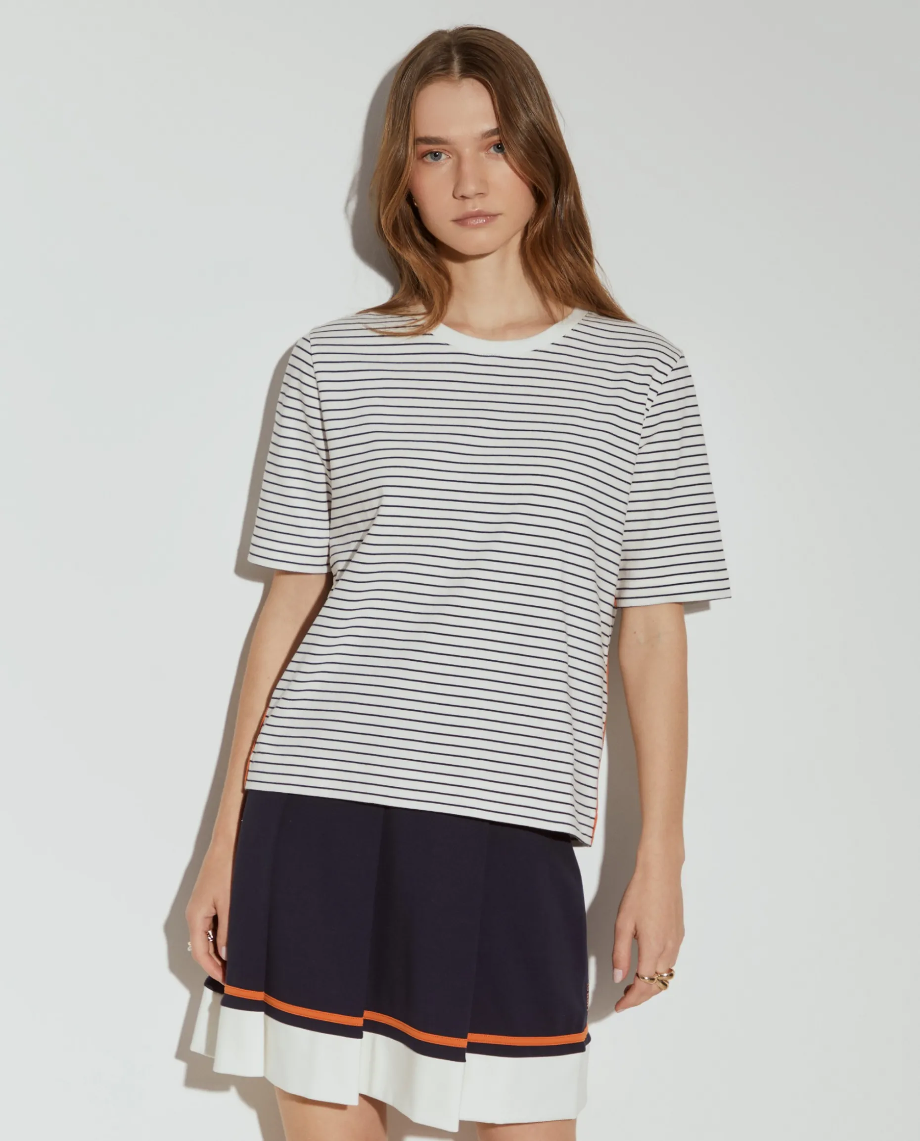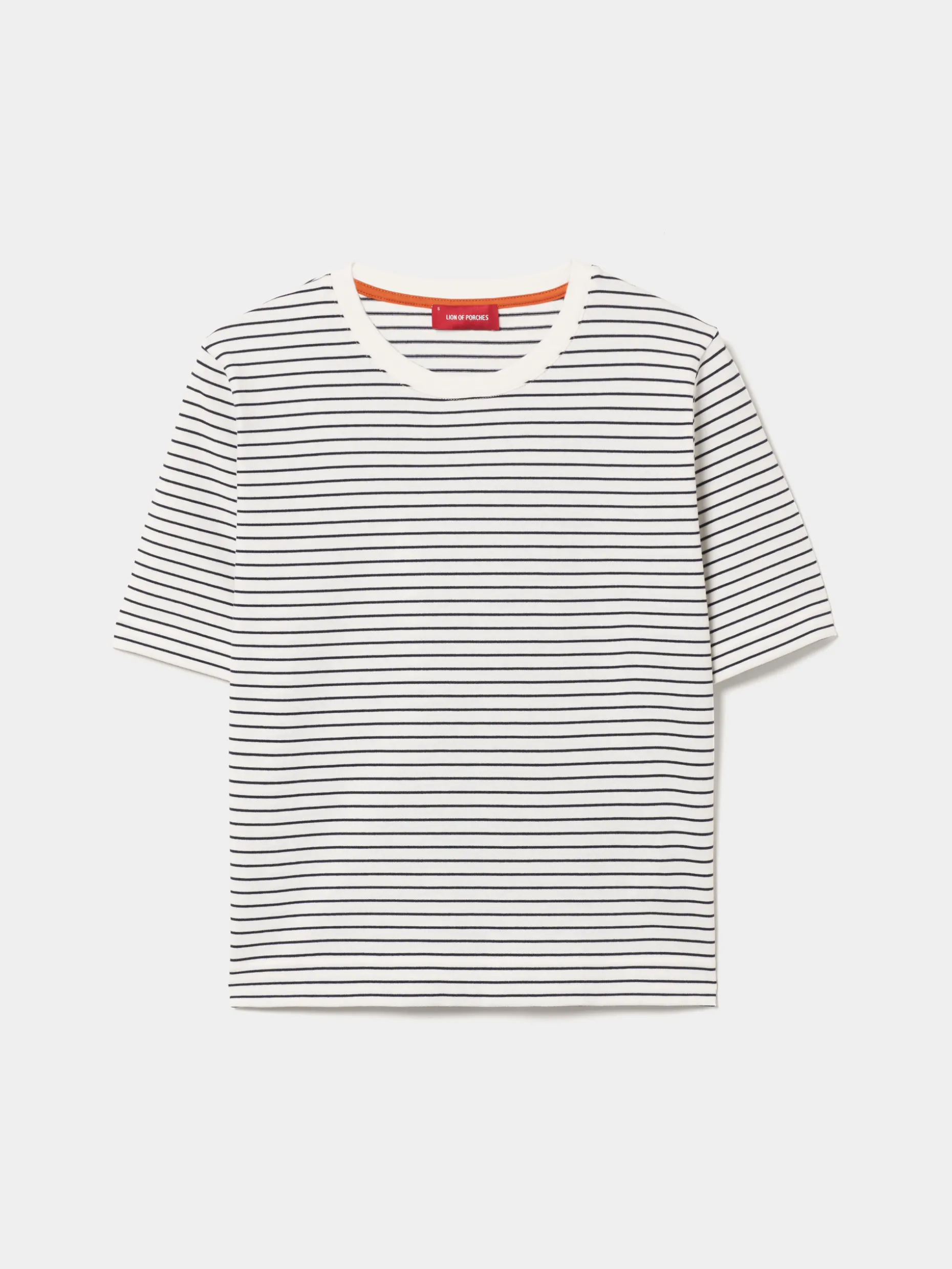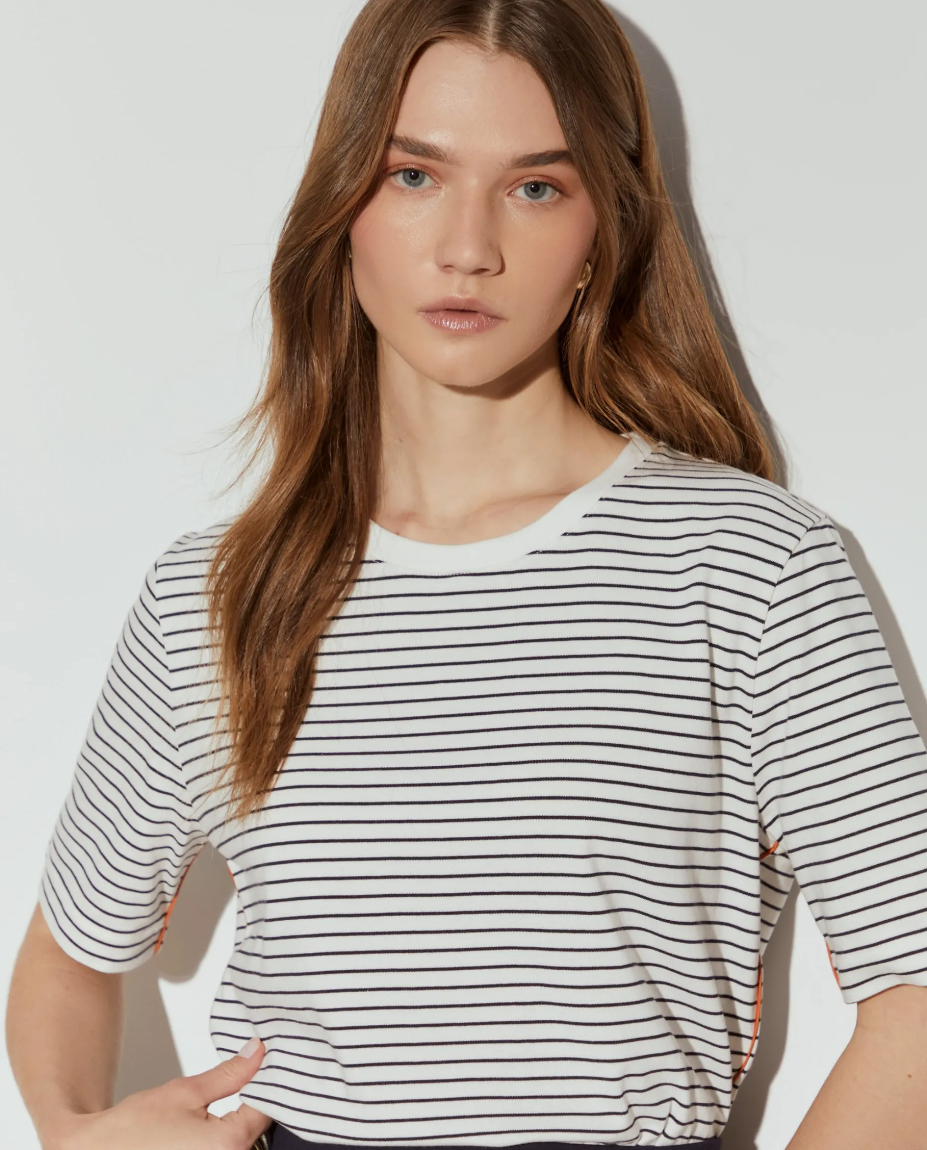 T-shirt de manga curta com padrão de riscas horizontais. Pormenor de costura em contraste nas laterais e estampado da marca, também na lateral. Gola redonda.
