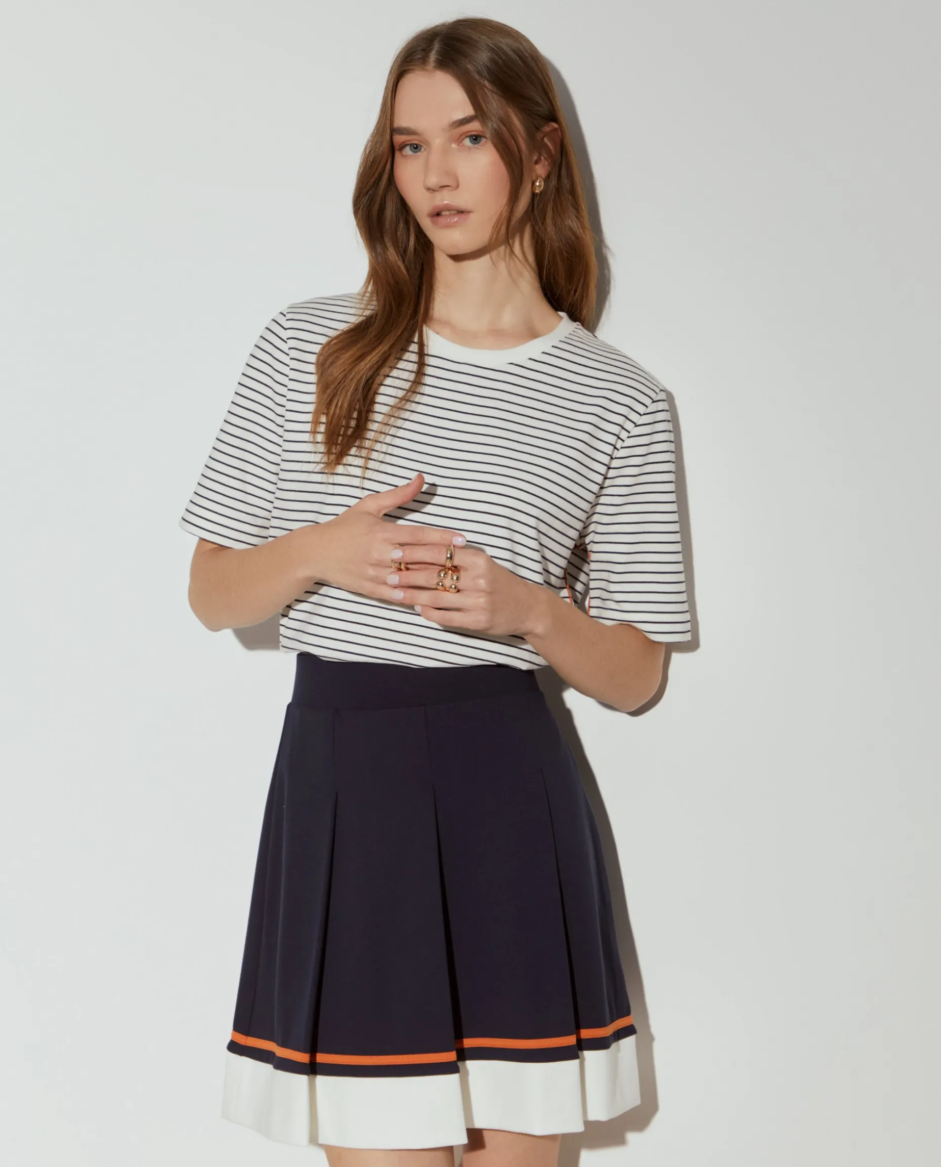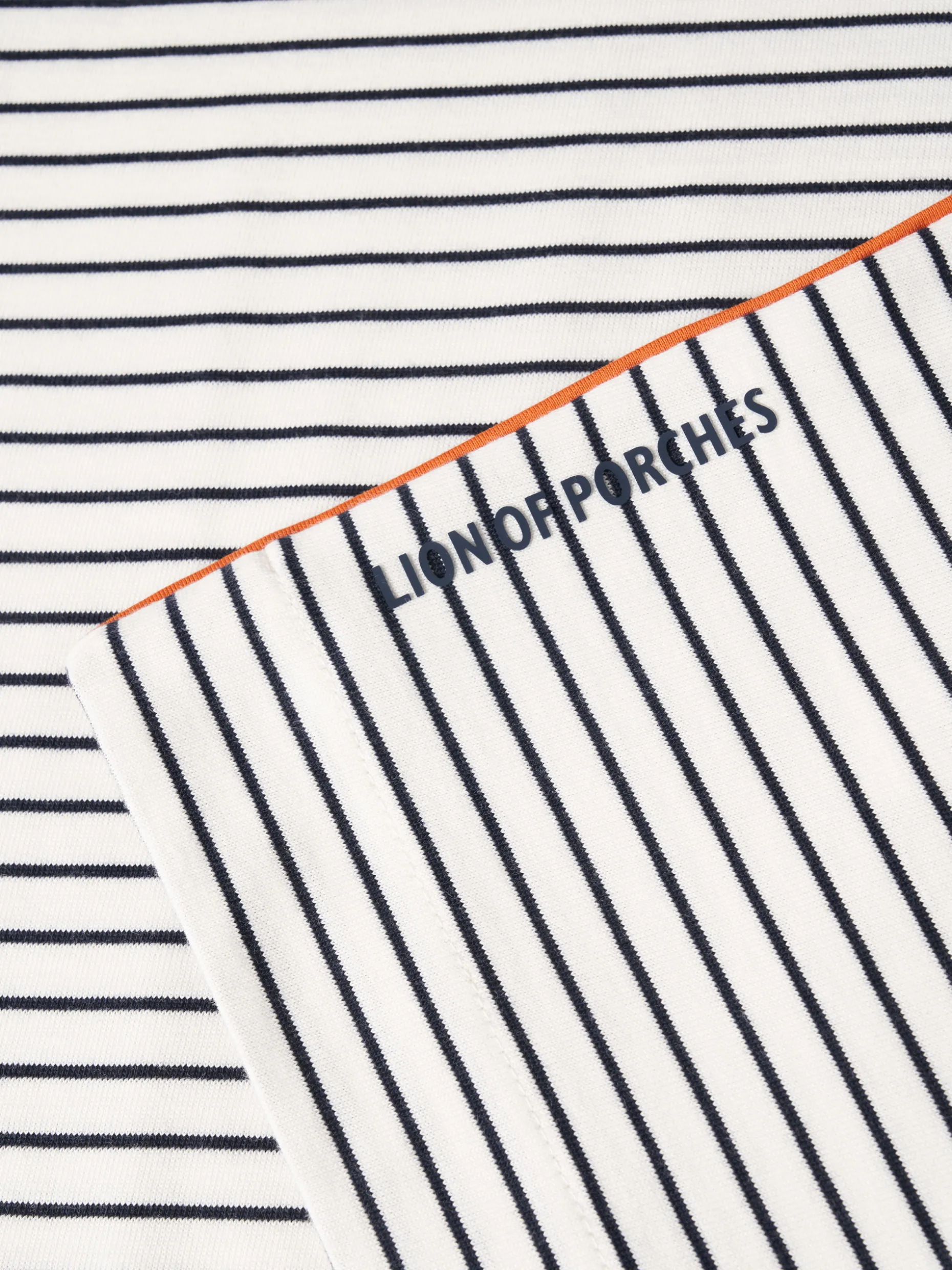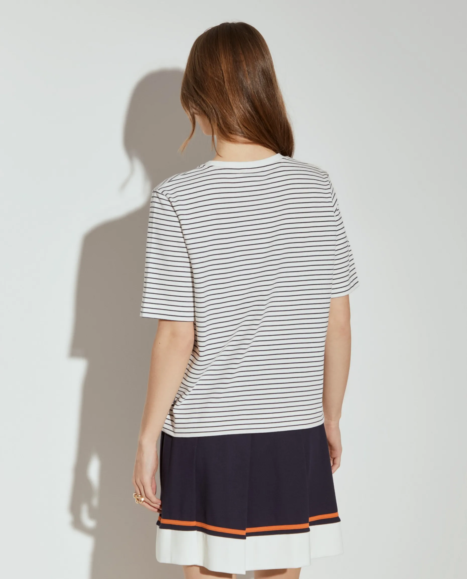 T-shirt de manga curta com padrão de riscas horizontais. Pormenor de costura em contraste nas laterais e estampado da marca, também na lateral. Gola redonda.