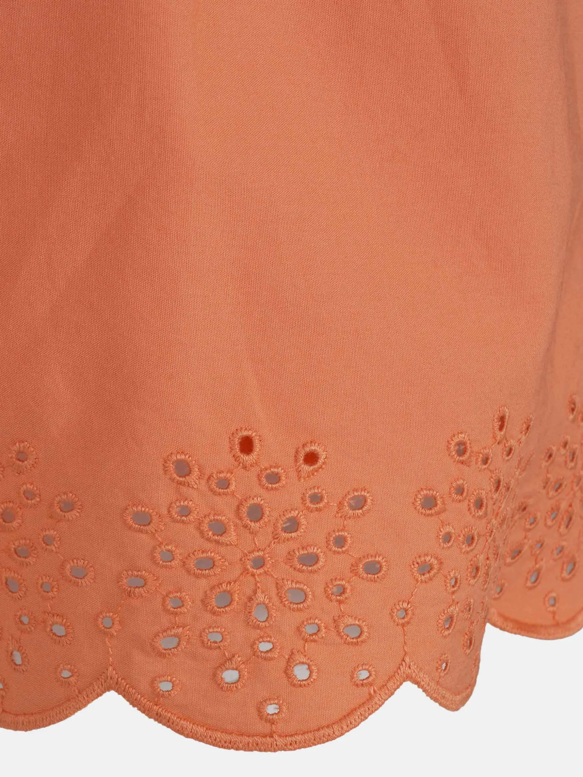 Top de alças curto com bordado inglês. Detalhe da fita de riscas com placa redonda personalizada atrás na costa.