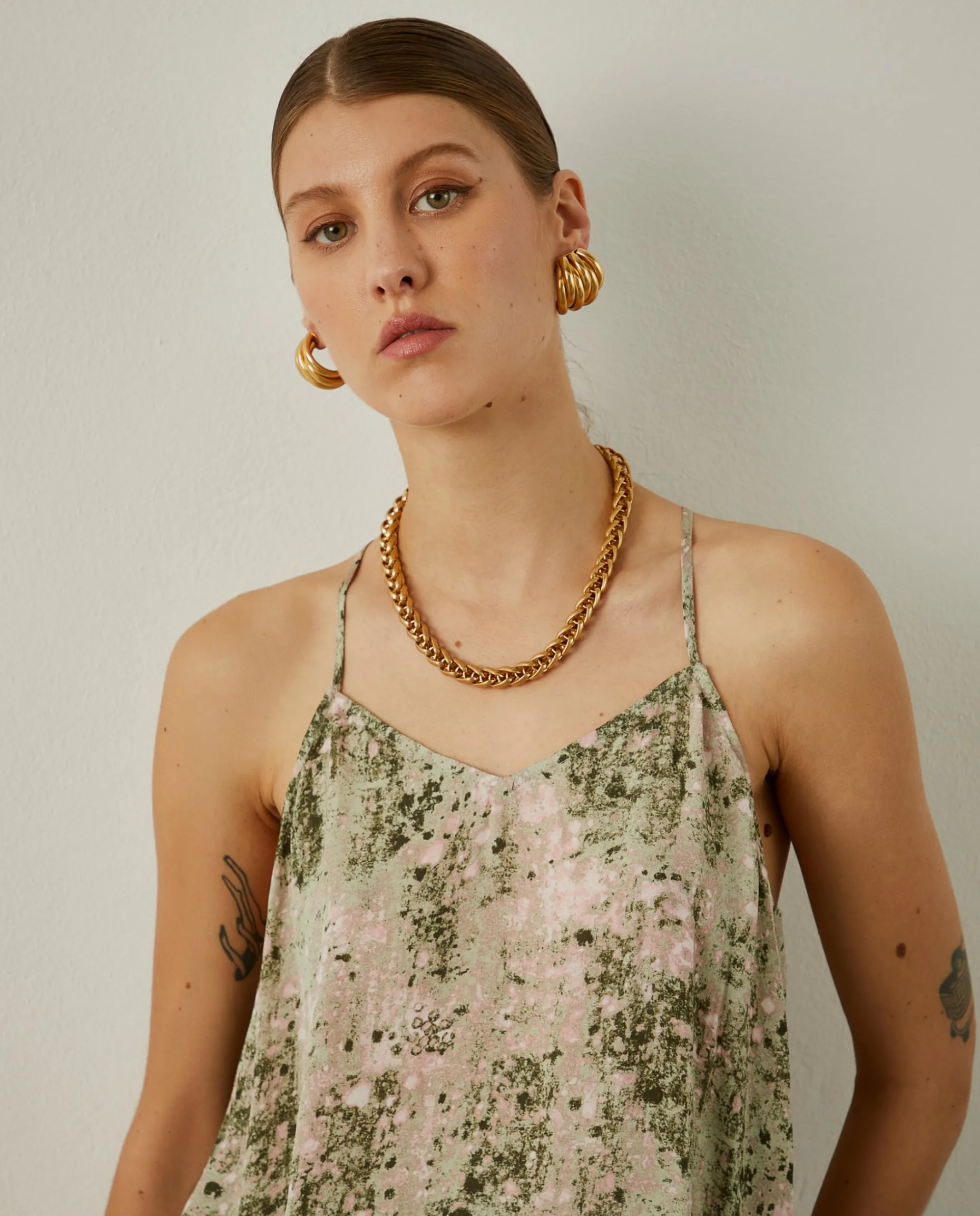 Para um look diferenciador e com muita personalidade, propomos este top fluido, de alças finas, com padrão abstrato colorido. Para um outfit completo, veja também as calças e a camisa da mesma coleção.