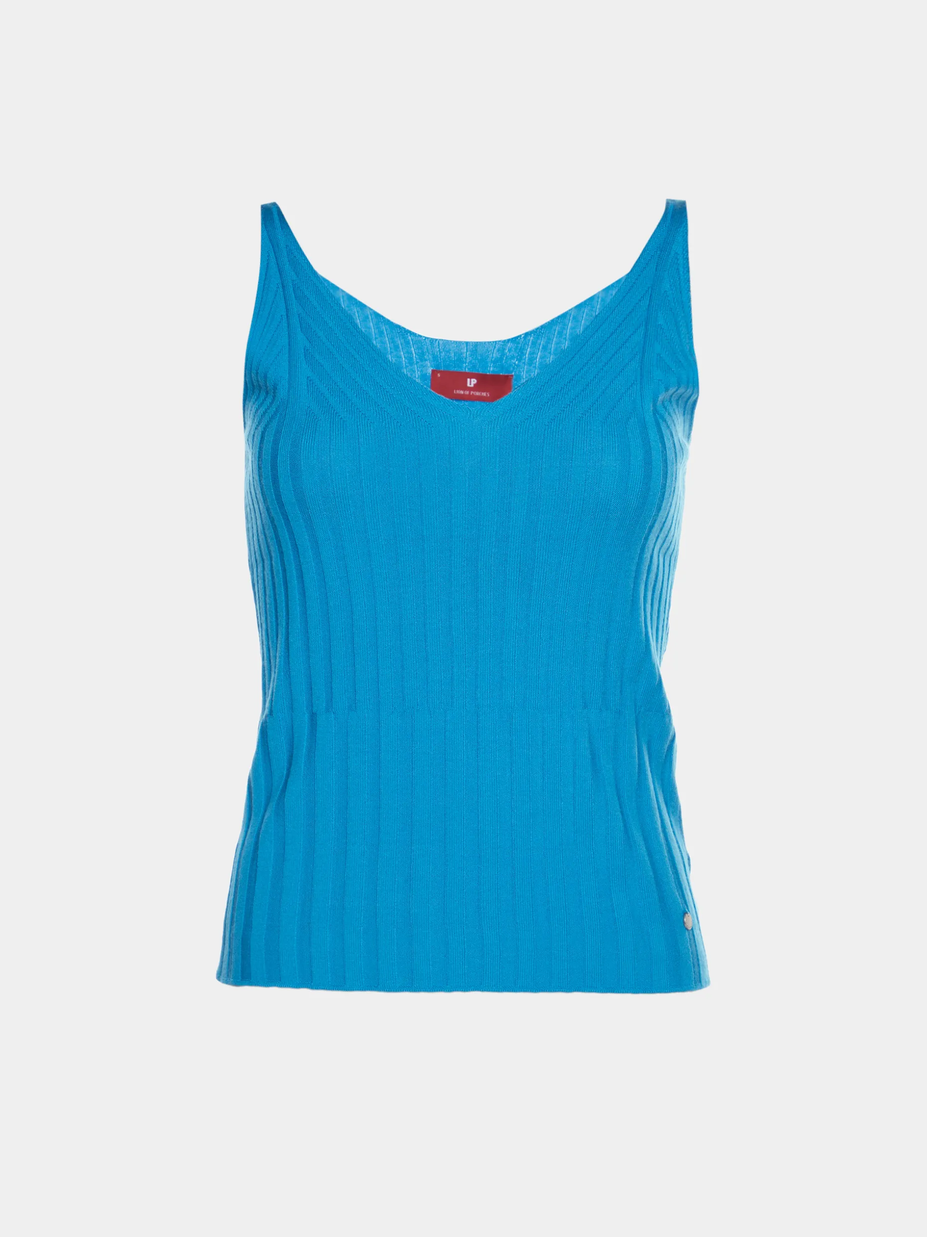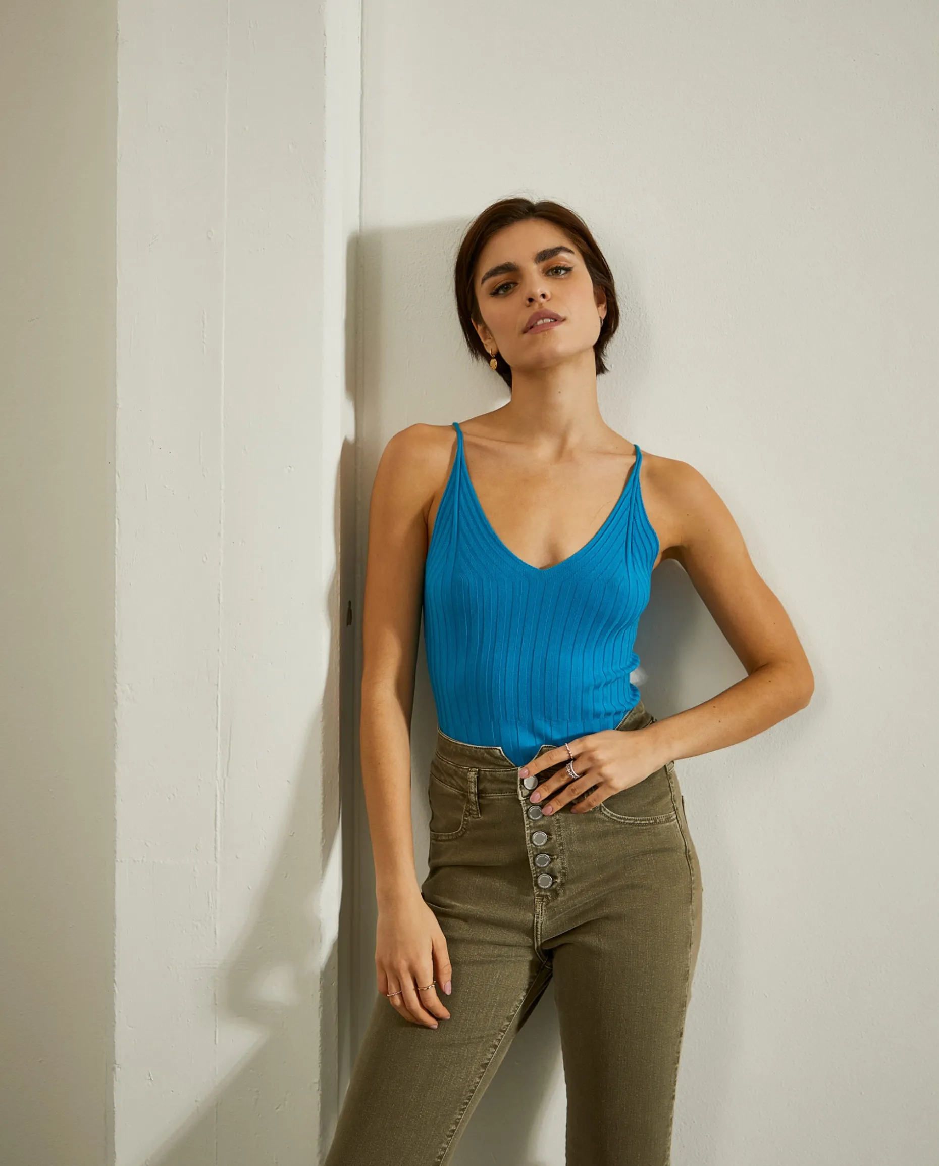 Top singlet de malha canelada. Alça fina e decote em V. Possibilidade de combinar com camisola e cardigan.