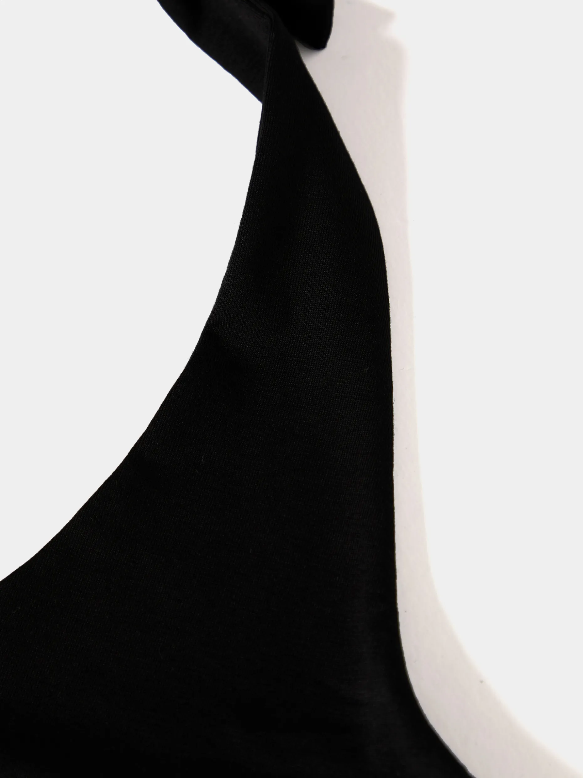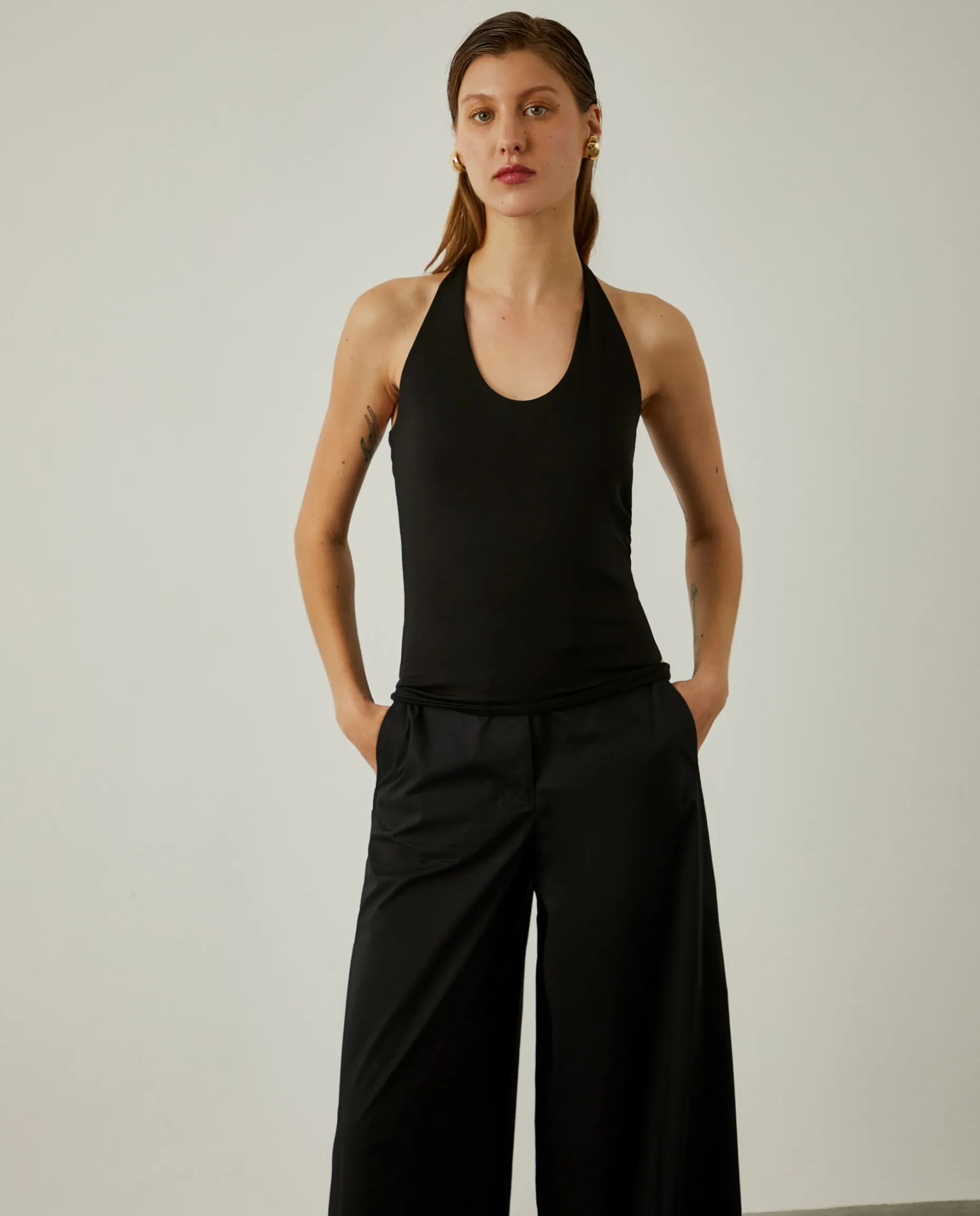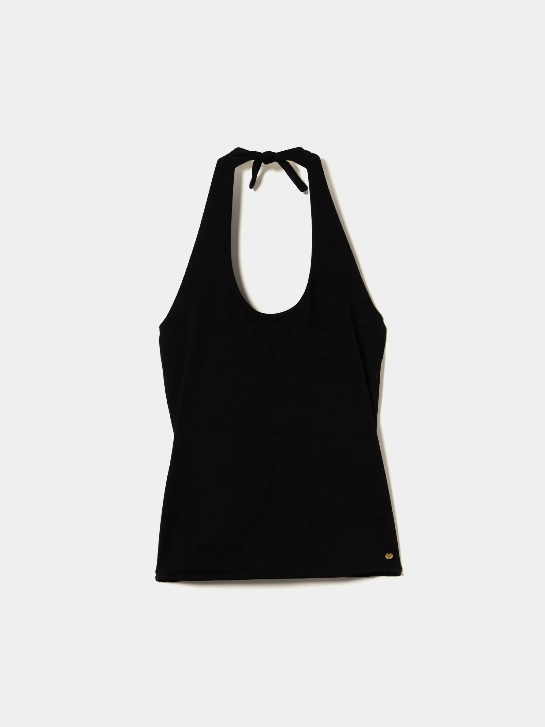 Top halter de malha com decote redondo. De costas abertas, aperta na parte de trás do pescoço. Finaliza com pequena placa redonda da marca na base.