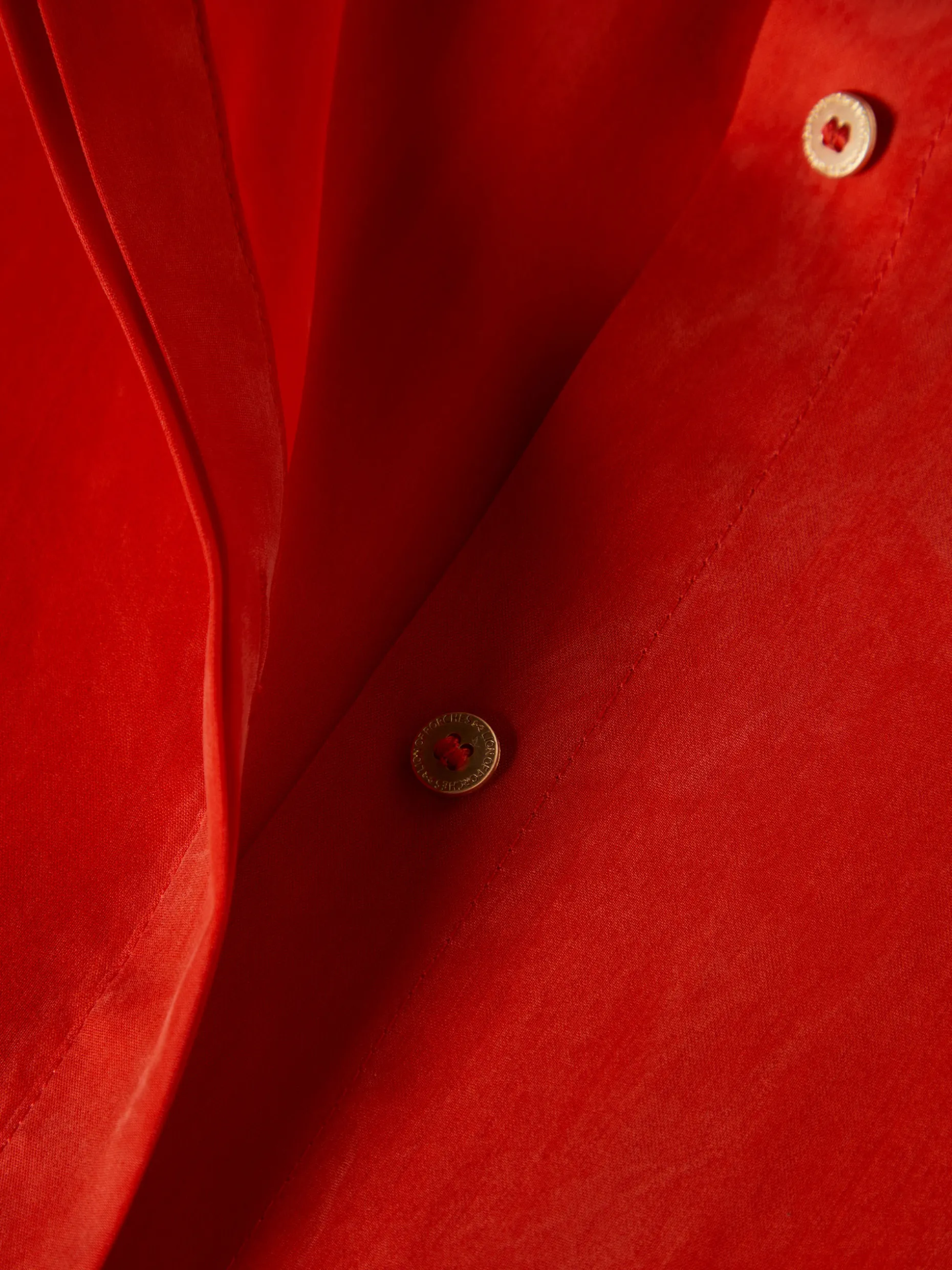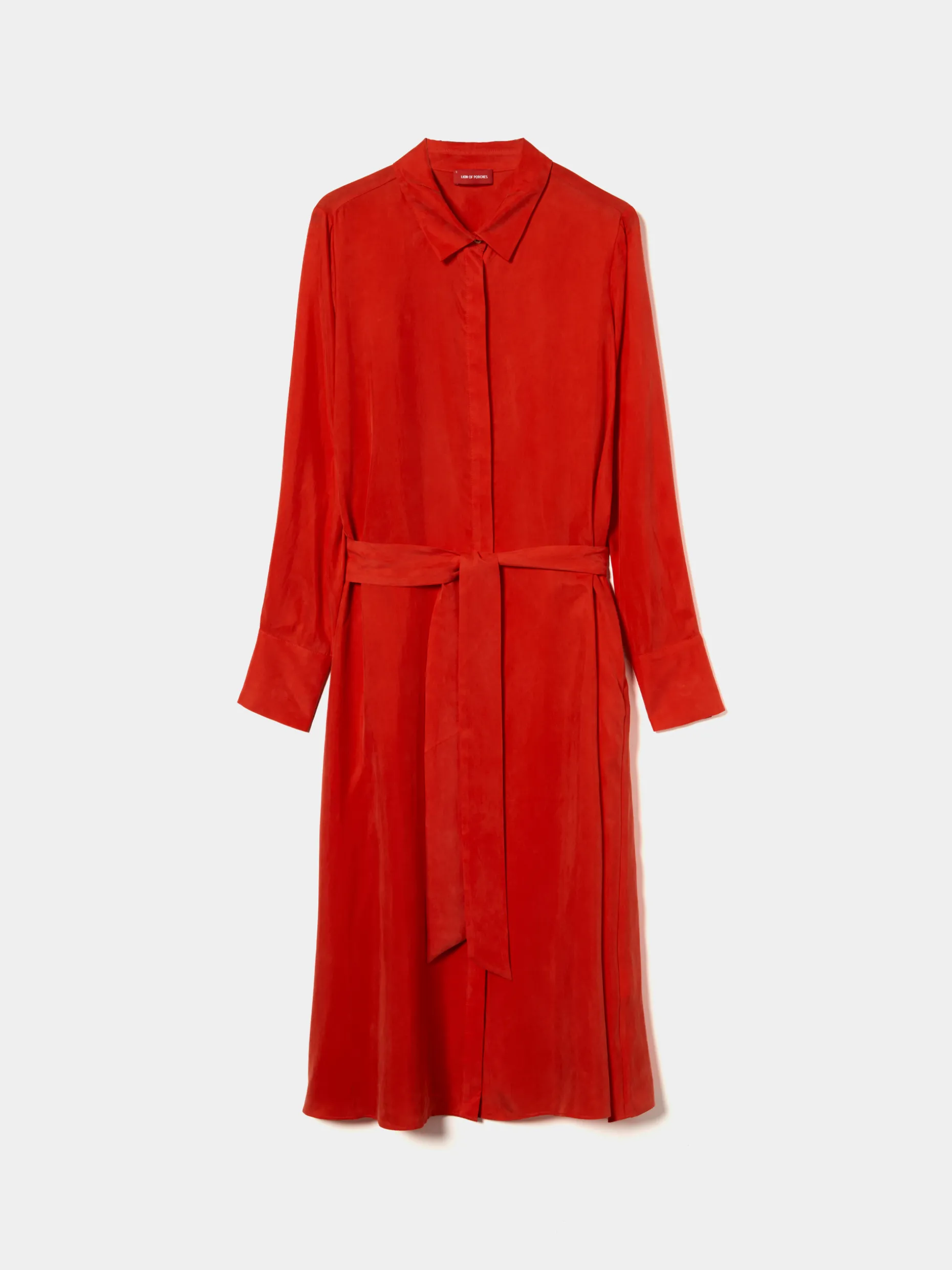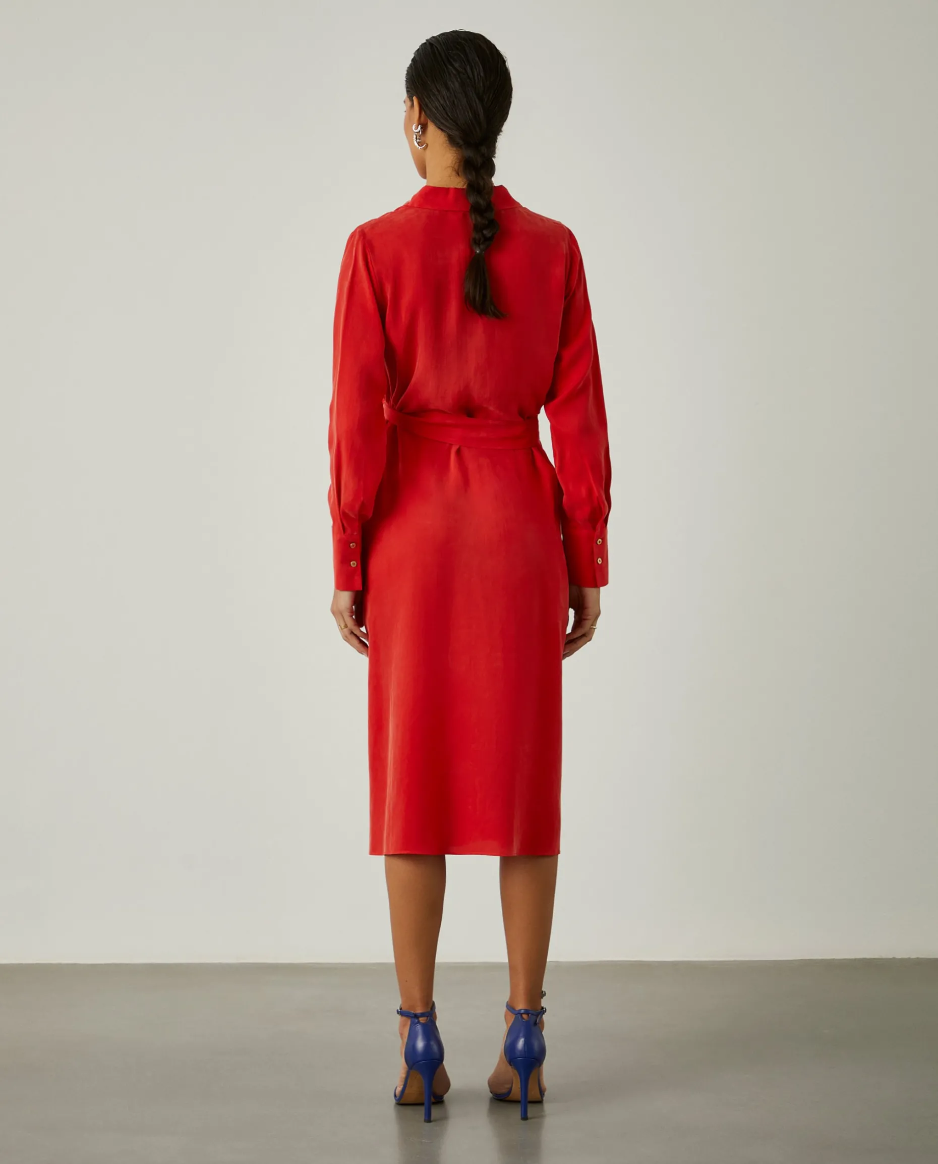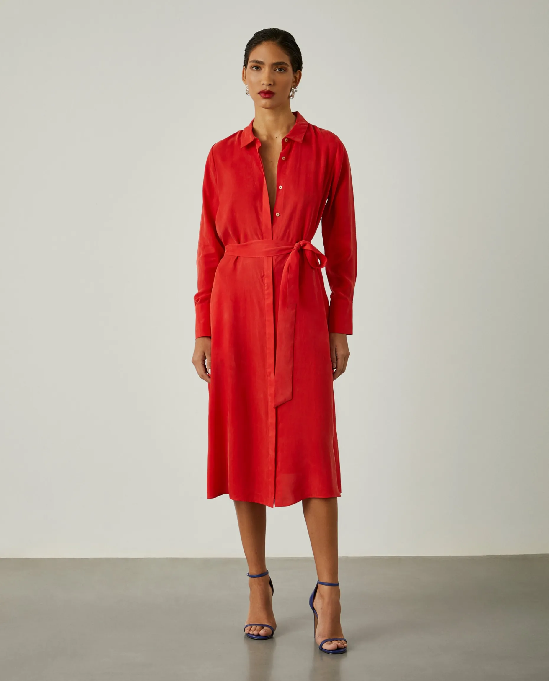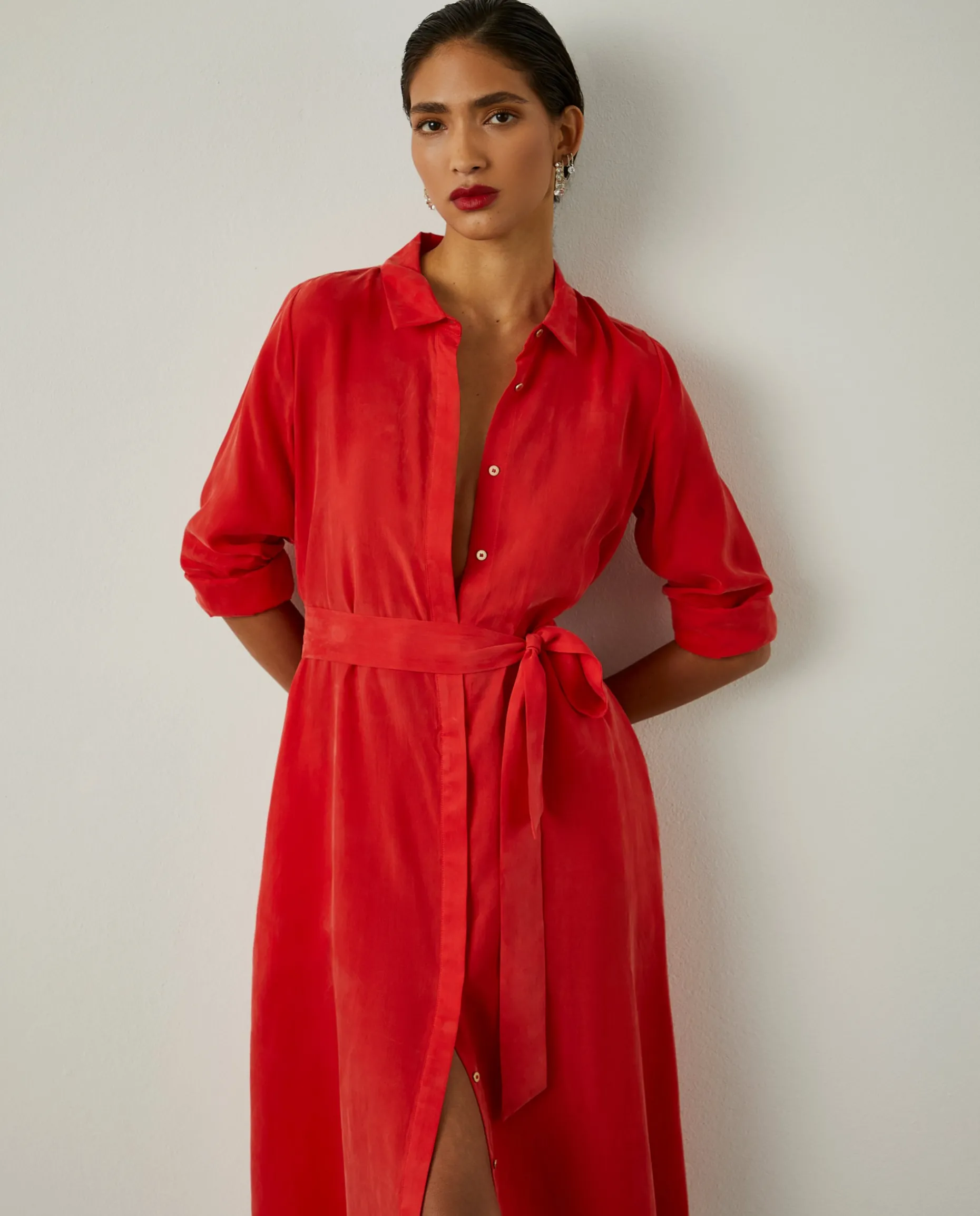 Vestido comprido, estilo camiseiro, de toque suave e aveludado. Uma escolha prática, versátil e elegante, consoante os acessórios. Aperta na frente com botões ocultos por carcela e finaliza com cinto no mesmo tecido e tom para ajustar a gosto. Confecionado, na totalidade, com cupro, um material leve, macio, eco-friendly e sustentável.