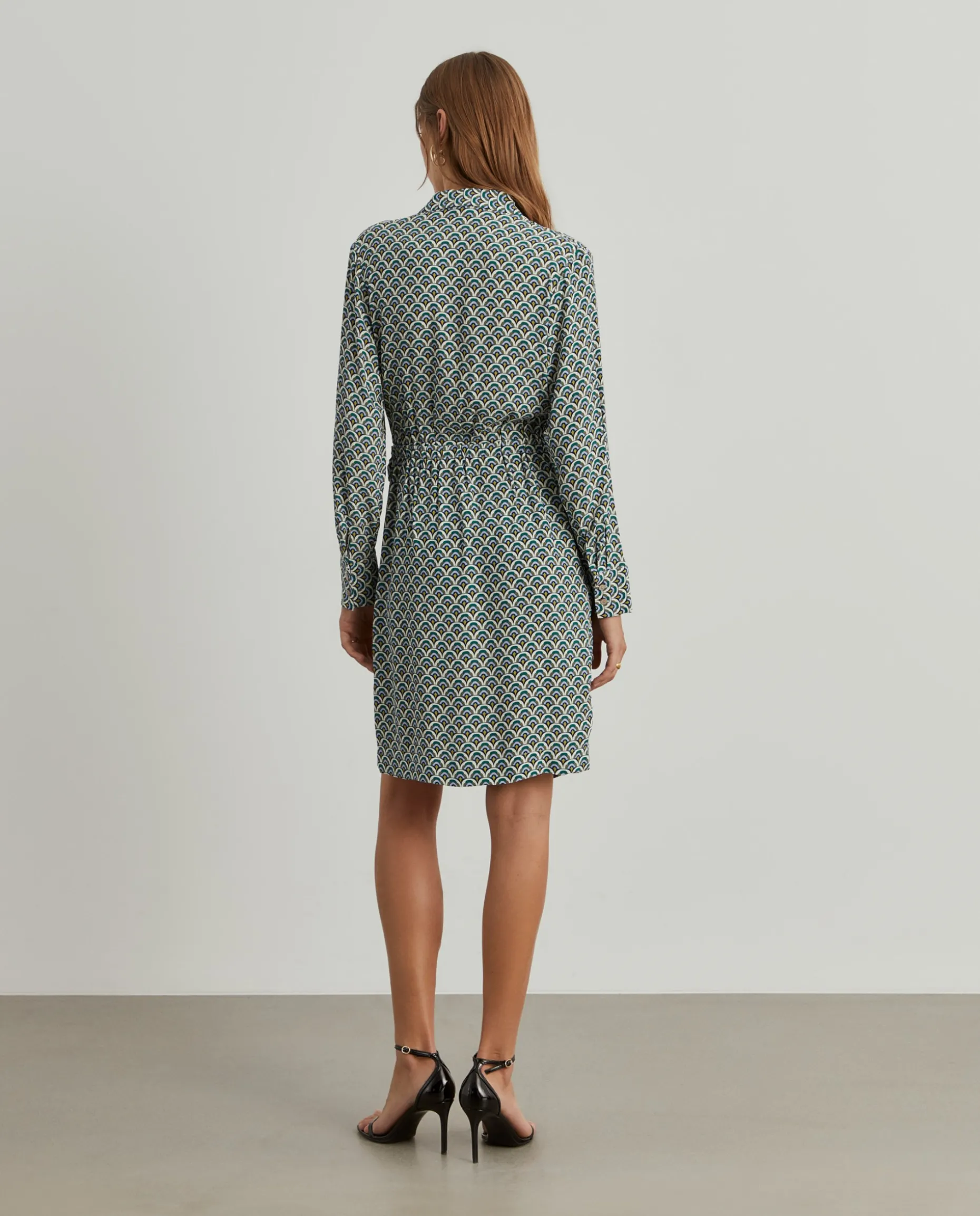 Marque o seu estilo com este vestido camiseiro curto com laçada à frente. Tecido com padrão geométrico. Punhos compridos a apertar com dois botões.