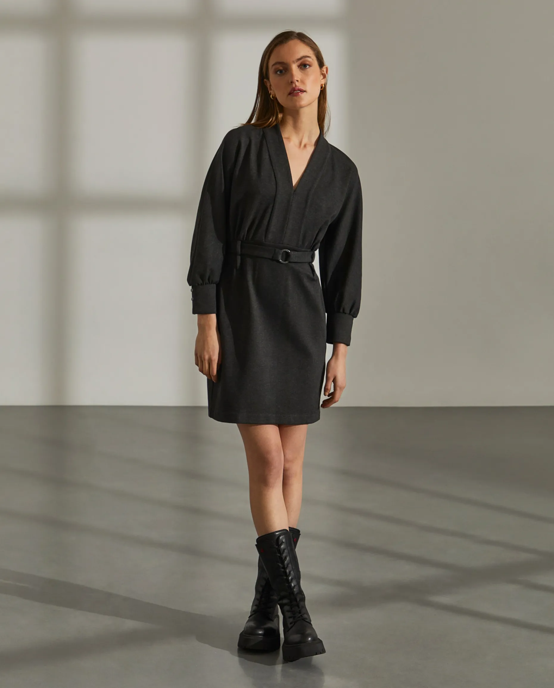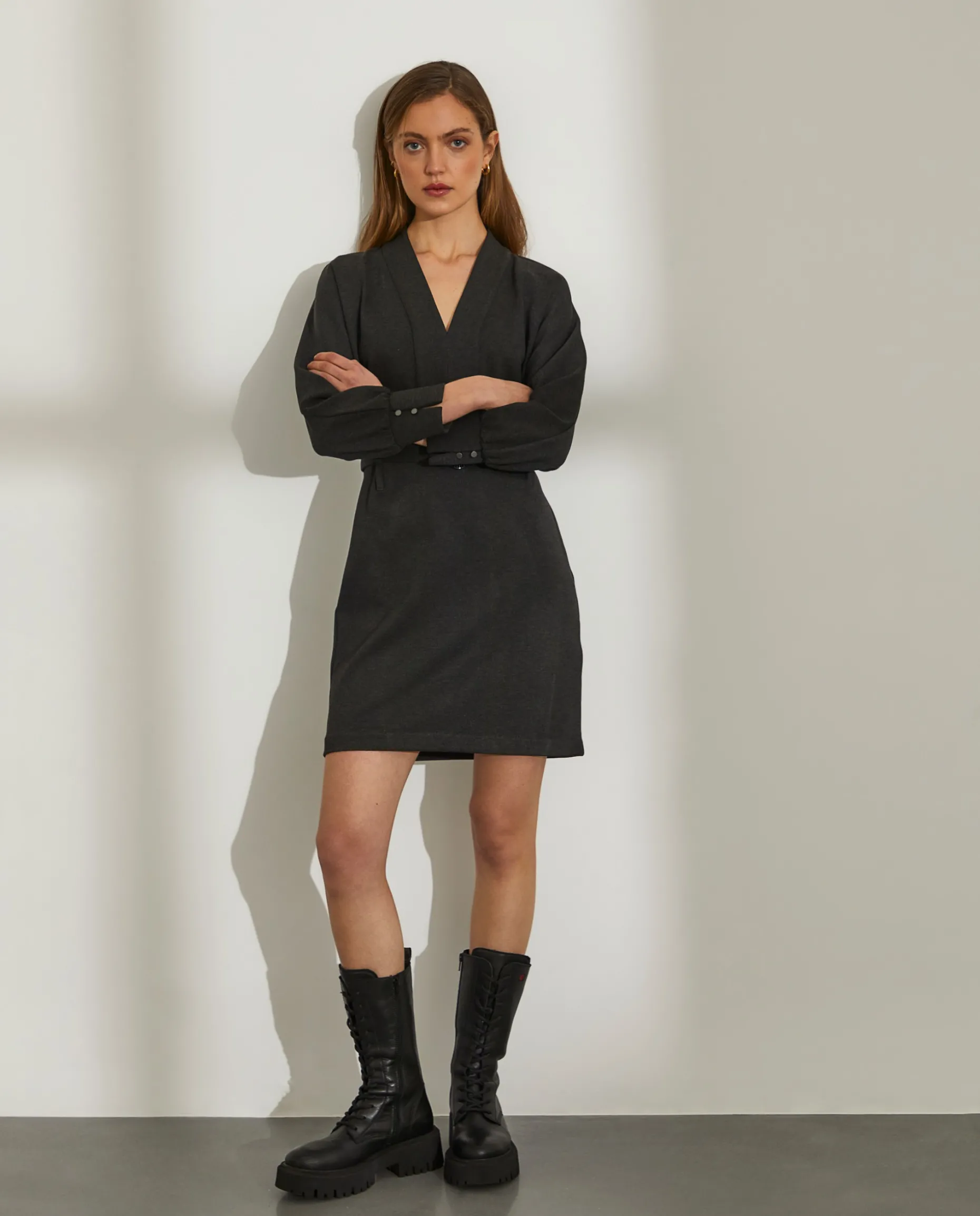 Esteja sempre elegante com este vestido curto com decote em V. Conta com um cinto amovível e presilhas e um franzido junto aos punhos para uma silhueta sofisticada.