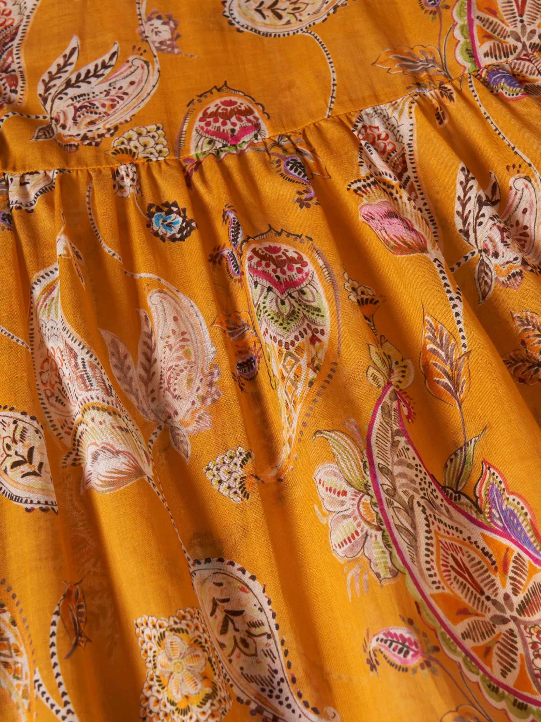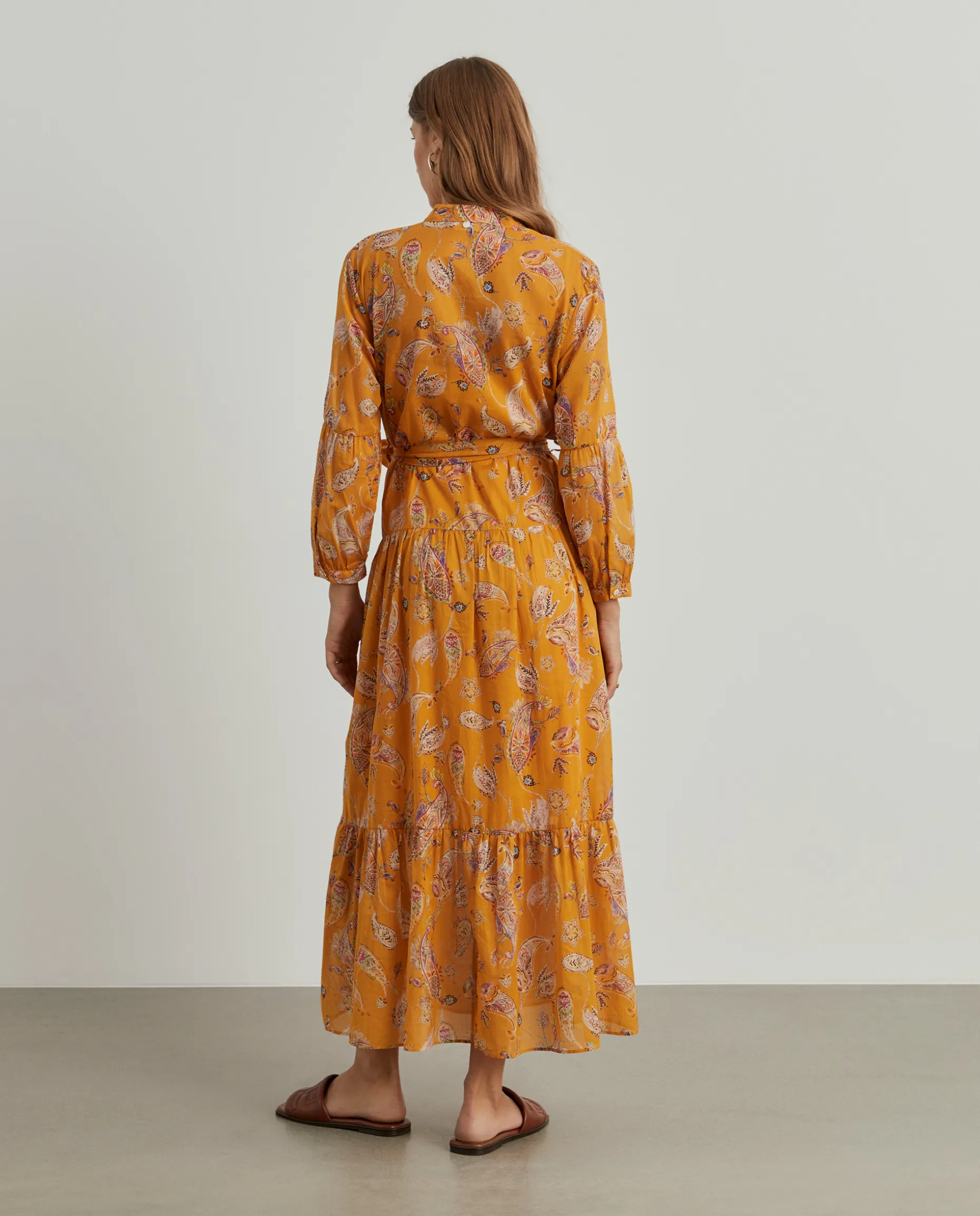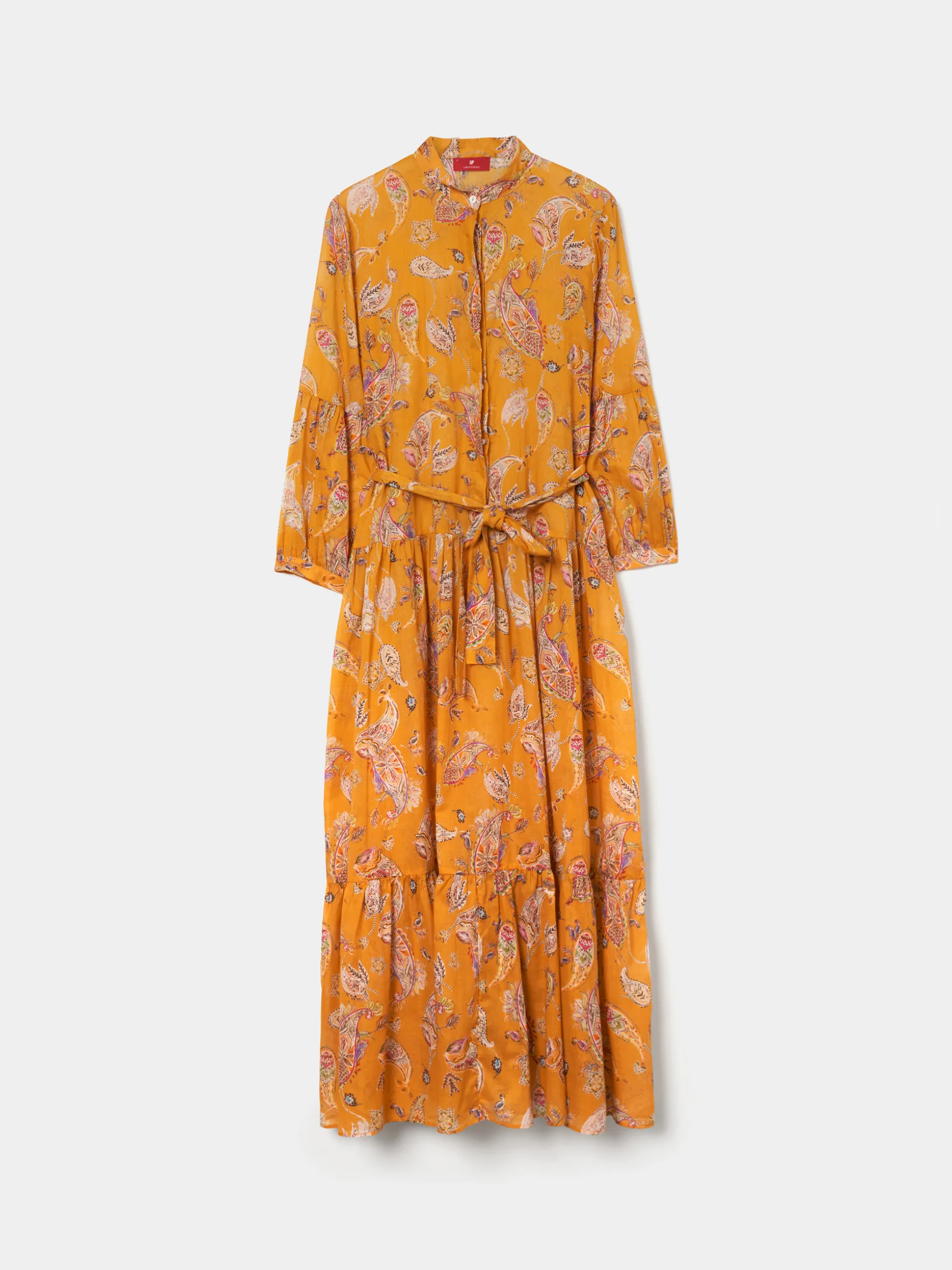Vestido linha A, maxi. Estampado de cornucópias. Gola mao. Abotoamento oculto por carcela. Manga comprida com franzido na linha do cotovelo através de corte e no punho. Presilhas e cinto no mesmo tecido a ajustar a cintura. Painéis horizontais com franzido. Combinação interior ao tom.