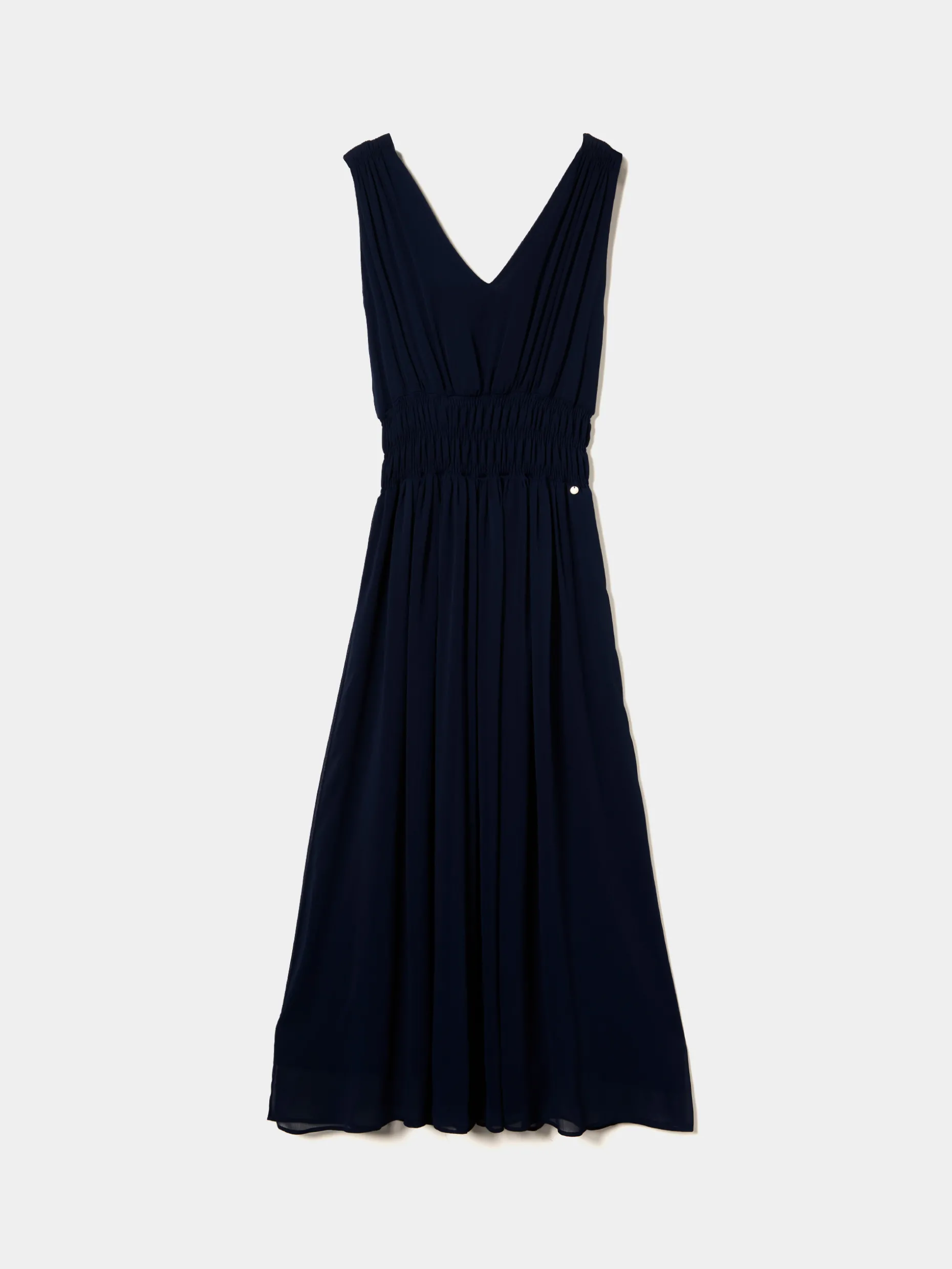 Vestido comprido plissado, sem alças, e de saia rodada. De decote em V na frente e costas, é franzido na cintura para uma silhueta mais elegante.