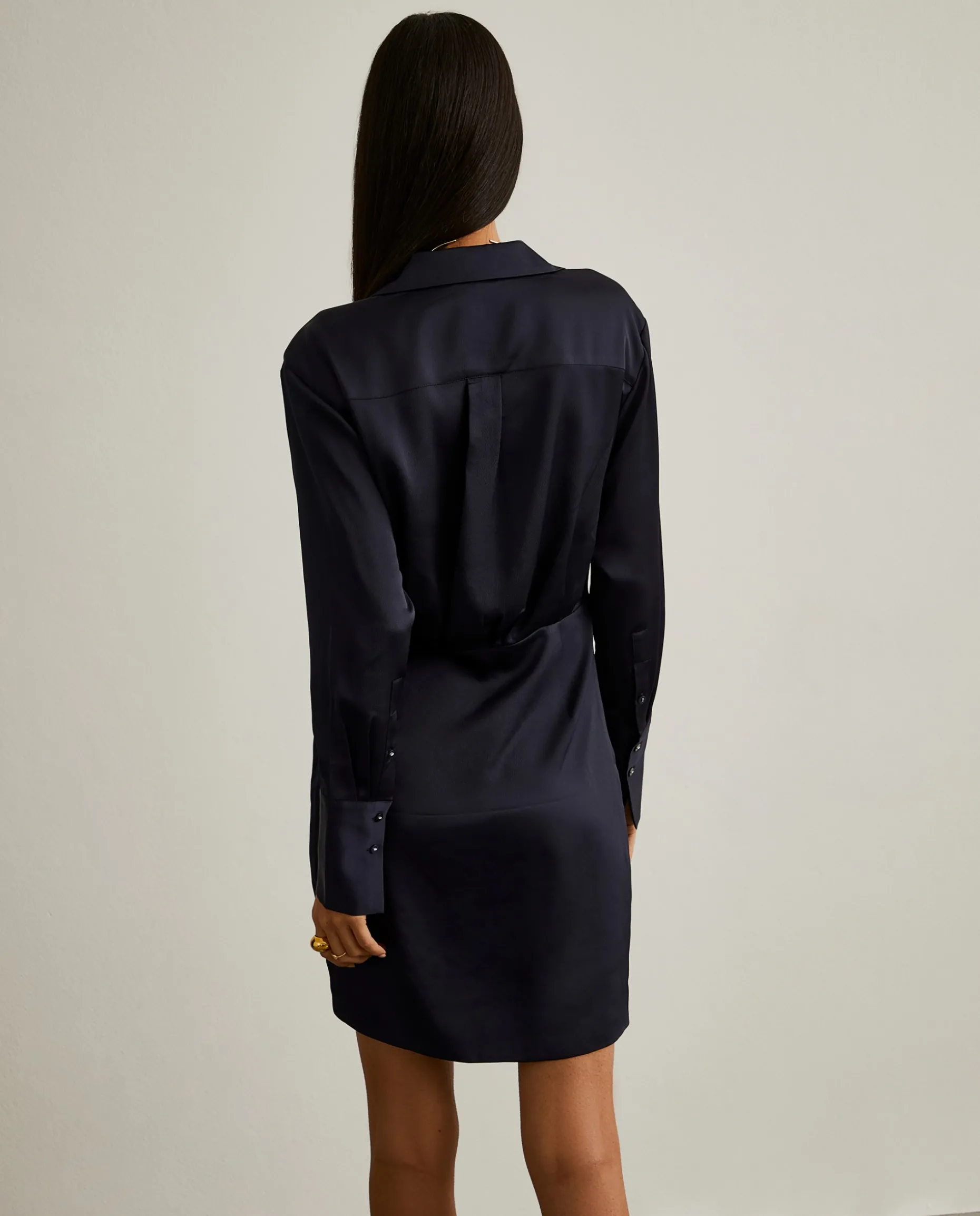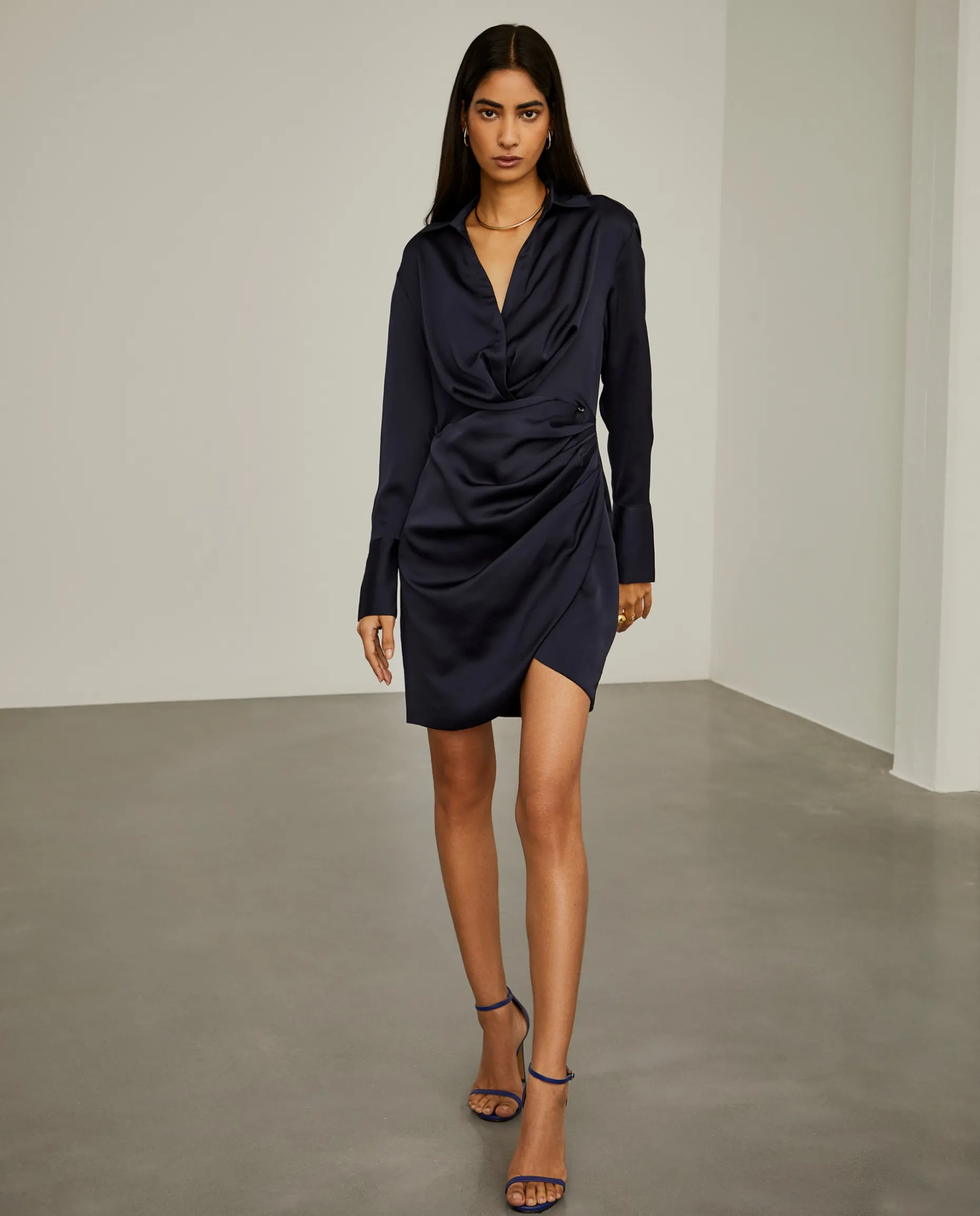 Vestido curto com decote em V. De manga comprida, tem o decote e a saia drapeados, conferindo à peça um toque mais elegante e sofisticado. A base é assimétrica.