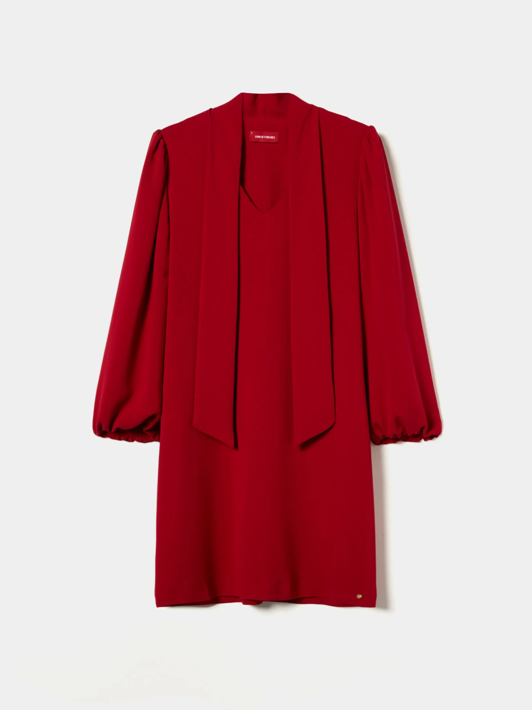 Revele toda a sua elegância com este vestido curto com decote em V e laçada no pescoço para um toque diferenciador. As mangas são abaloadas com franzido nos ombros e nos punhos.