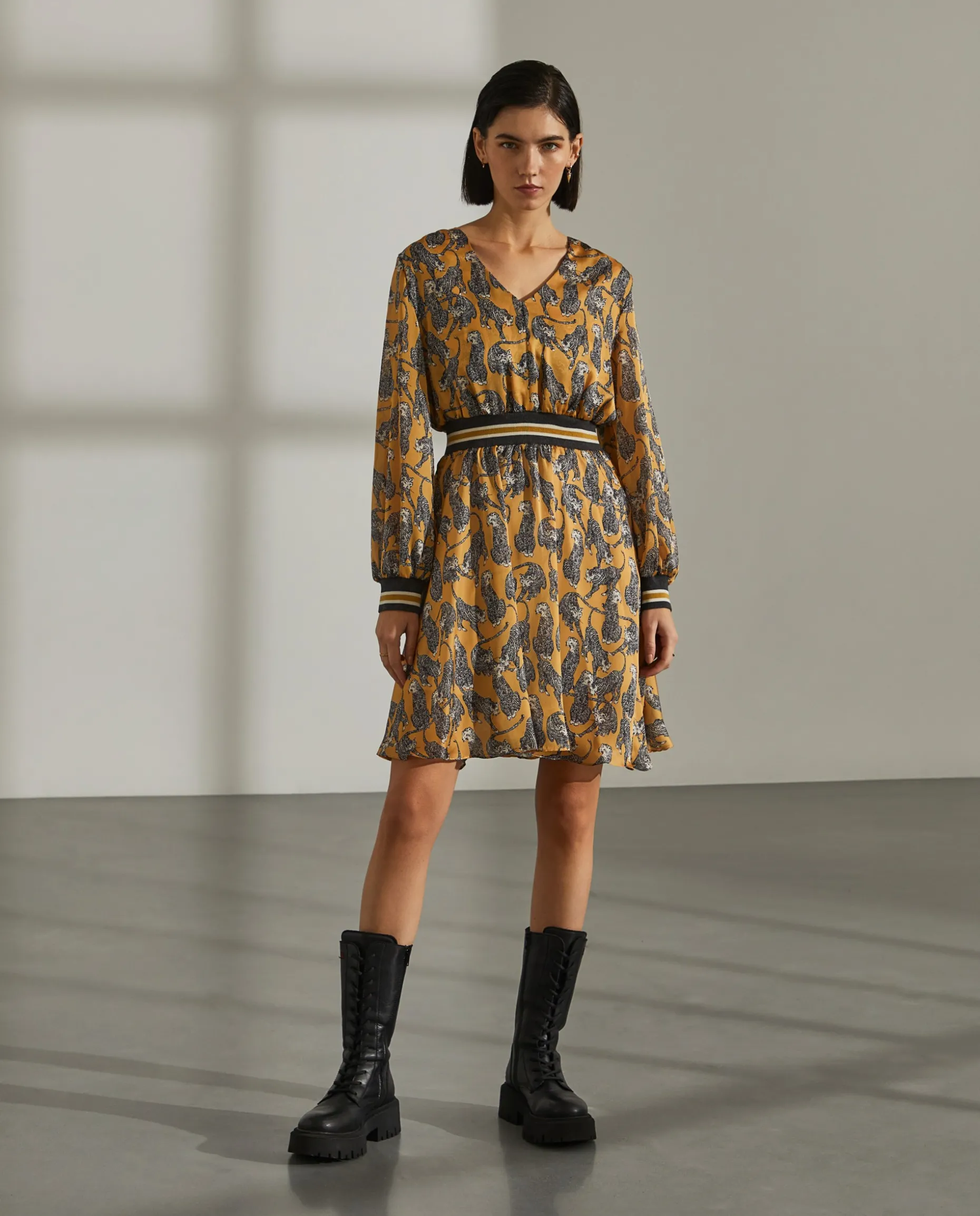 Vestido curto estampado com padrão animal confecionado com poliester reciclado. Decote em V. Punhos e cintura com malha de riscas. Forro interior.