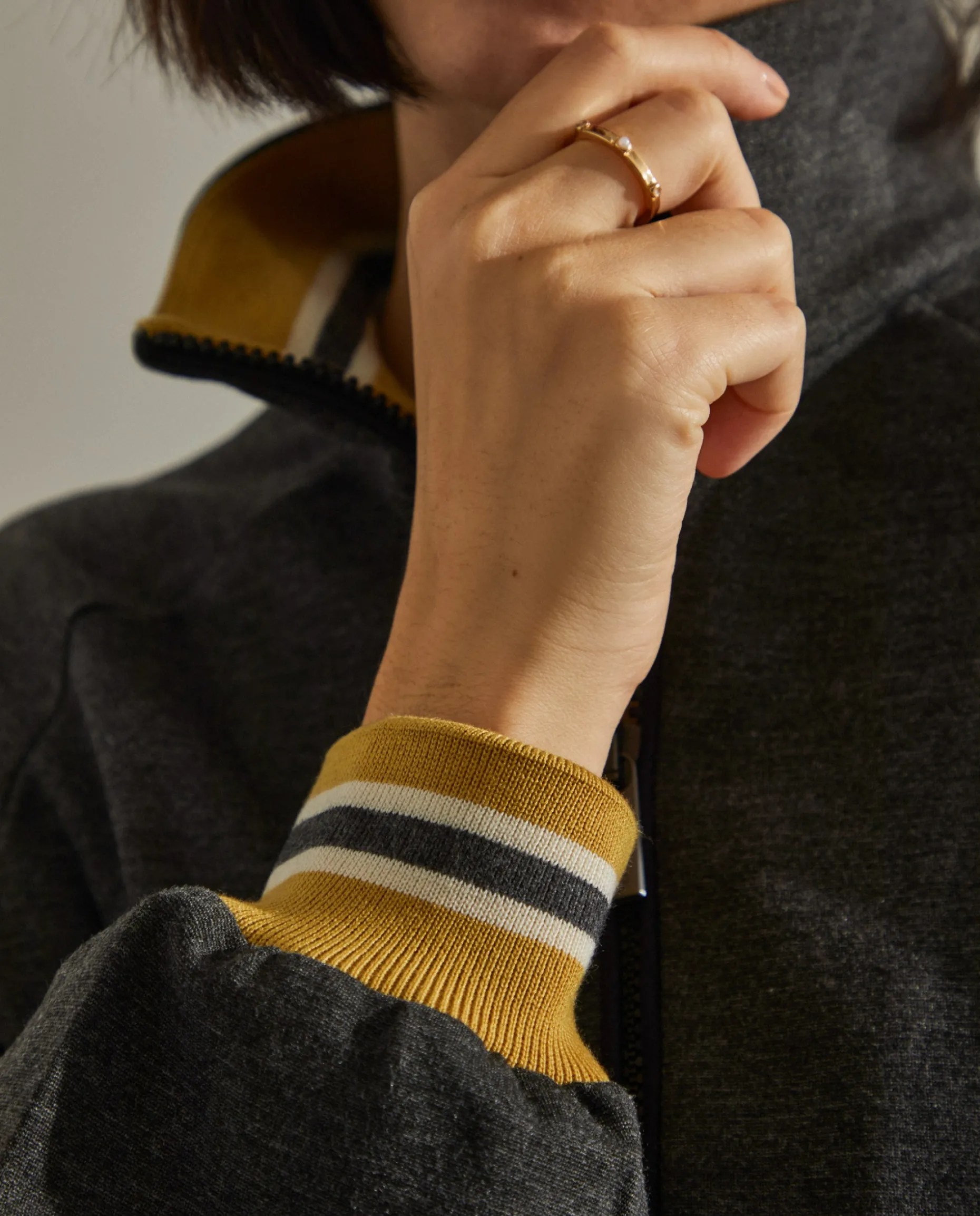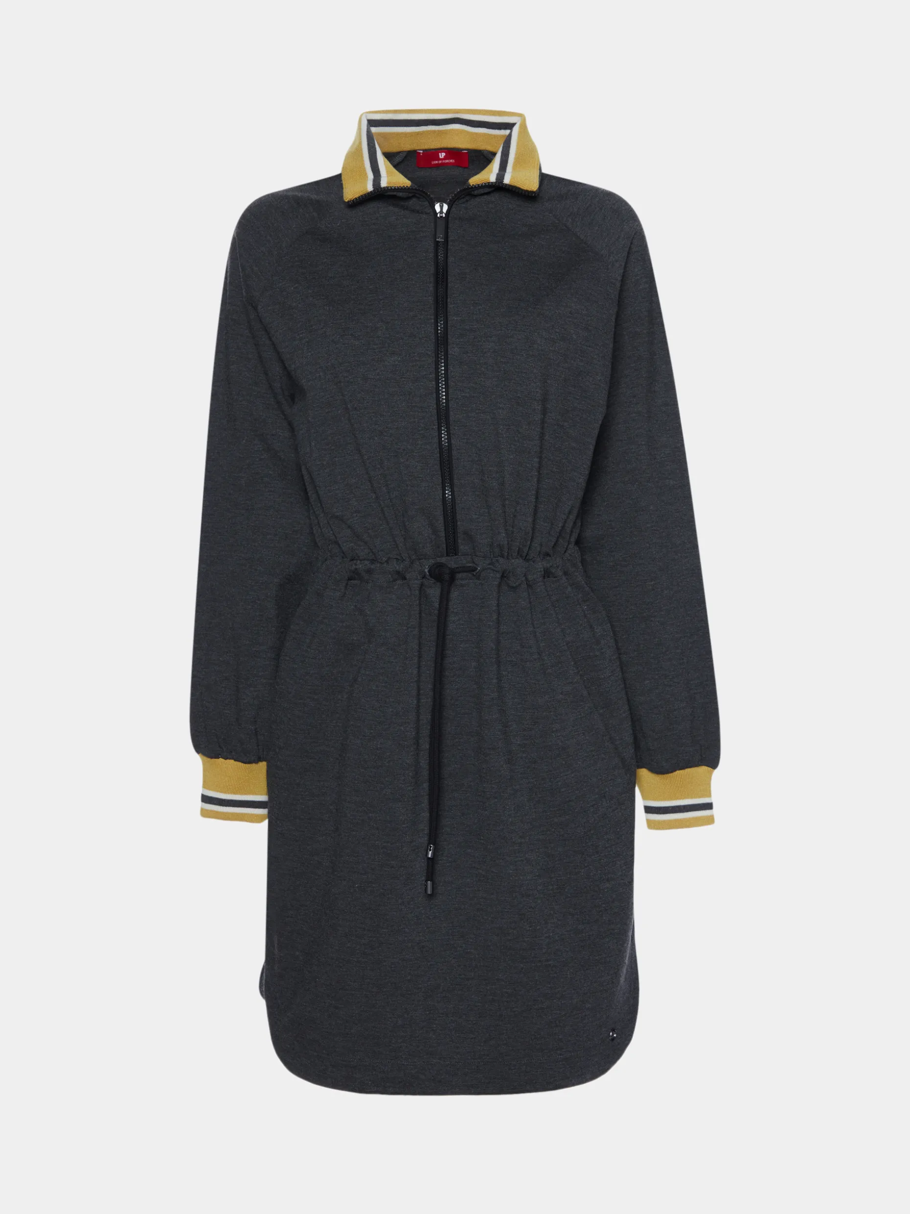 Vestido confecionado em malha com viscose. Aperta na frente com fecho. Mangas raglan. Cintura ajustável or cordão. Bainha redonda com aberturas laterais. Gola e punhos com riscas em contraste.