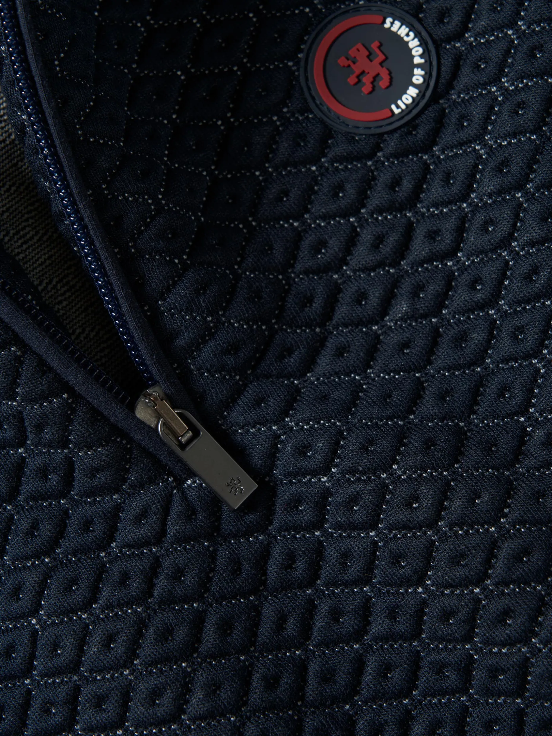Vestido em malha fantasia com manga comprida. Tem fecho de correr no pescoço e a gola ligeiramente subida. Pormenor de riscas tricolor no pescoço e punhos e etiqueta de borracha redonda no peito.