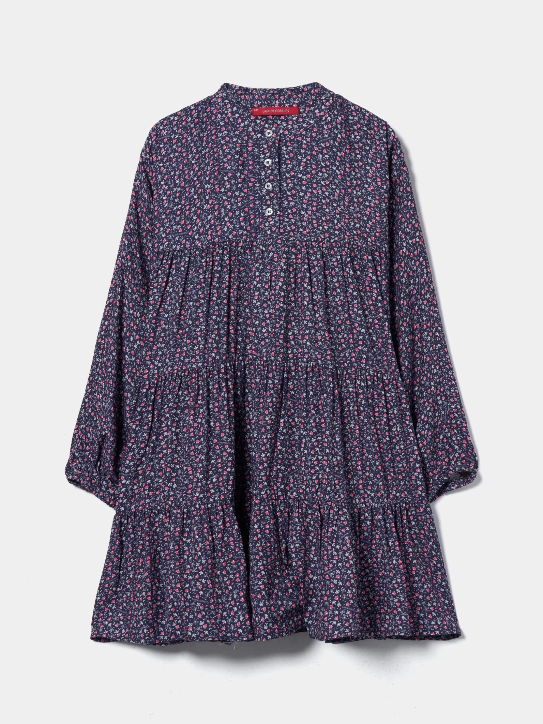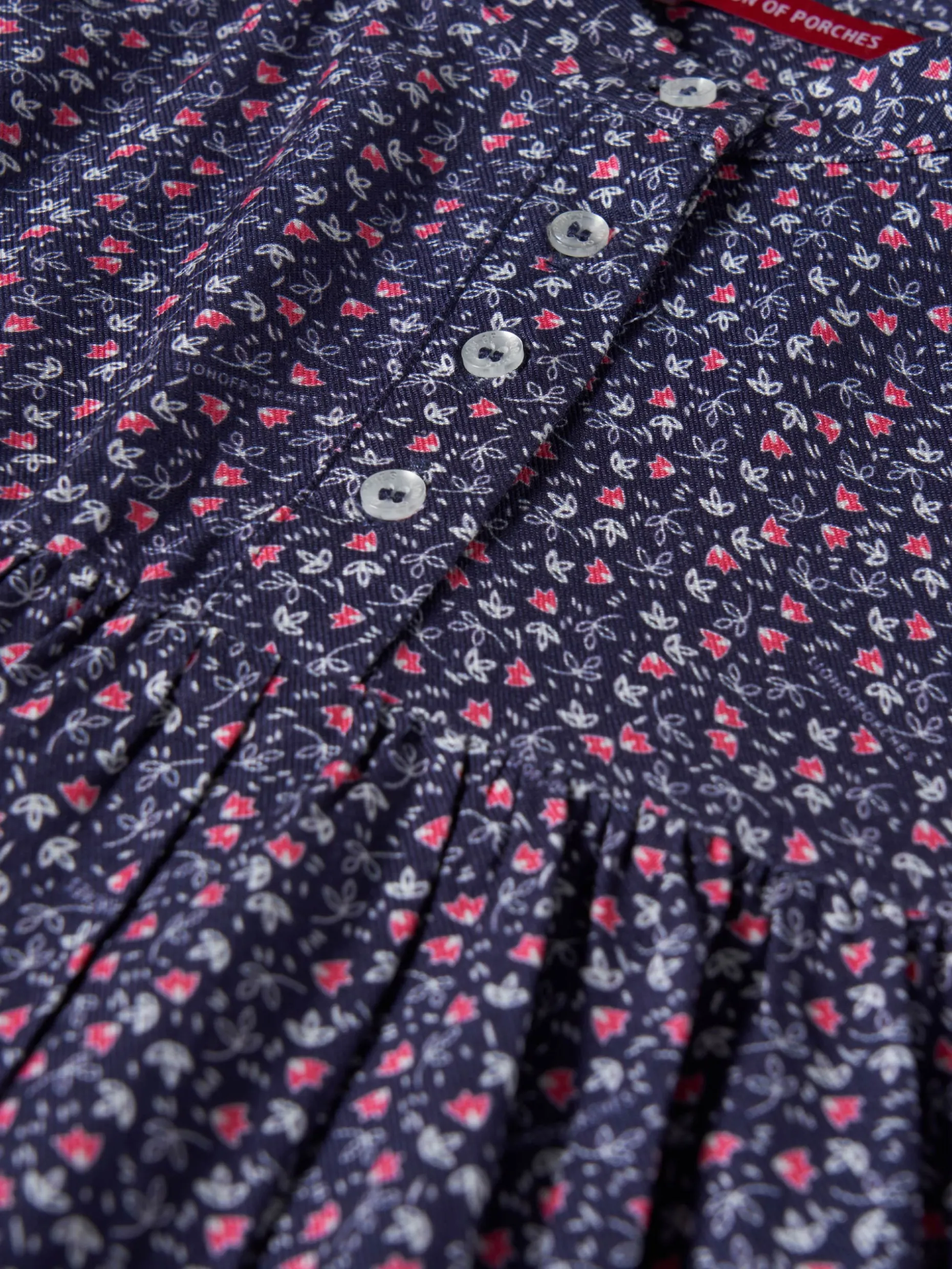Vestido de manga comprida com folhos. De micro padrão floral e personalização Lion of Porches, aperta no peito com botões. Punhos com elástico.