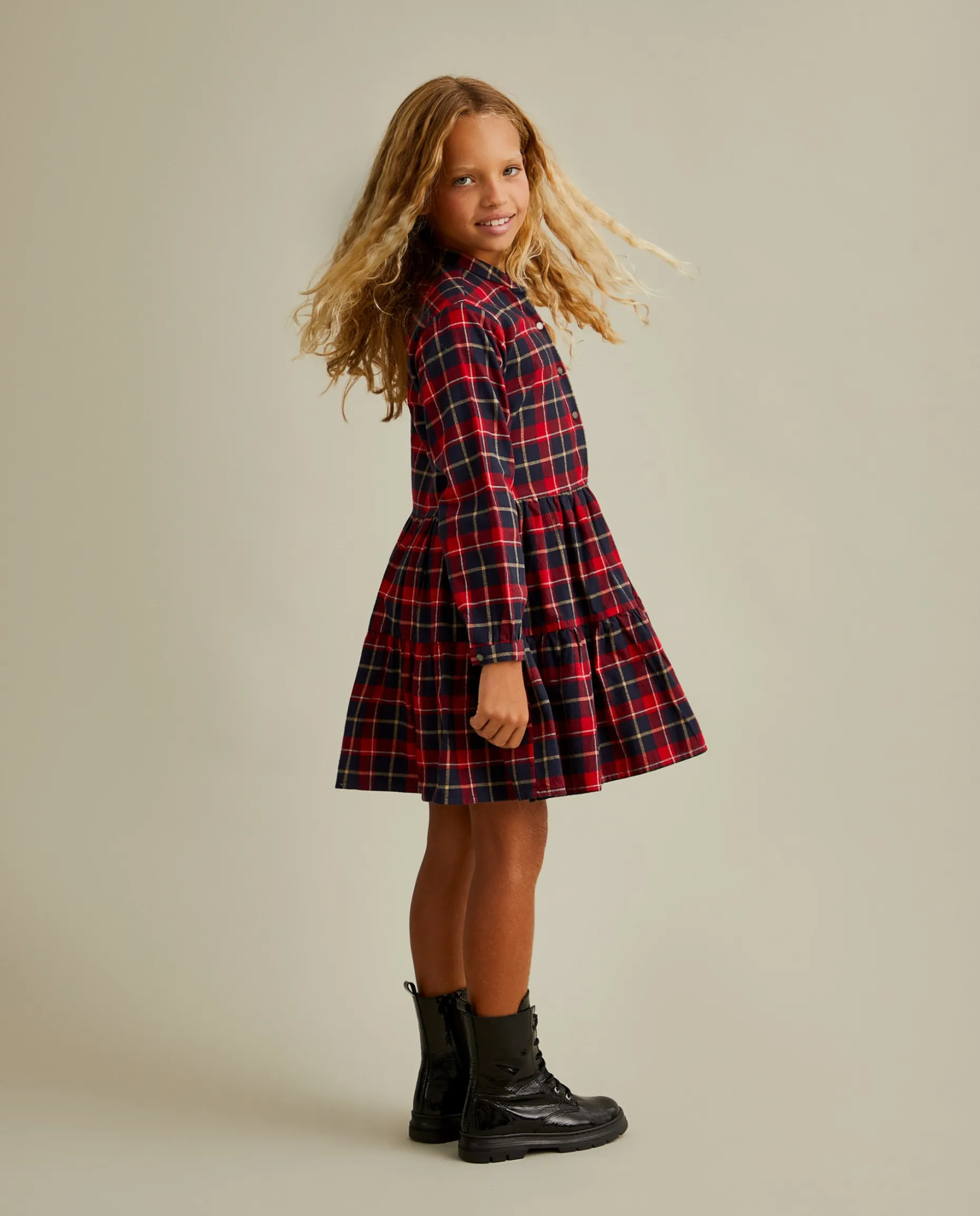 Um look de inverno perfeito para as meninas que gostam de se sentir vaidosas mas sempre confortáveis. Confecionado com 100% algodão, este vestido de manga comprida tem padrão de xadrez e saia rodada com folhos. Aperta com botões até meio corpo e o estilo da gola é mandarim. Os punhos também têm botões.
