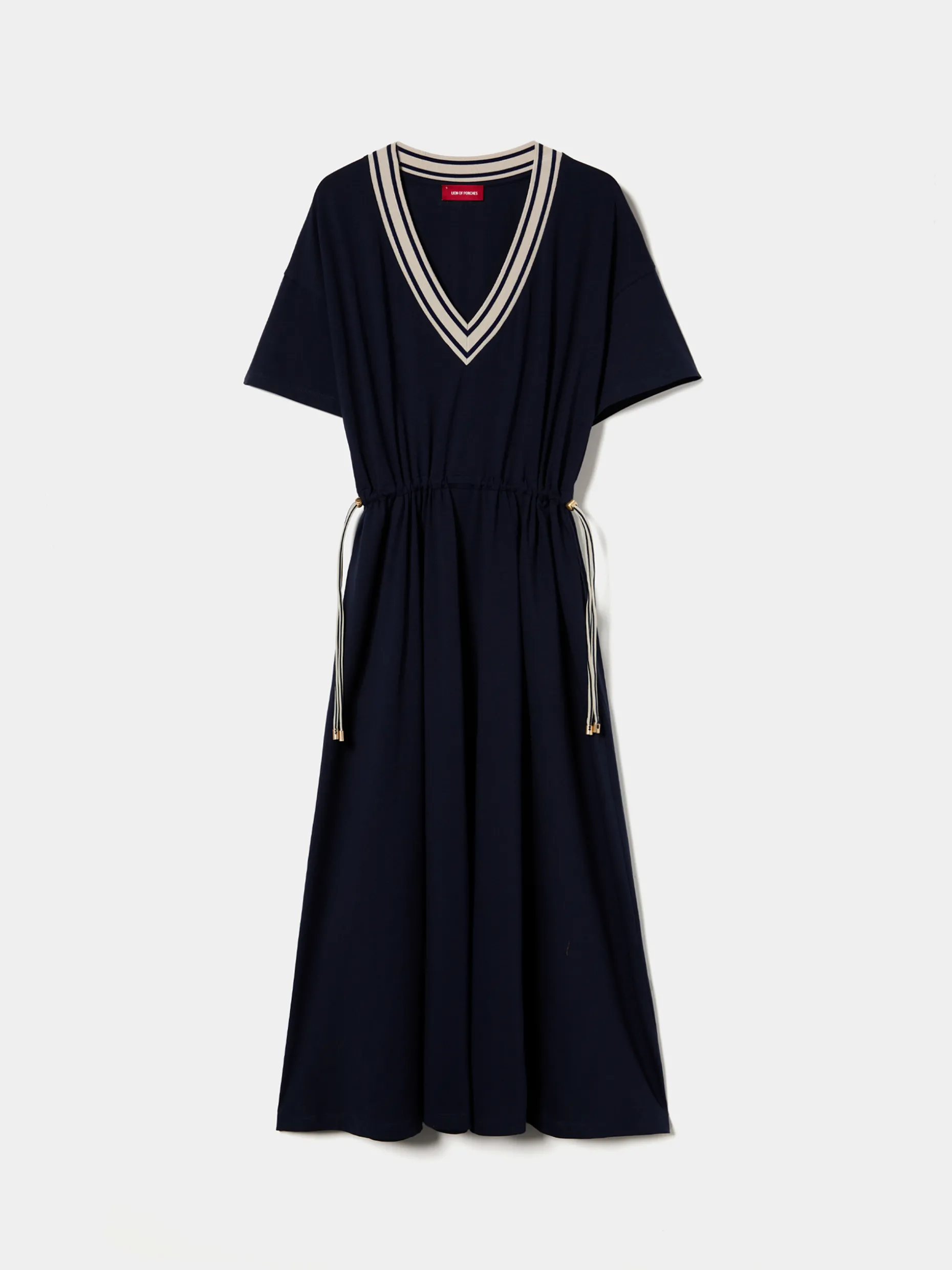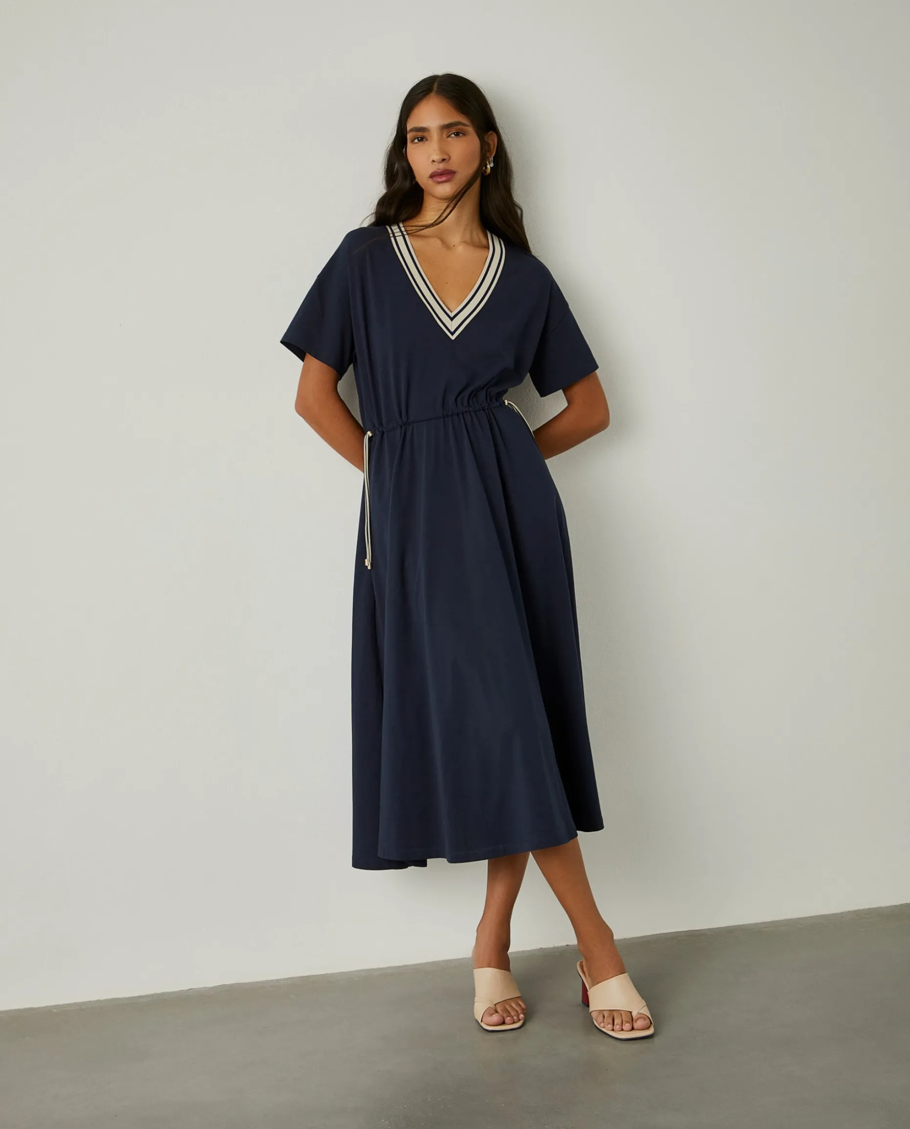 Leve e confortável vestido comprido de manga curta em jersey de algodão com decote em bico com riscas caneladas em contraste. A cintura é ajustável por cordões com as mesmas riscas do decote.