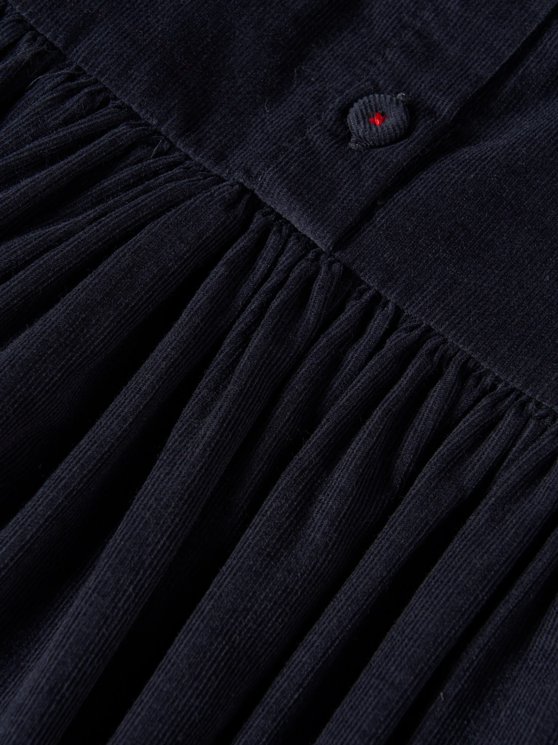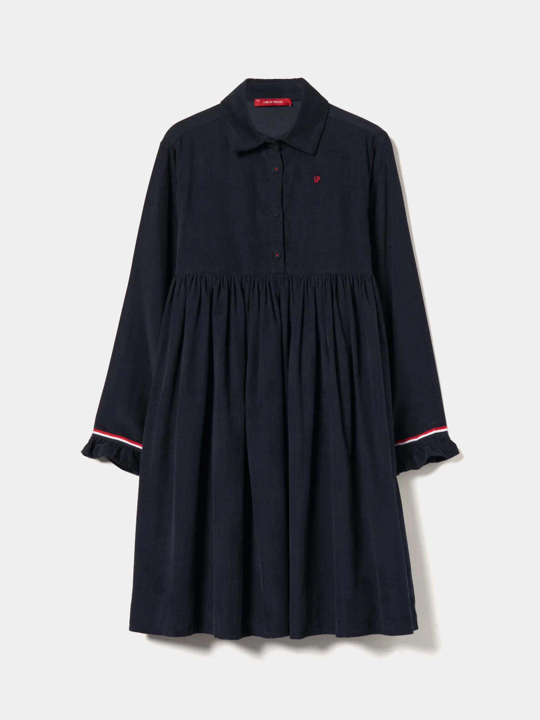 Vestido com decote camiseiro confecionado em bombazina. Folhos e fita tricolor nos punhos. Aperta na frente com botões.