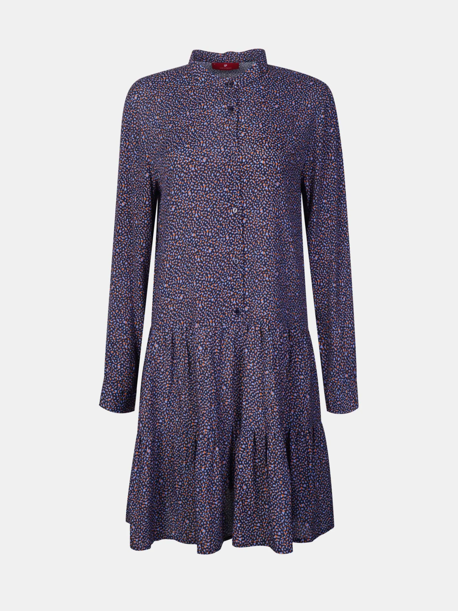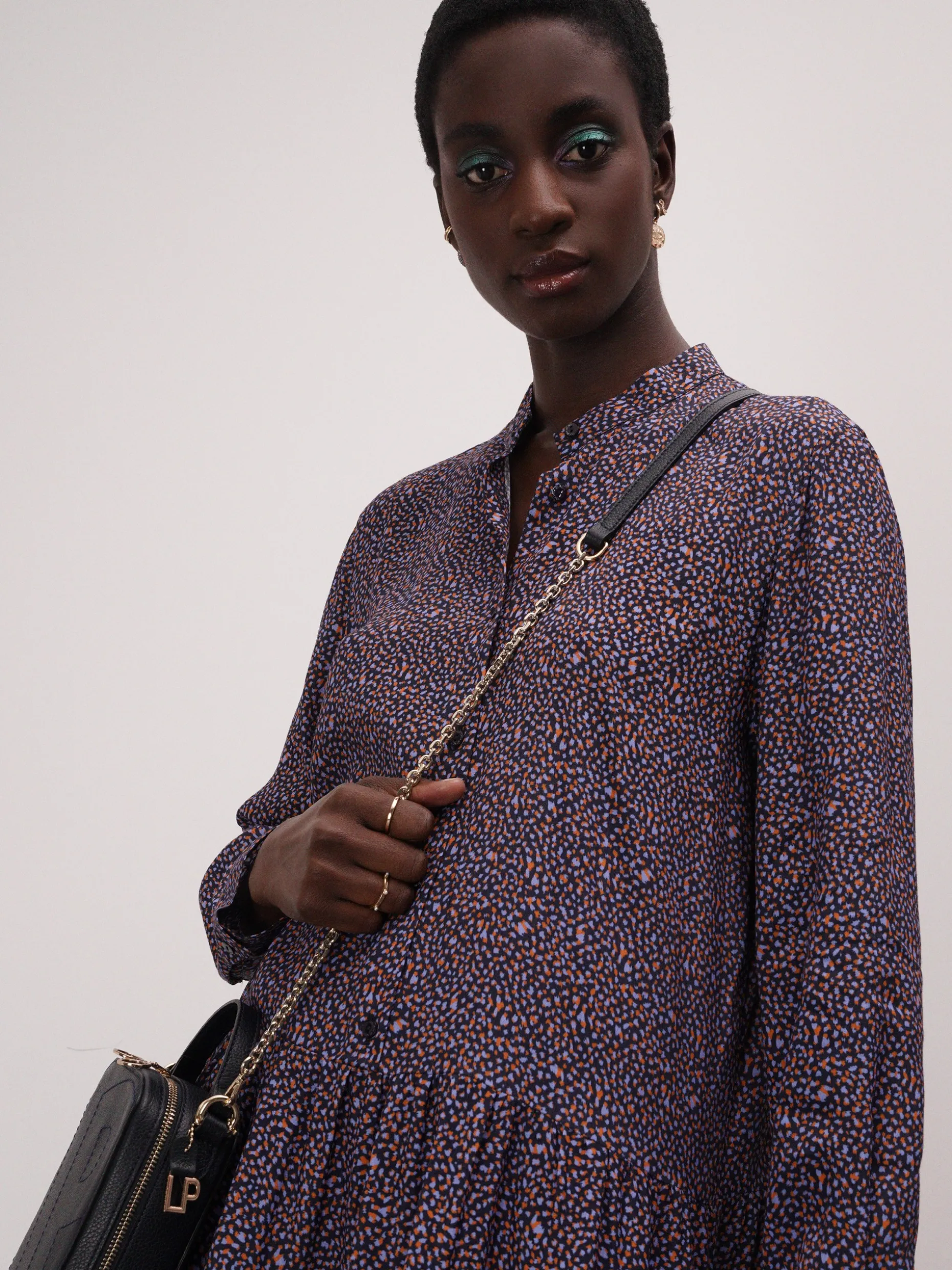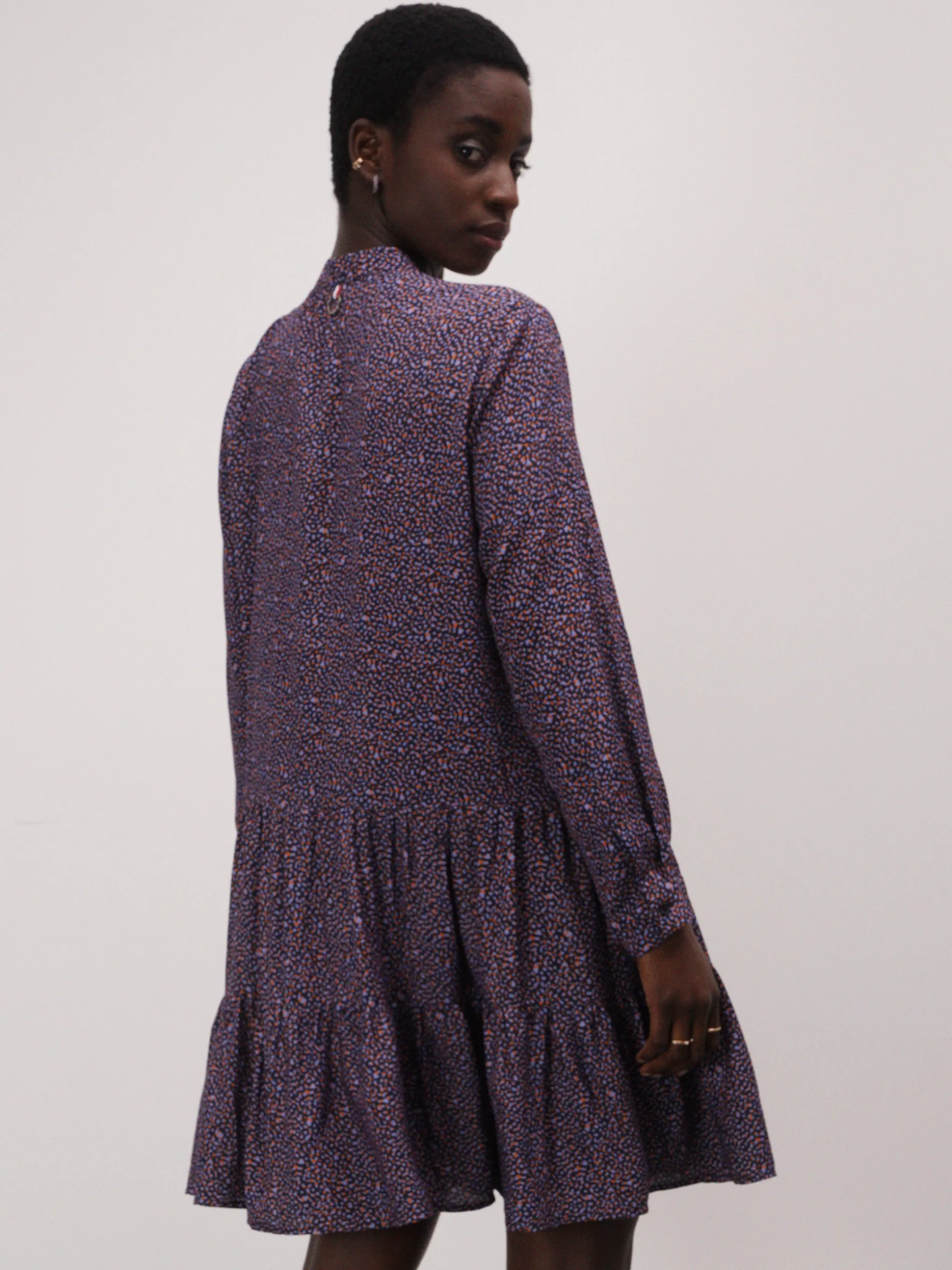 Vestido fluido estampado com folho. Cintura descida. Punhos abotoados. Aperta na frente com botões.