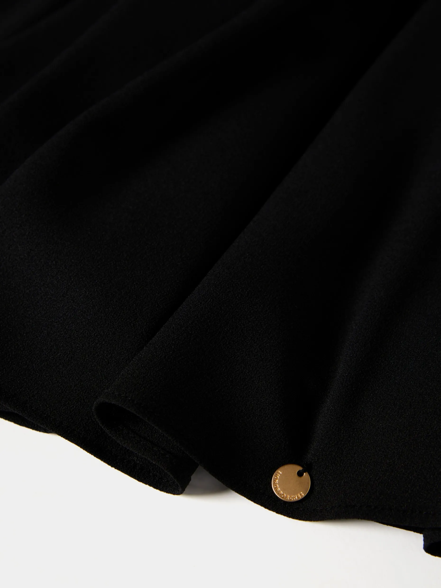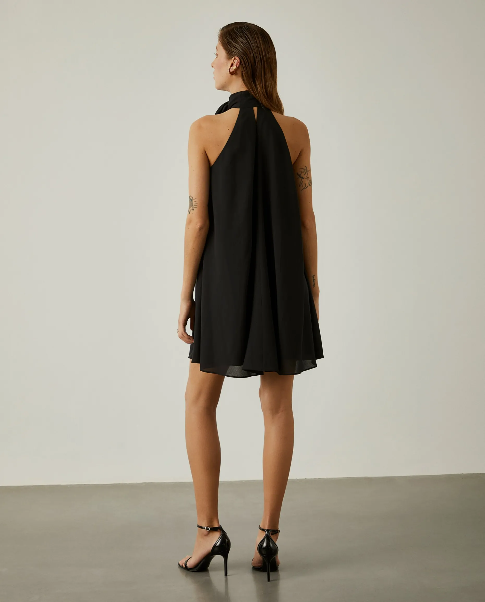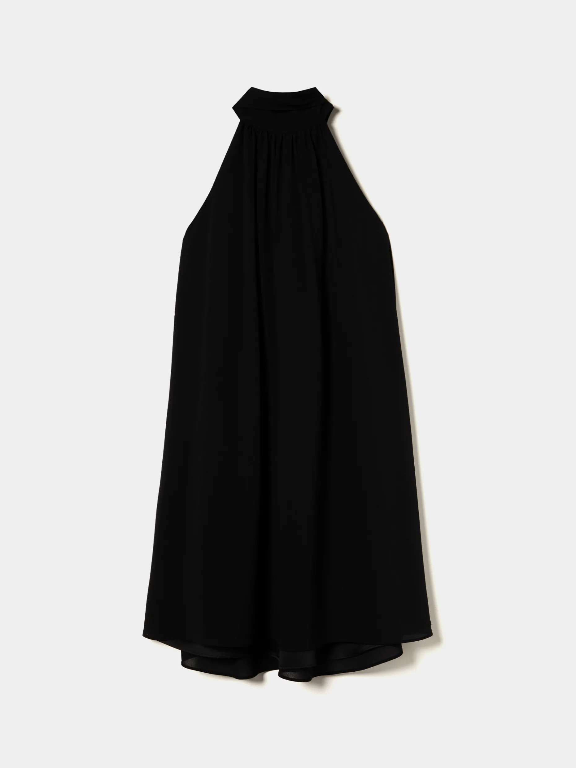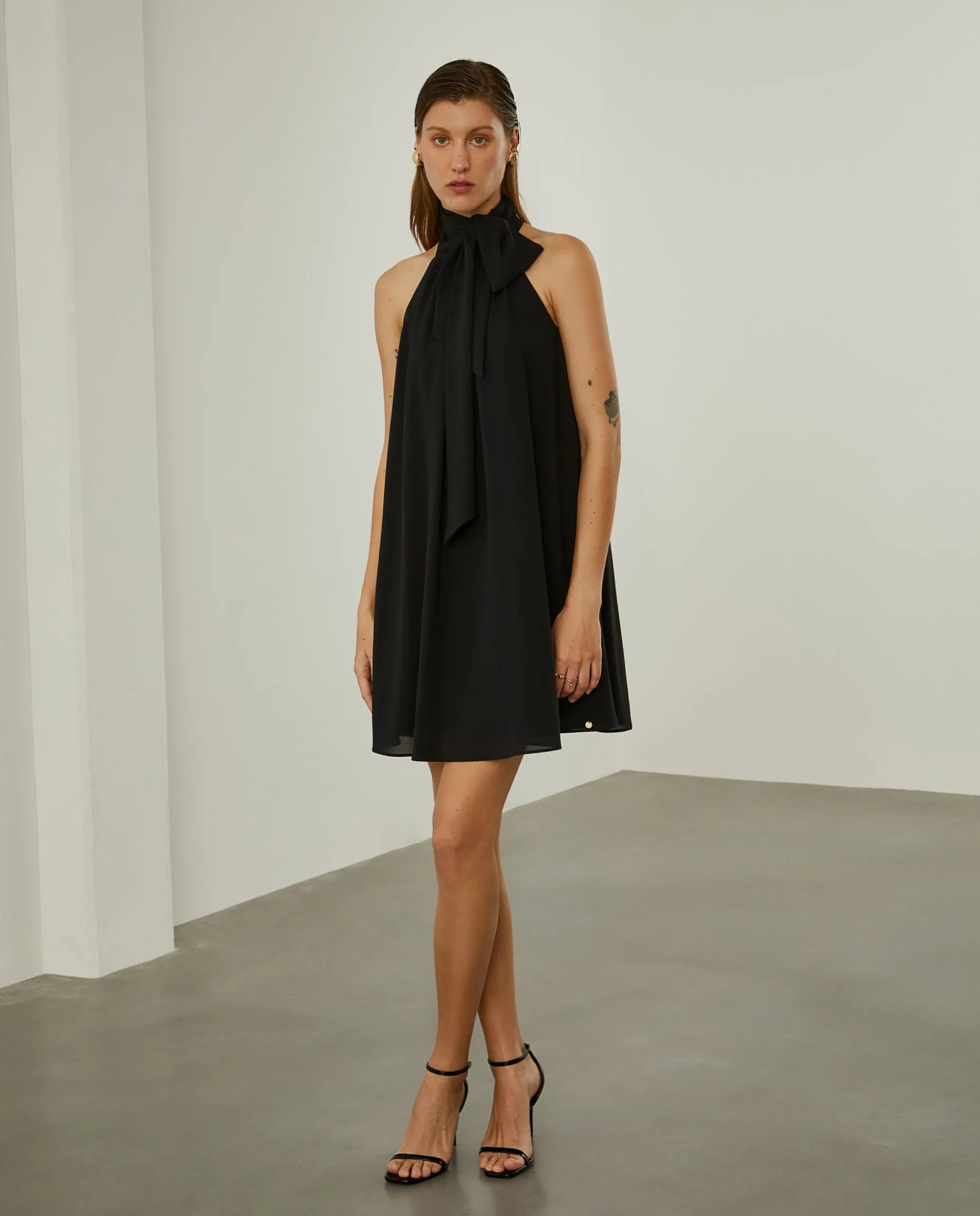 Vestido curto, sem mangas, elegante e versátil para qualquer plano de verão. De fit fluído, tem gola alta e aperta nas costas.
