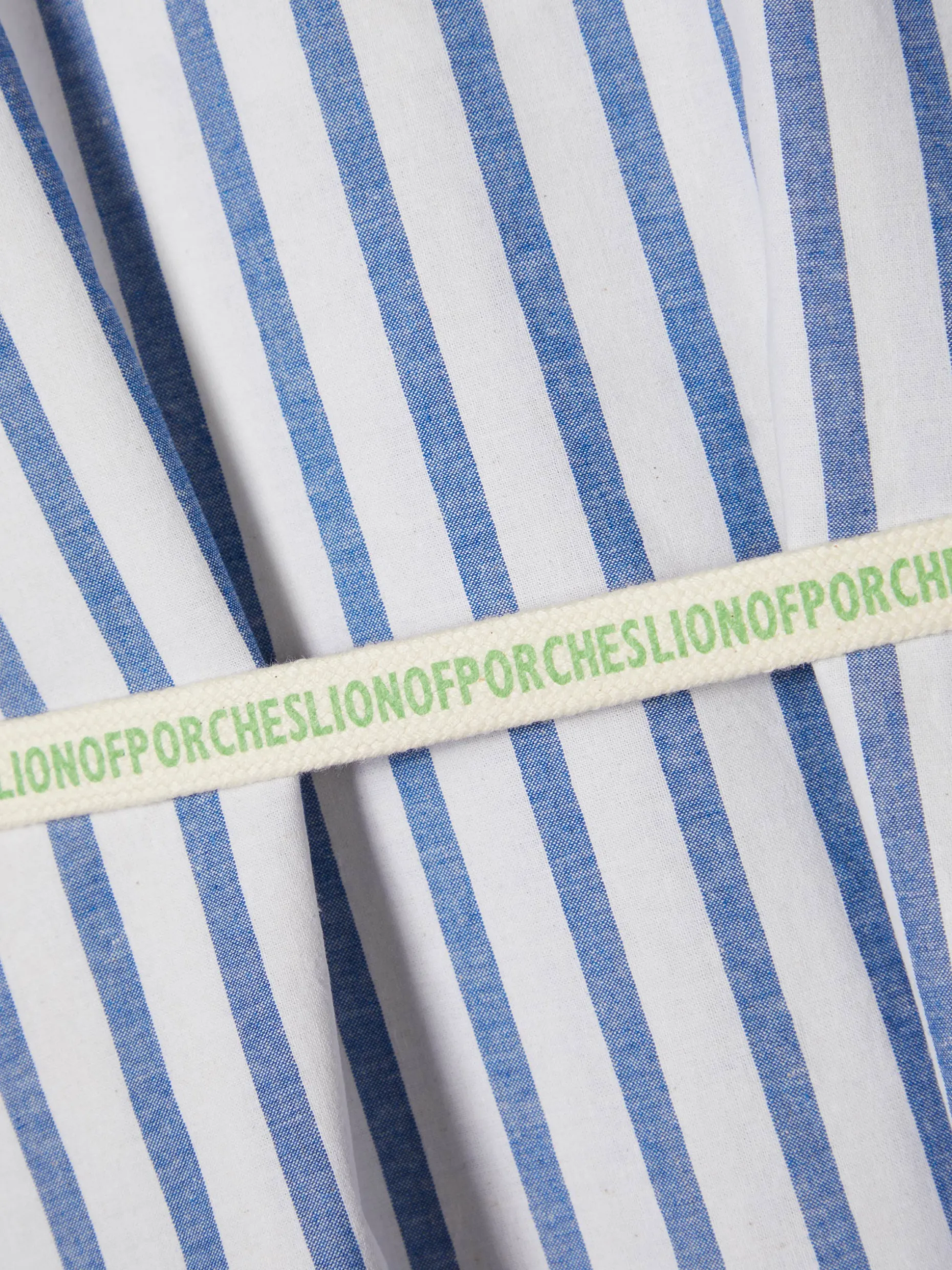 Vestido de manga 3/4 às riscas. Detalhe de cordão na cinta com estampado Lion of Porches em 2 cores. Aperta com botão personalizado na frente e punhos. Saia com folho.