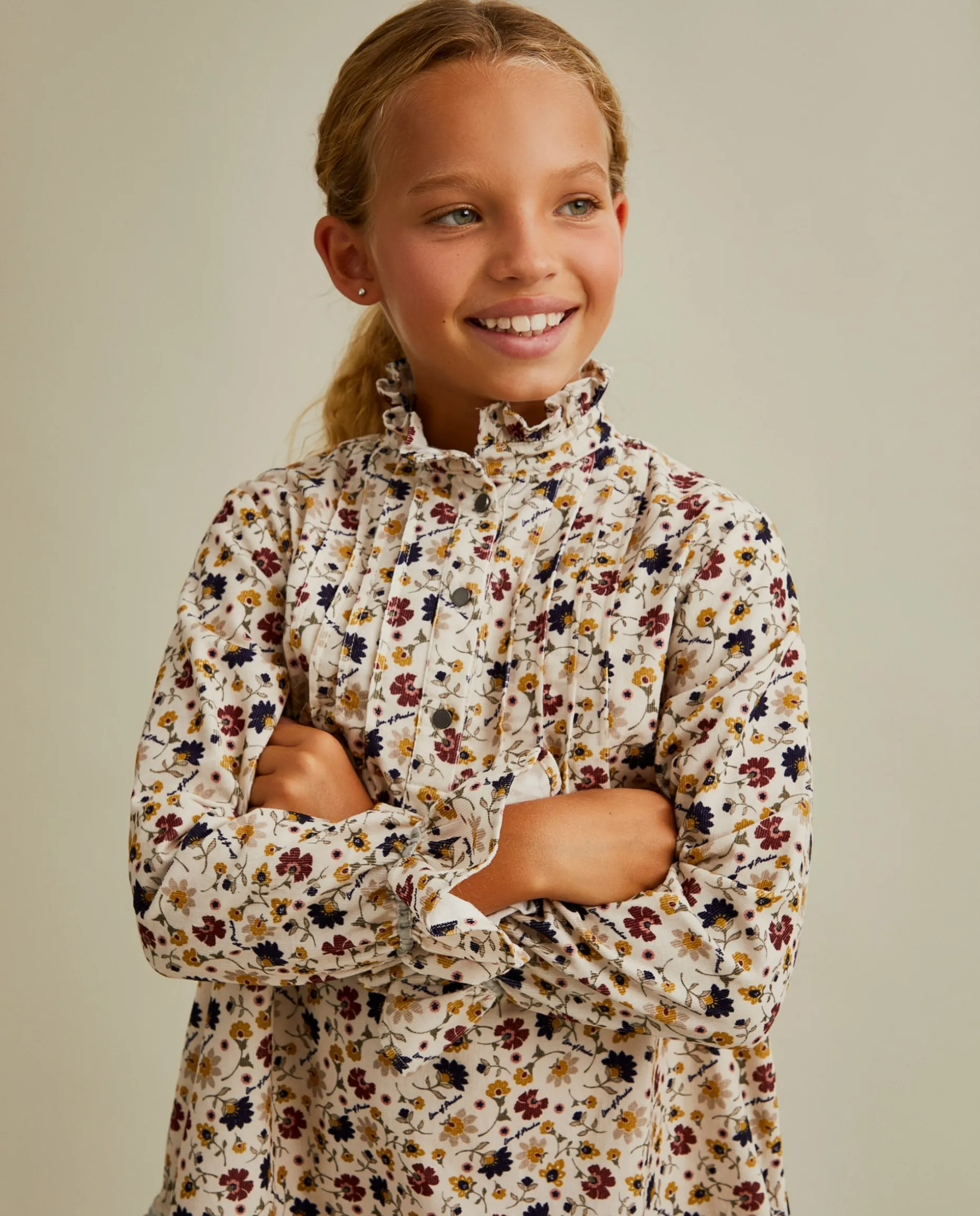 Vestido manga comprida em bombazine estampada com botões personalizados na frente. Fita de veludo em contraste no fundo e nos punhos. Placa personalizada nas costas perto da gola.