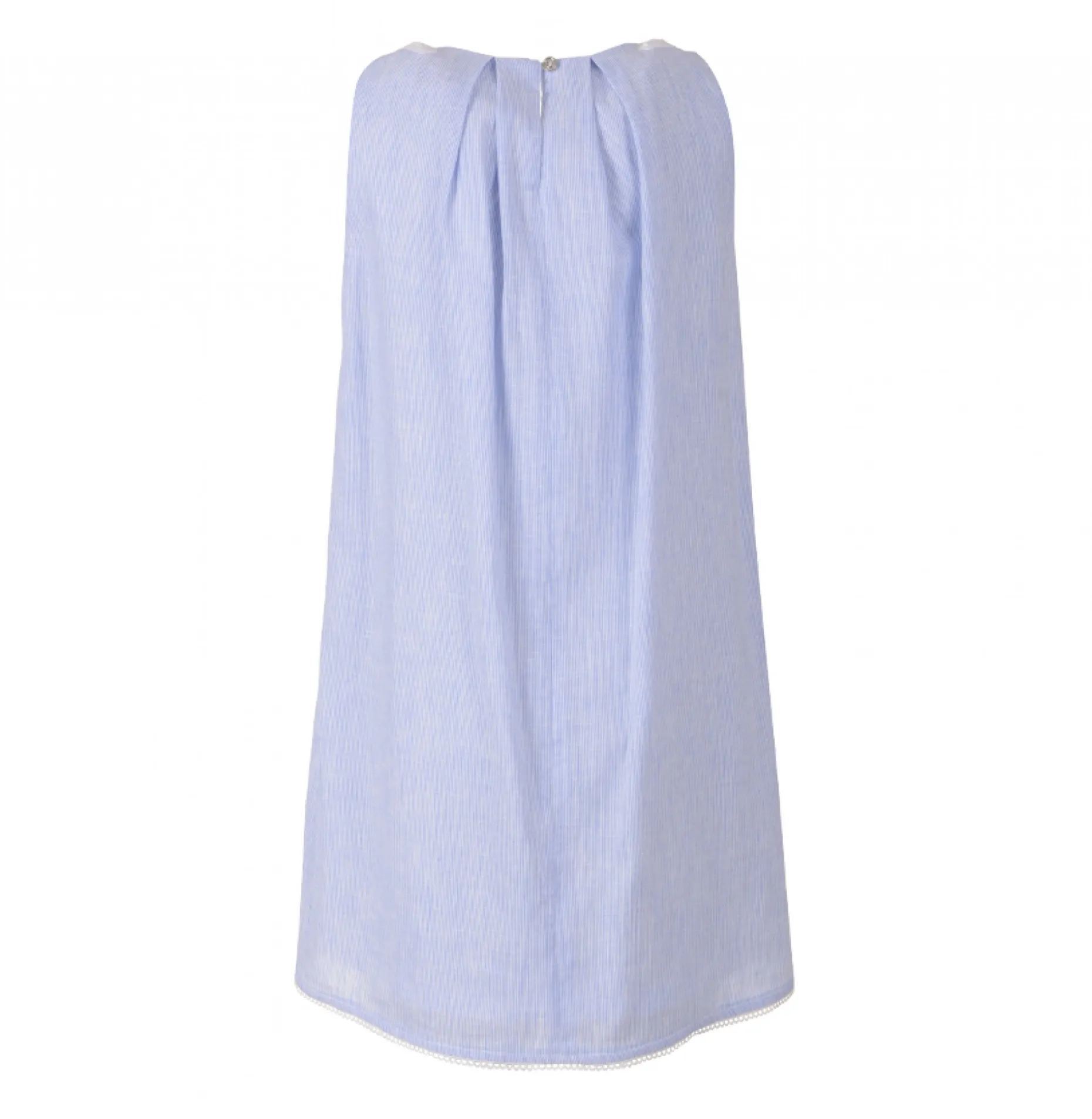 Fresco e simples são as palavras que melhor definem este vestido, em linho com riscas verticais e aplicação de renda ao nível do decote.