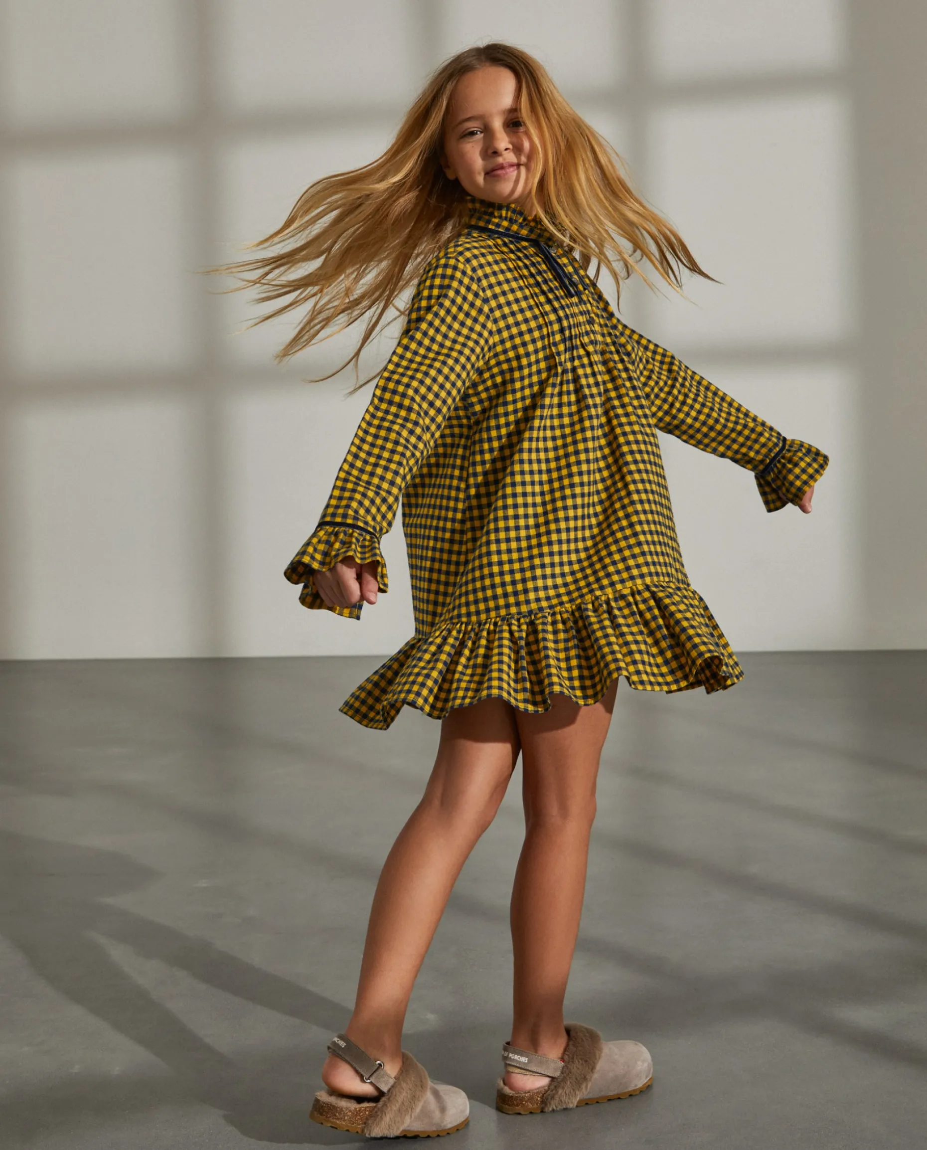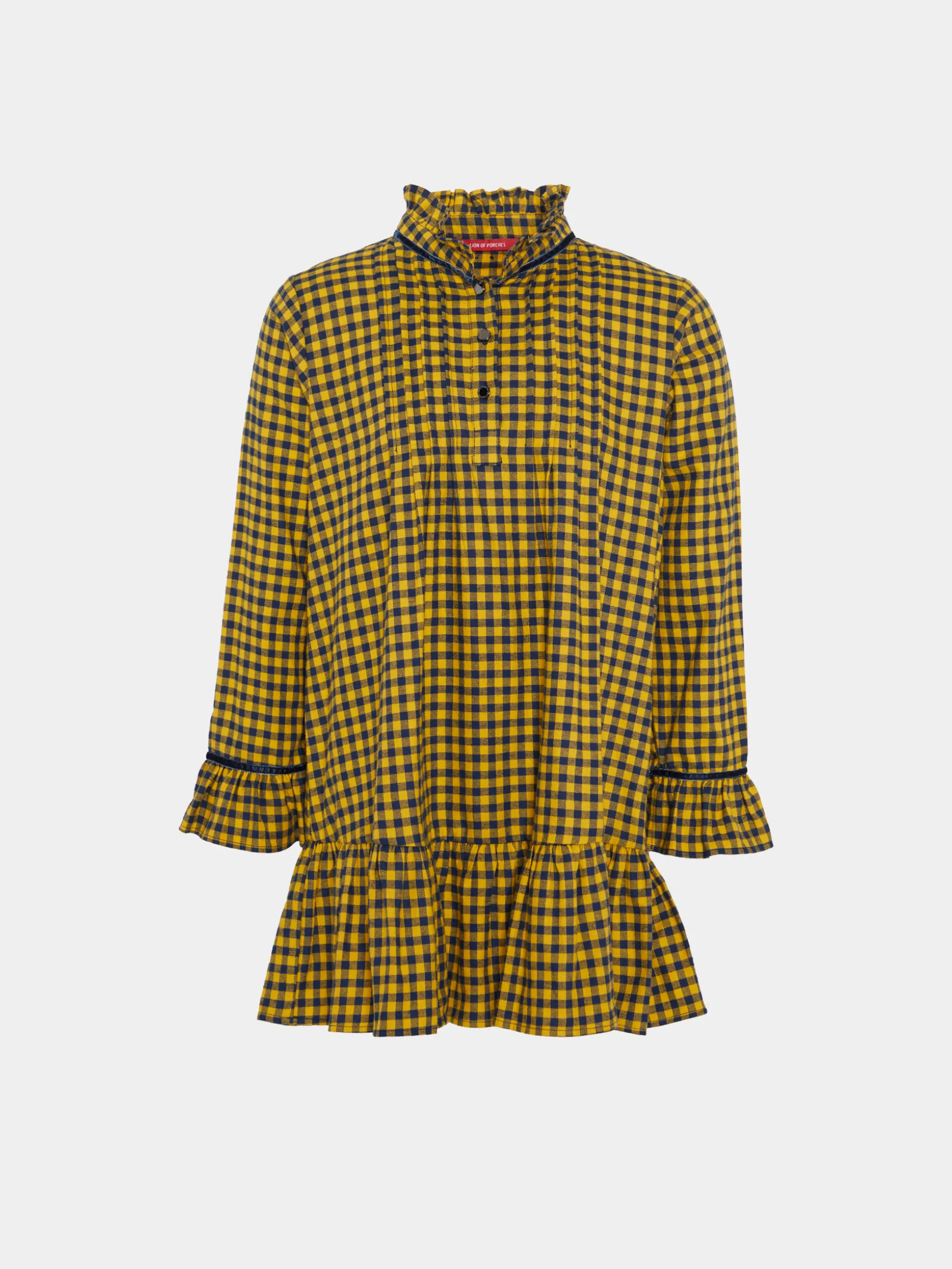 Vestido com padrão vichy confecionado em 100% algodão. Folhos na bainha, punhos e gola. Detalhe de fita de veludo nos punhos e gola.