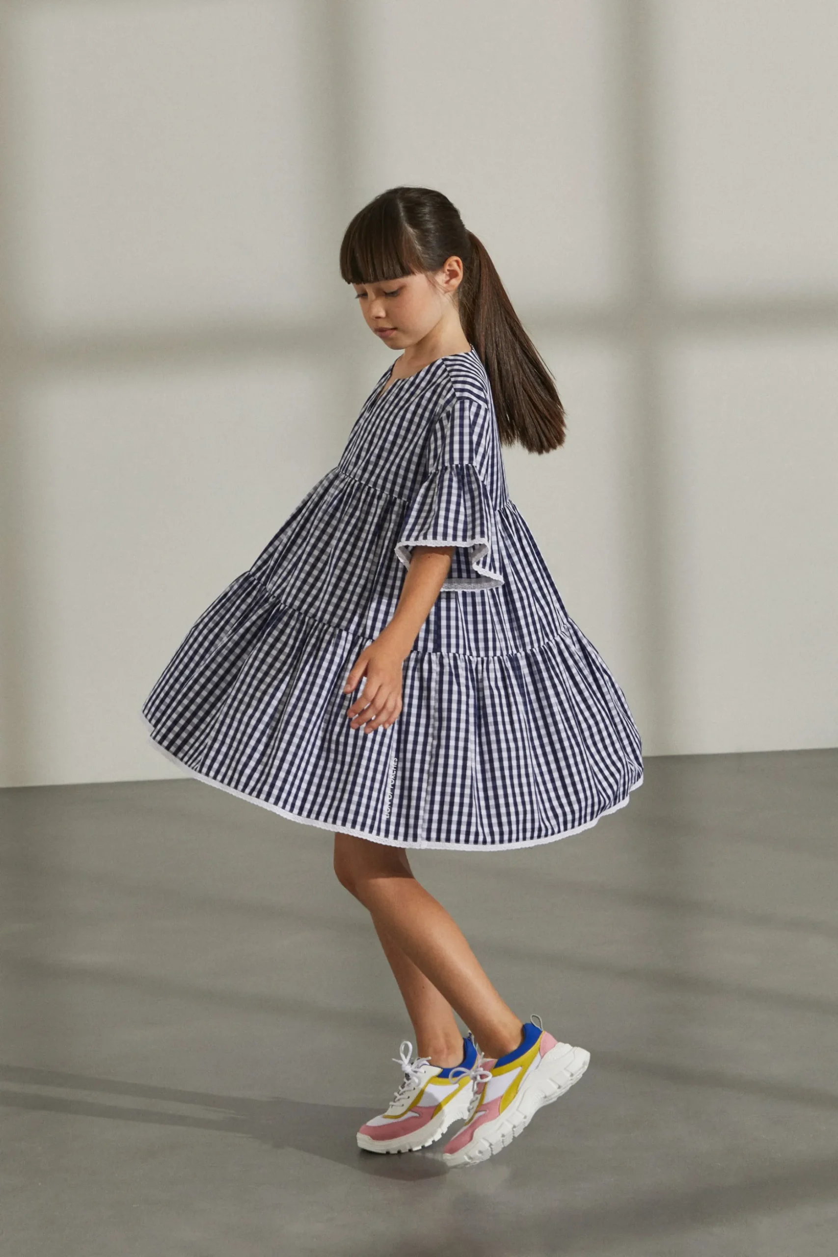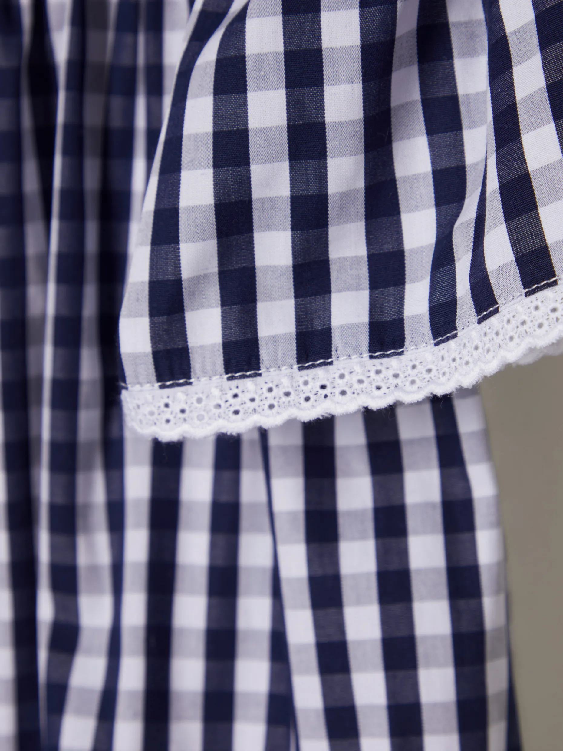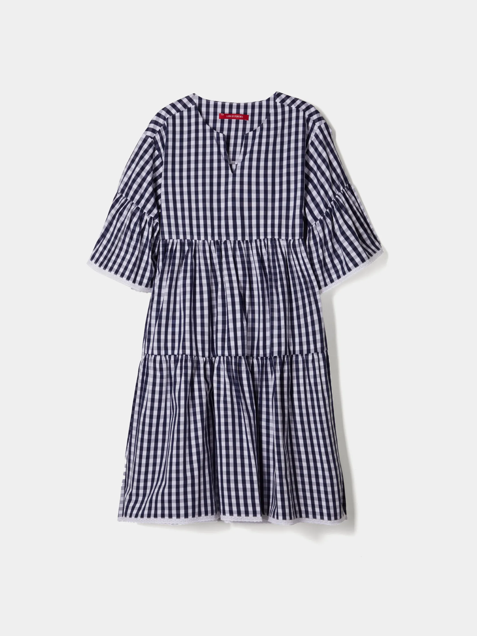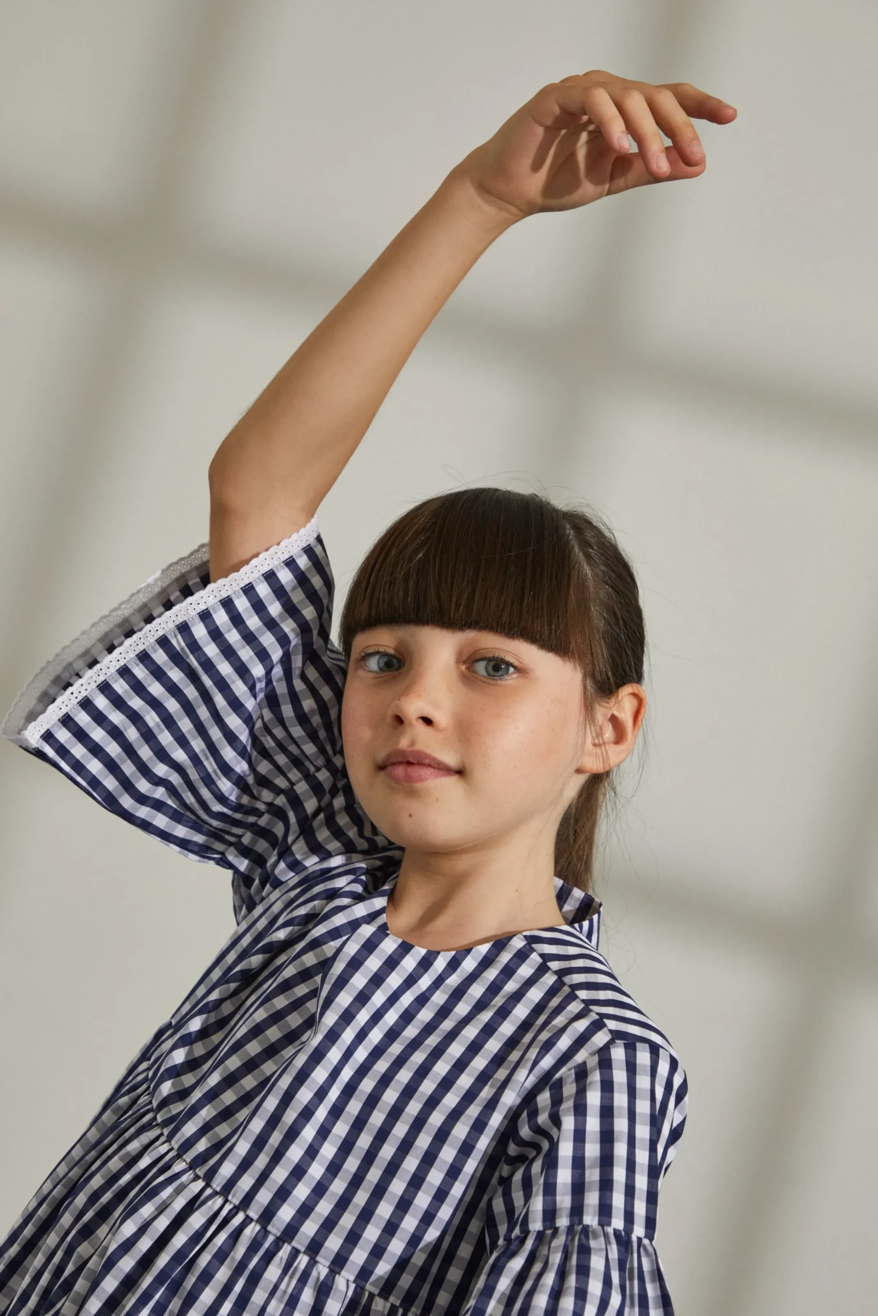 Vestido de manga curta ao xadrez. Destaque para a renda nas mangas e no fundo. Decote em bico.