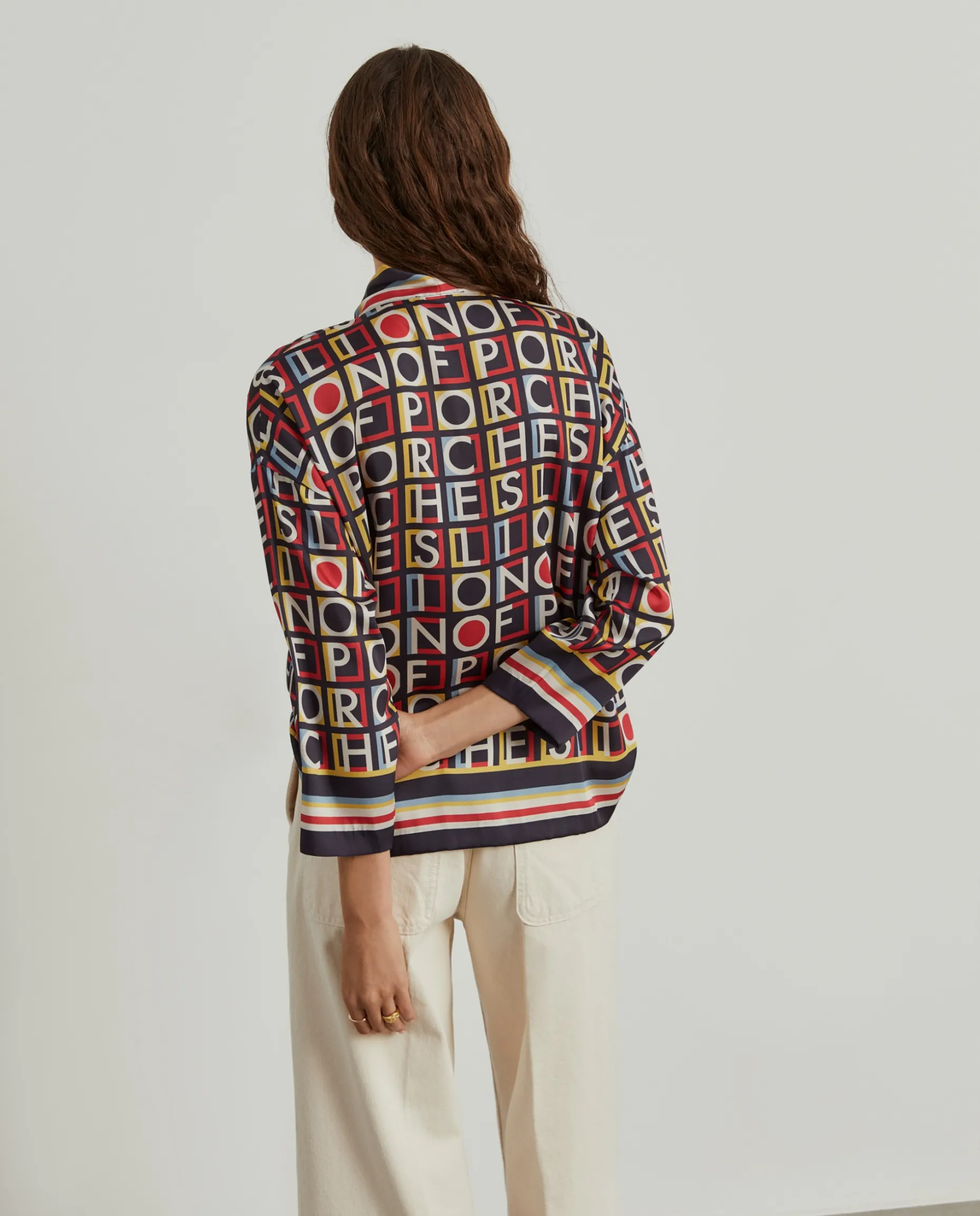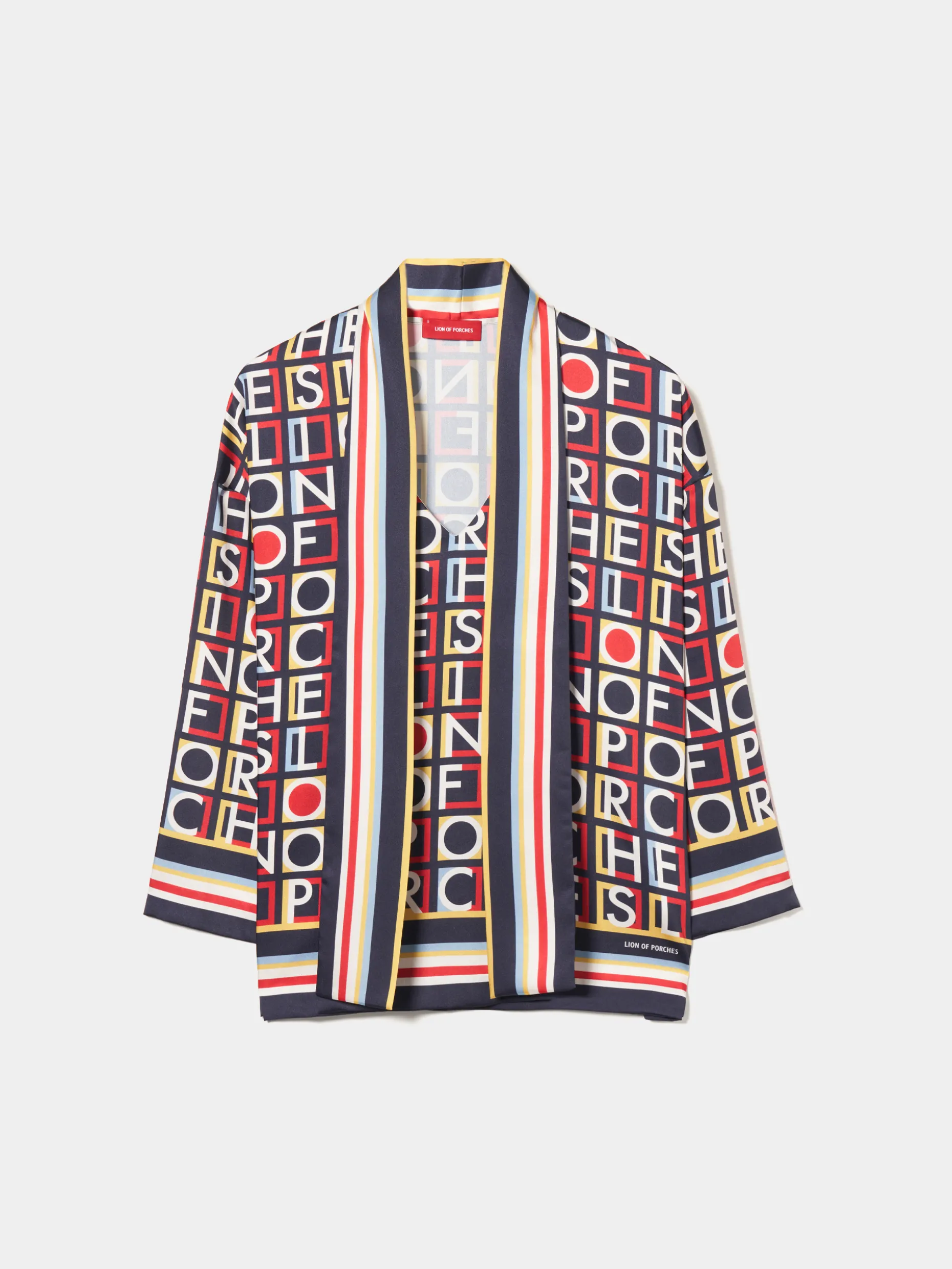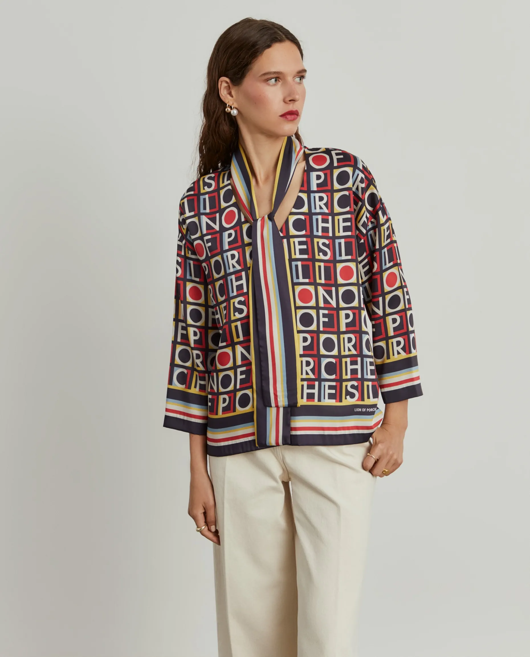 Elegante blusa fluida com padrão colorido Lion of Porches por toda a peça, perfeita para dar um toque de personalidade ao seu look. De manga comprida, tem decote em V e fita no mesmo tom e tecido para dar laçada no pescoço.