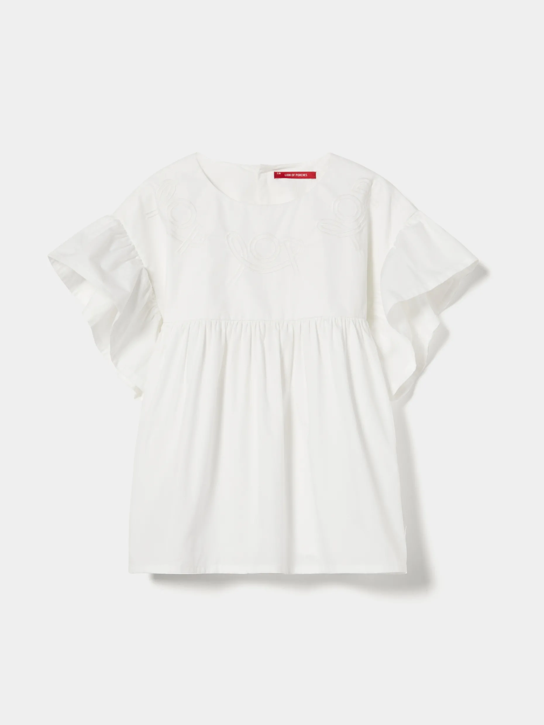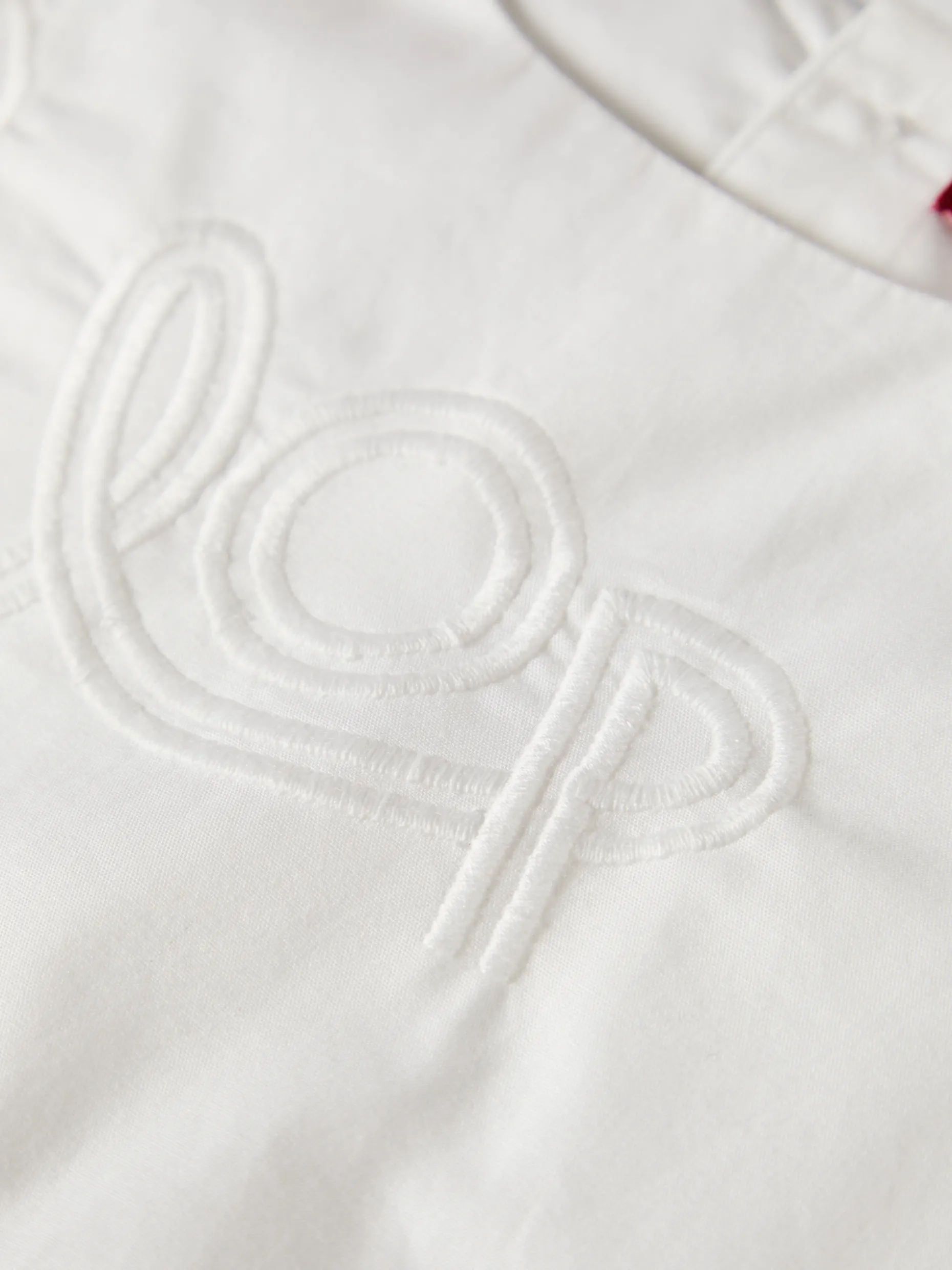 Blusa de manga curta com folho nas mangas e monograma da marca bordado à cor à volta do decote. Abertura nas costas com três botões personalizados. É confecionada em algodão para maior conforto e suavidade.