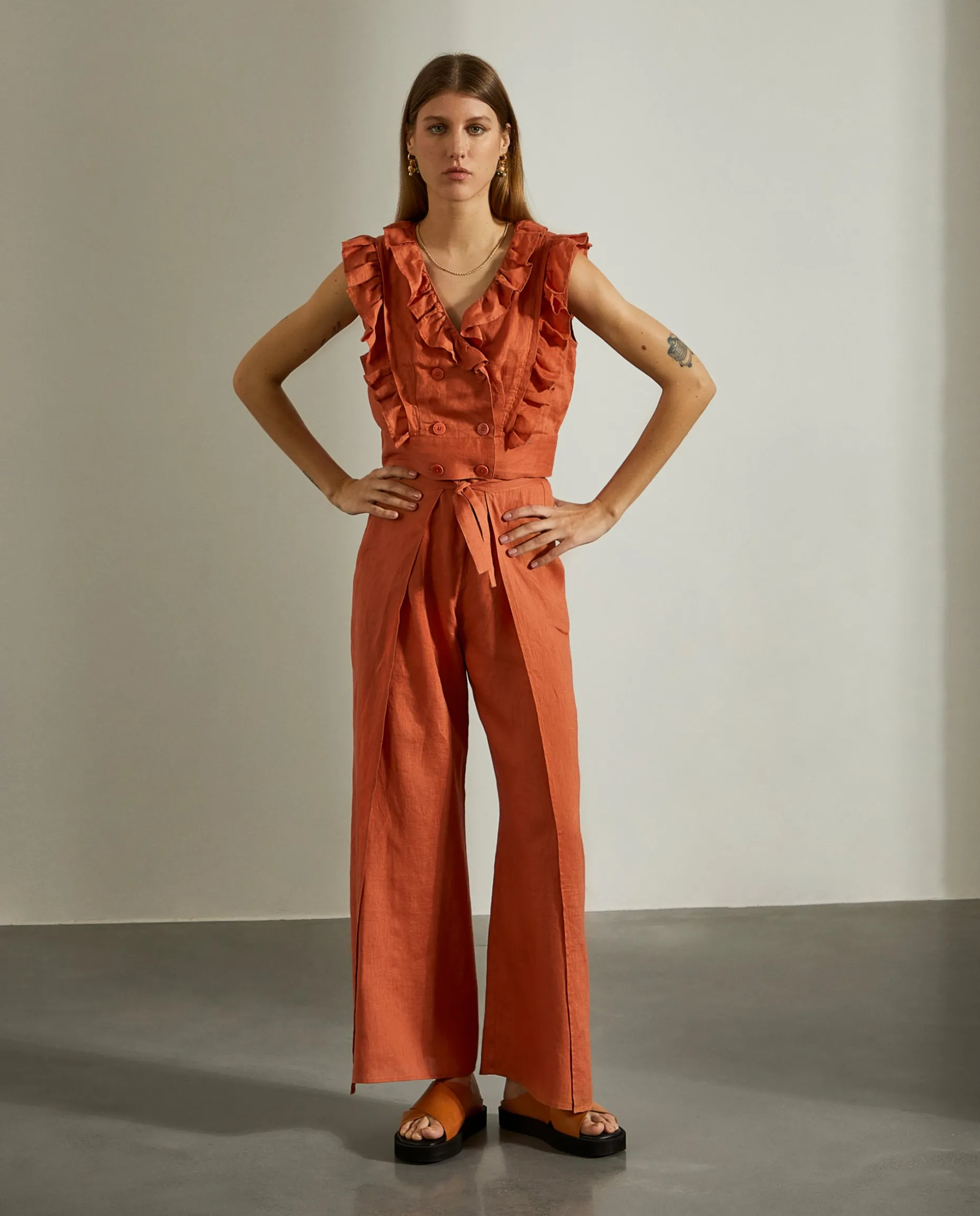 Blusa curta, sem mangas e com folhos, de decote em V de trespasse. Possibilidade de calças a combinar. Confecionada em 100% linho.