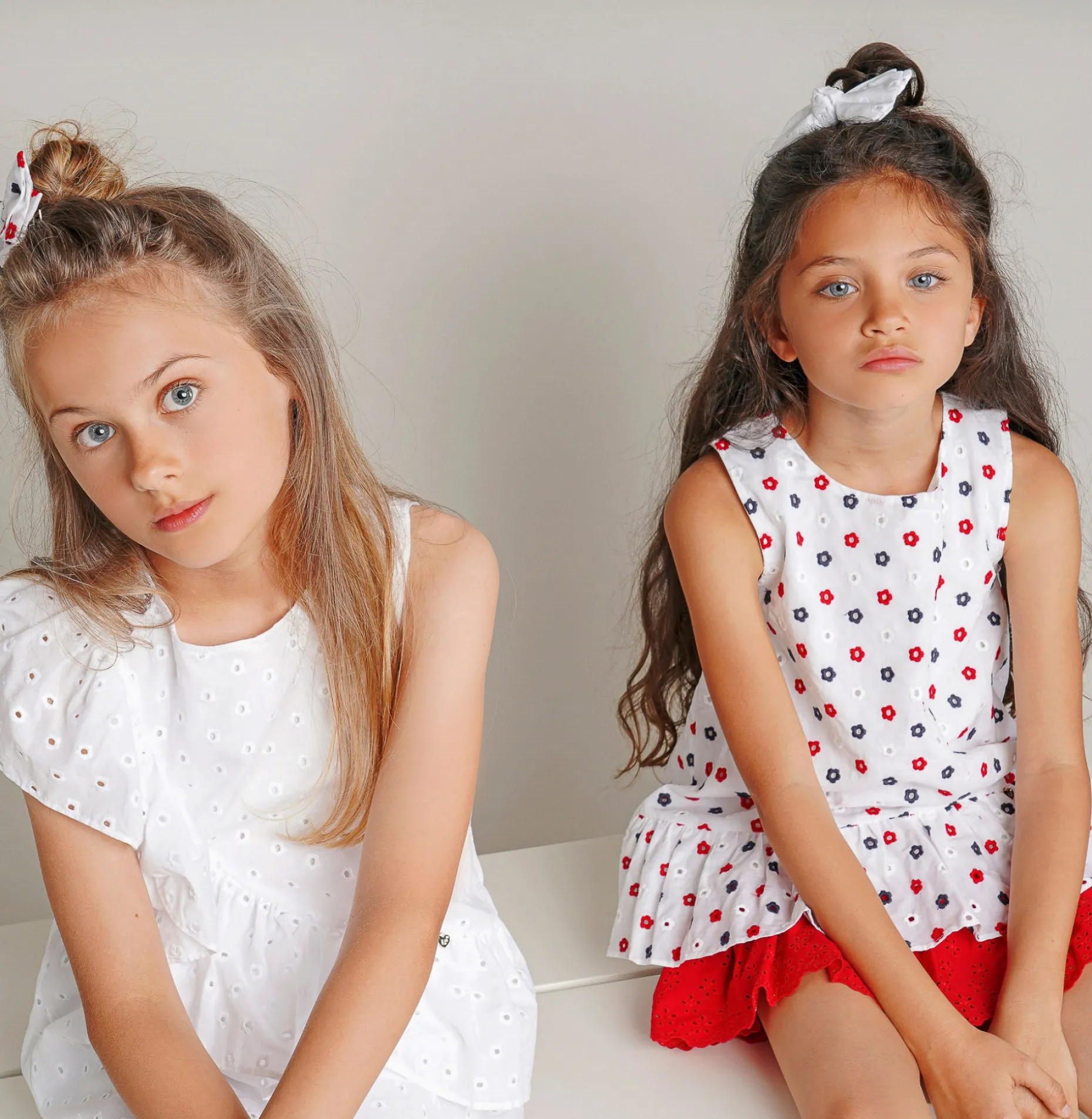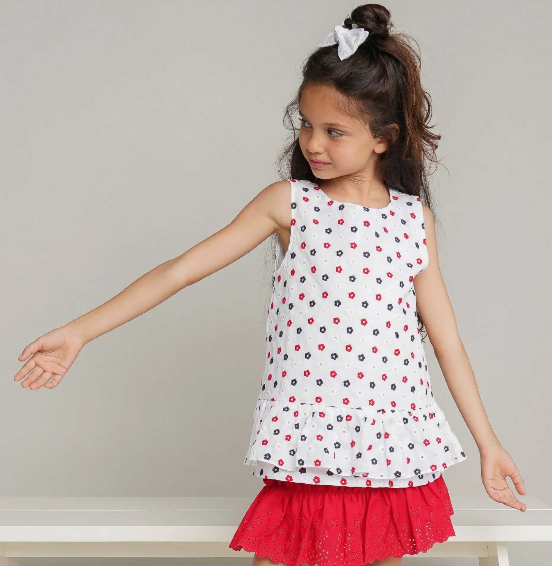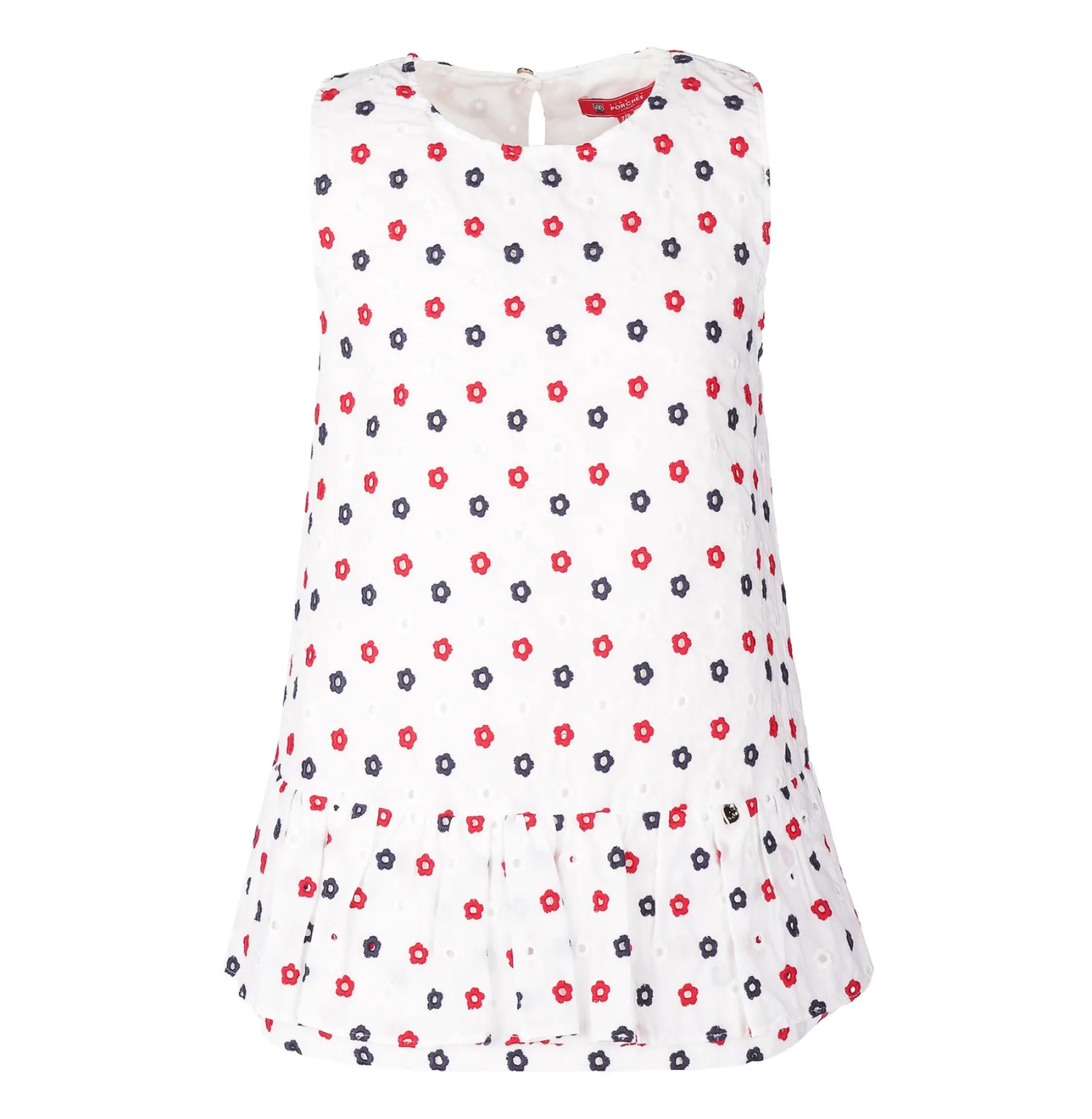 Blusa branca, sem manga, em tecido de flores bordadas a branco, marinho e vermelho, com folho na base. Forrada. Fecho em lágrima nas costas. Personalizada com pequeno coração metálico «LP» no folho, à frente. Complete o look com acessório de cabelo do mesmo padrão.