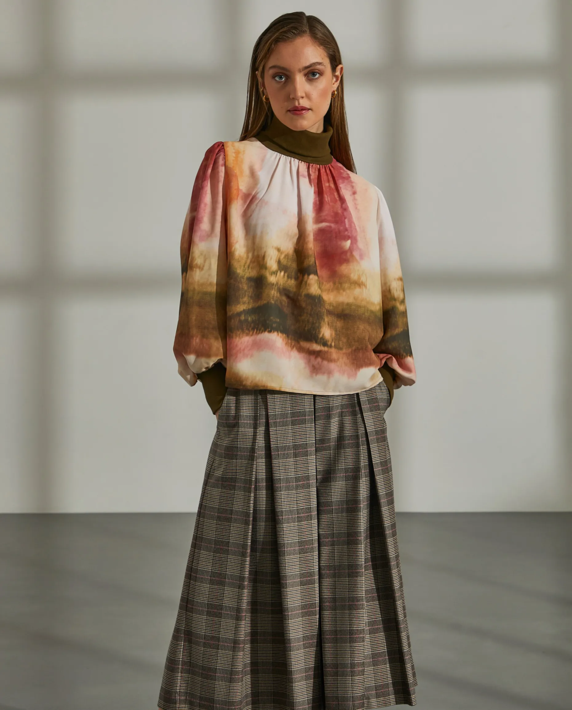 Dê cor ao seu outfit com esta romântica blusa de manga comprida com padrão abstrato. A gola alta e os punhos são em malha canelada e contraste de cor.