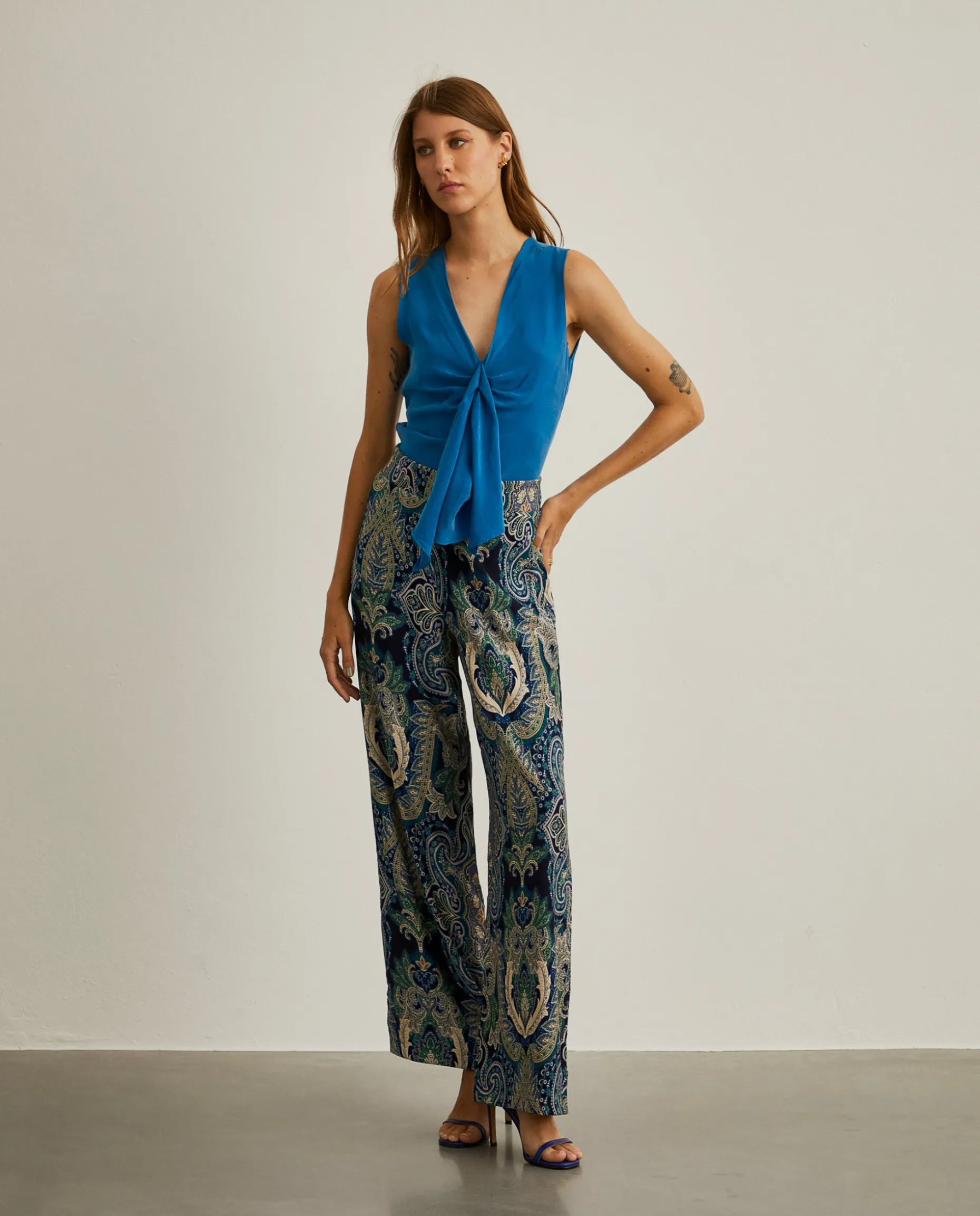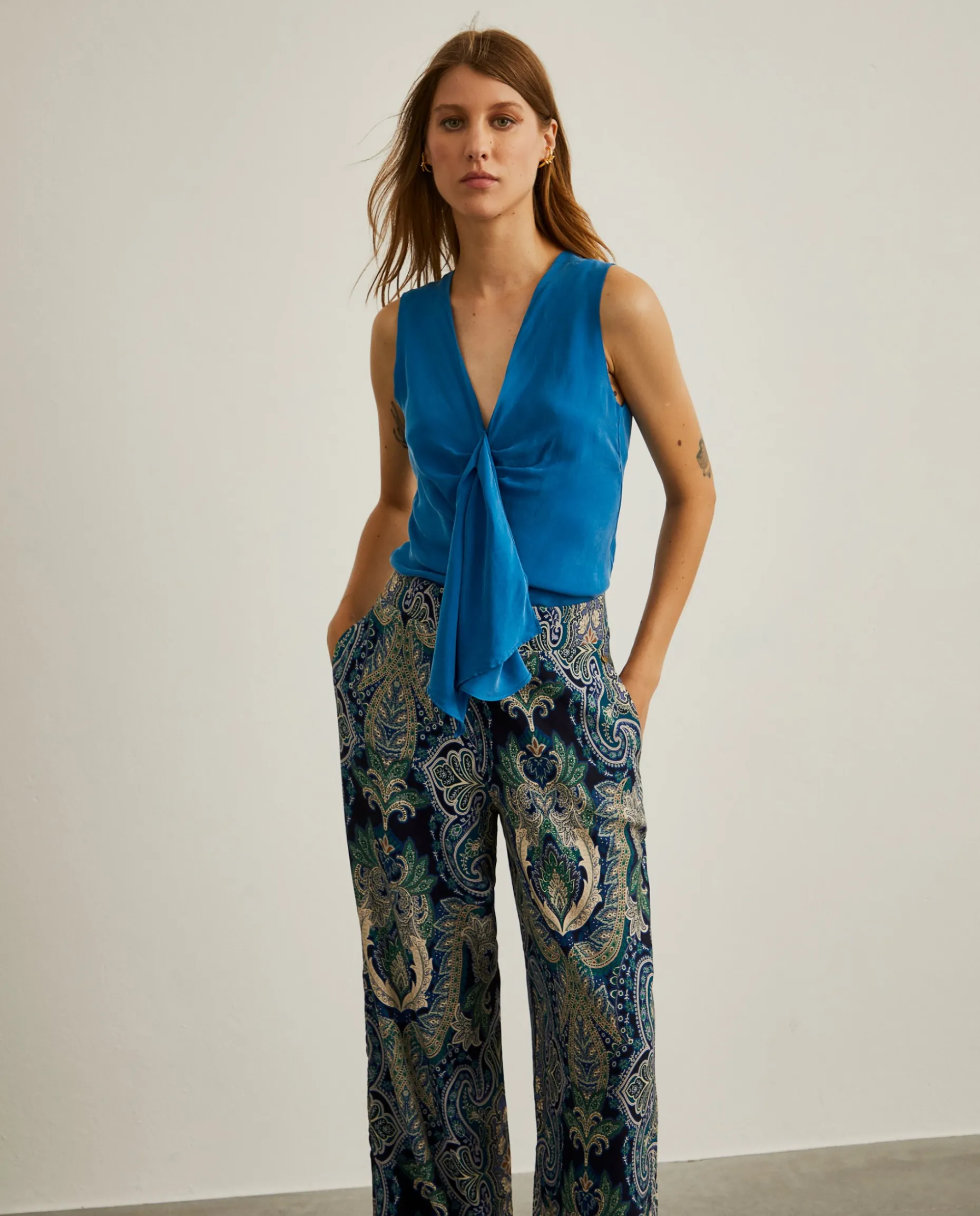 Blusa fluida sem mangas com decote em V à frente e atrás. Pormenor franzido na frente com folho que confere originalidade a qualquer look.