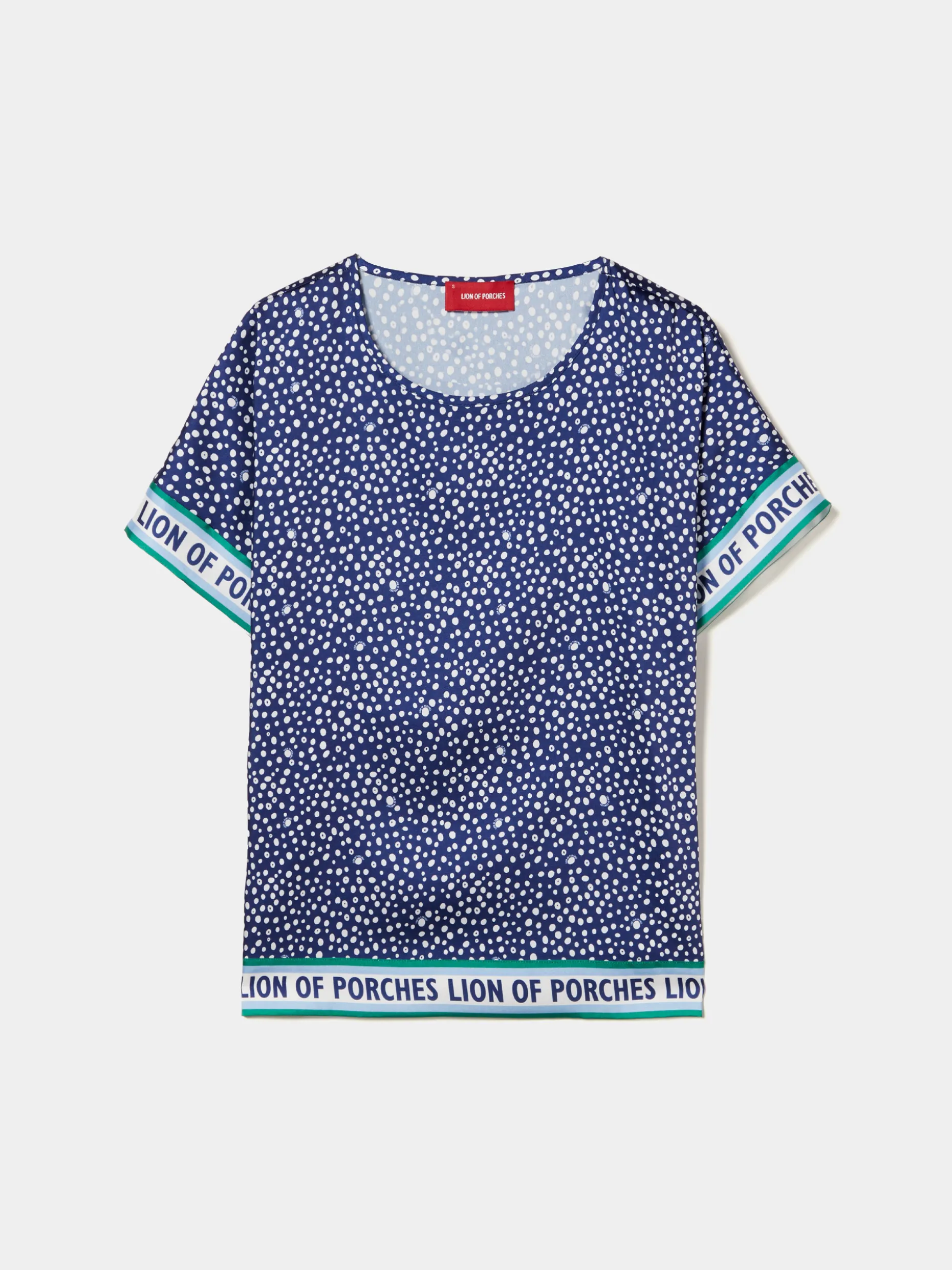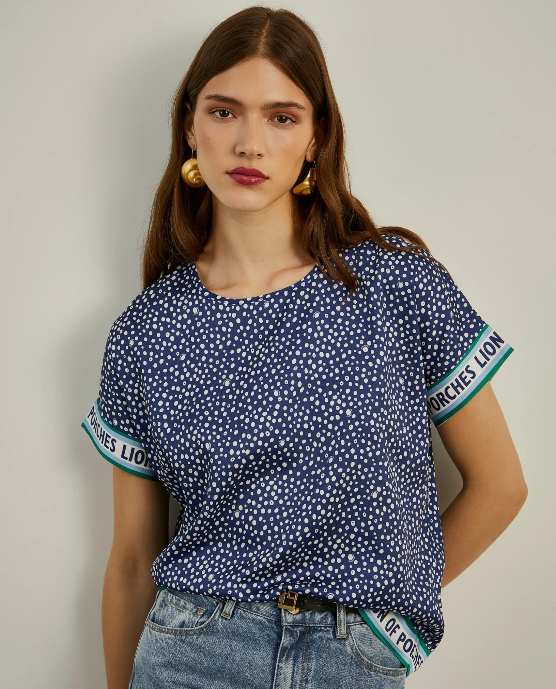 Blusa de manga curta com padrão de pintas por toda a peça. Finaliza com barras em contraste nos punhos e base com logotipo Lion of Porches em contraste.