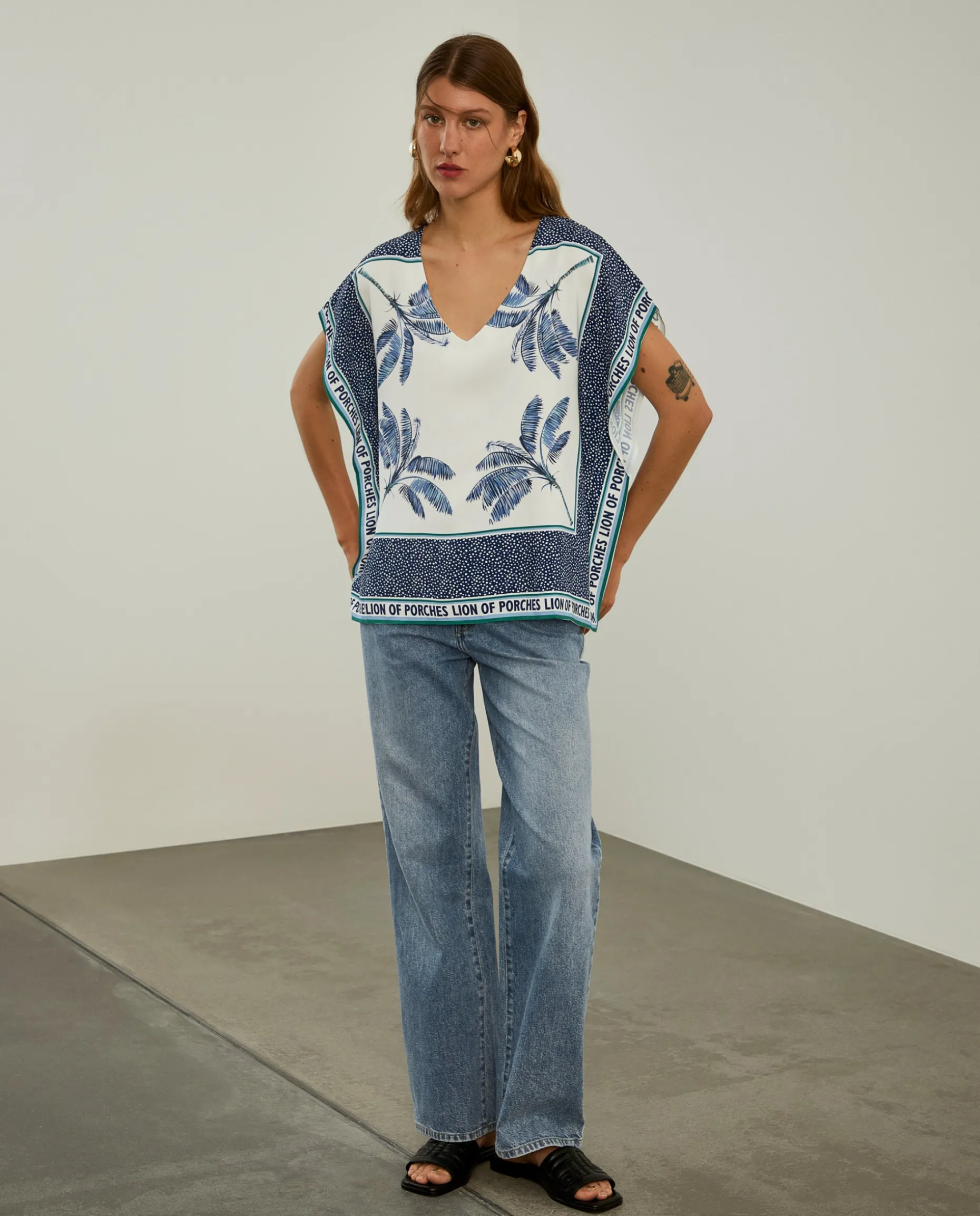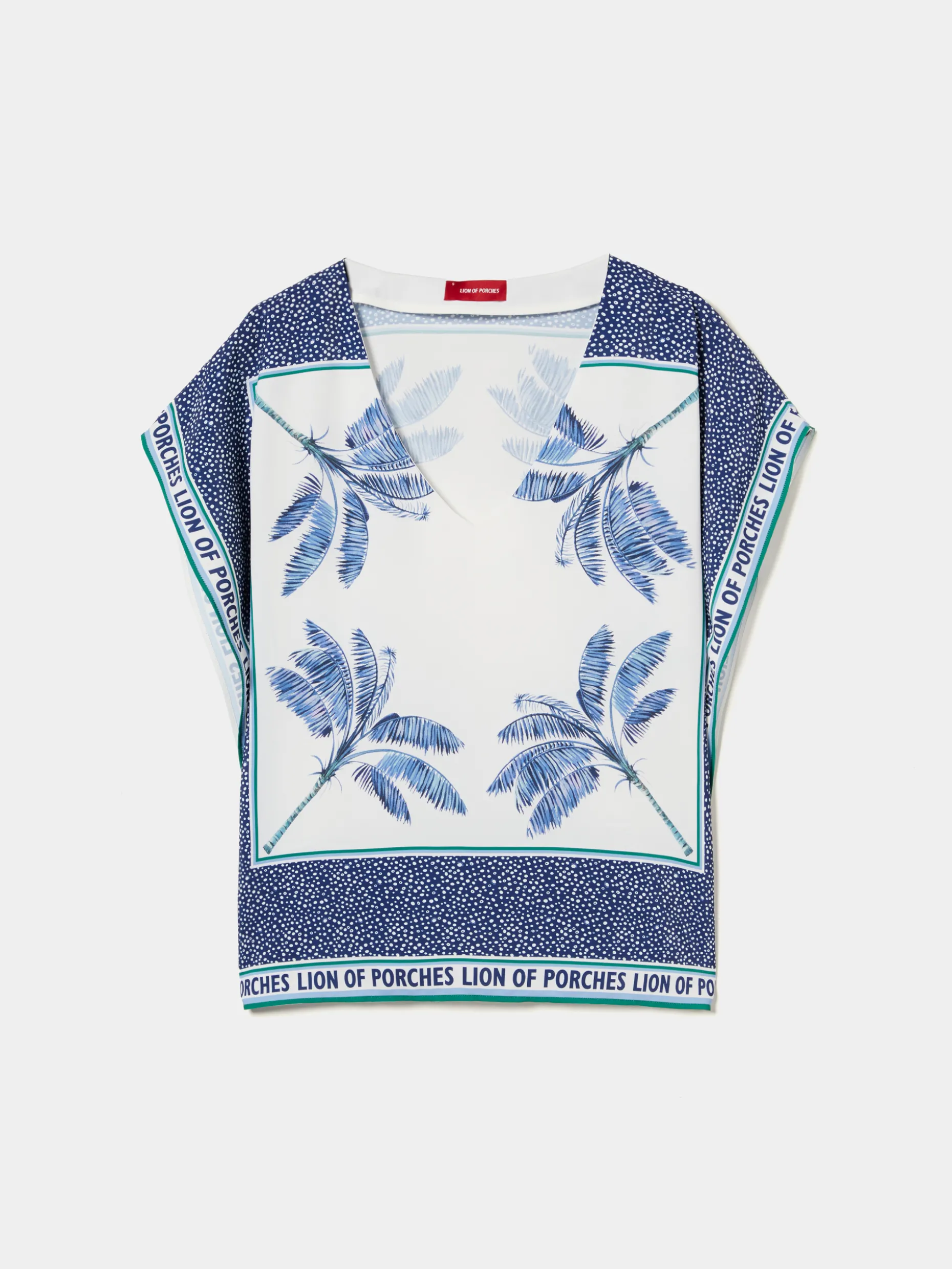 Blusa poncho, leve e fluida, com padrão de palmeiras e polka dots por toda a peça. Finaliza com logotipo Lion of Porches nas extremidades. O decote é em V.