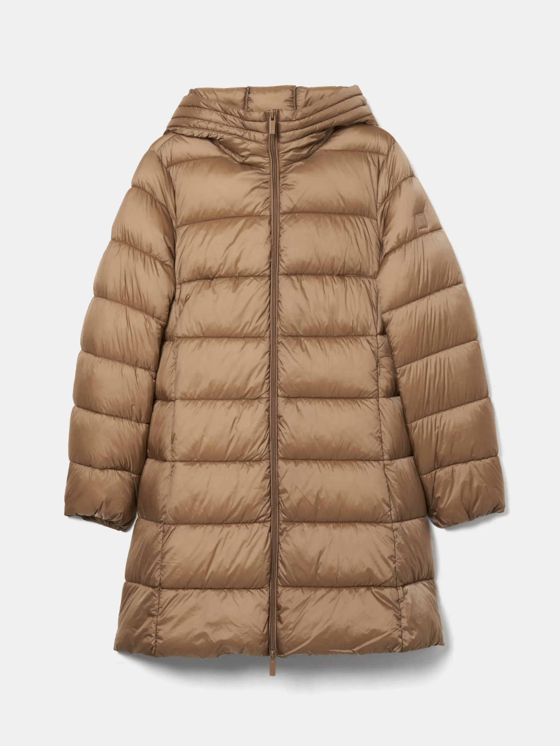 Blusão comprido acolchoado com capuz. Com abertura por fecho zíper de duplo cursor. Disponível em duas cores, com bolsos laterais e logotipo da marca no braço esquerdo.