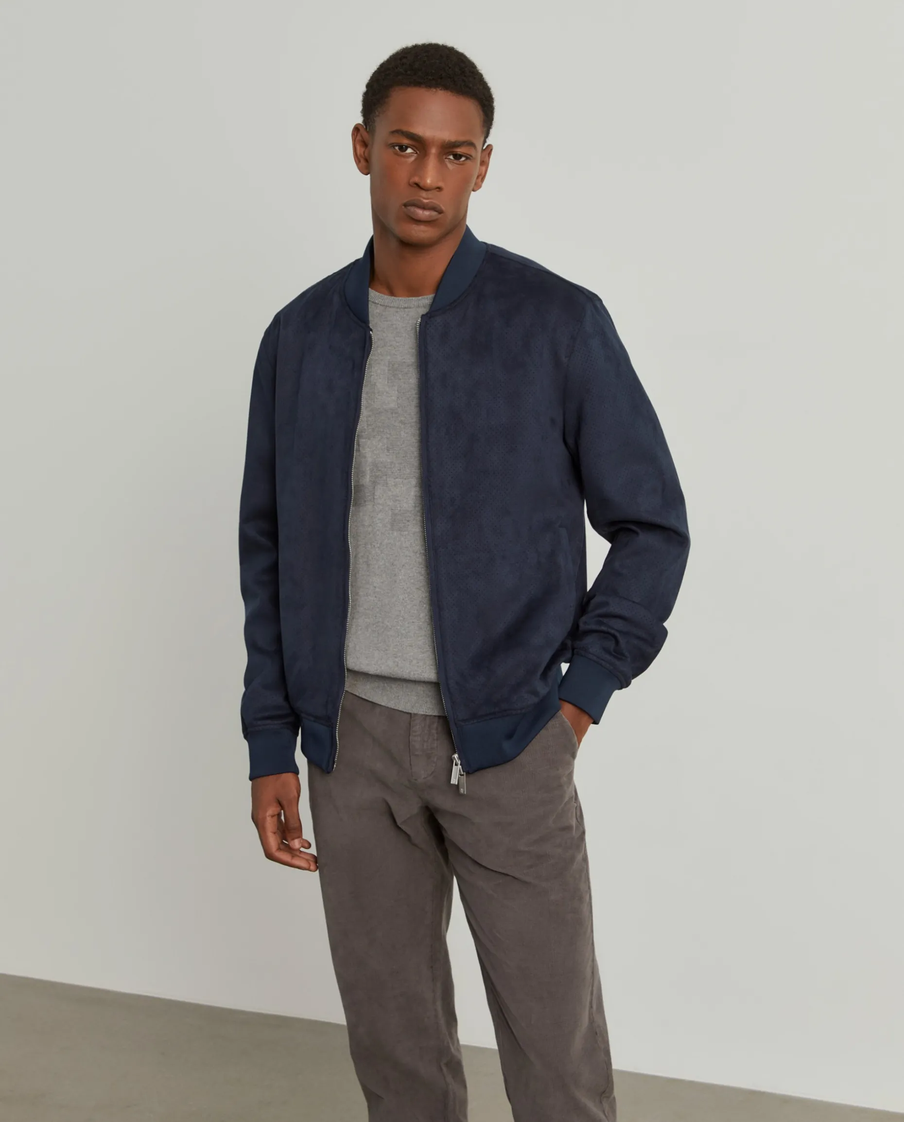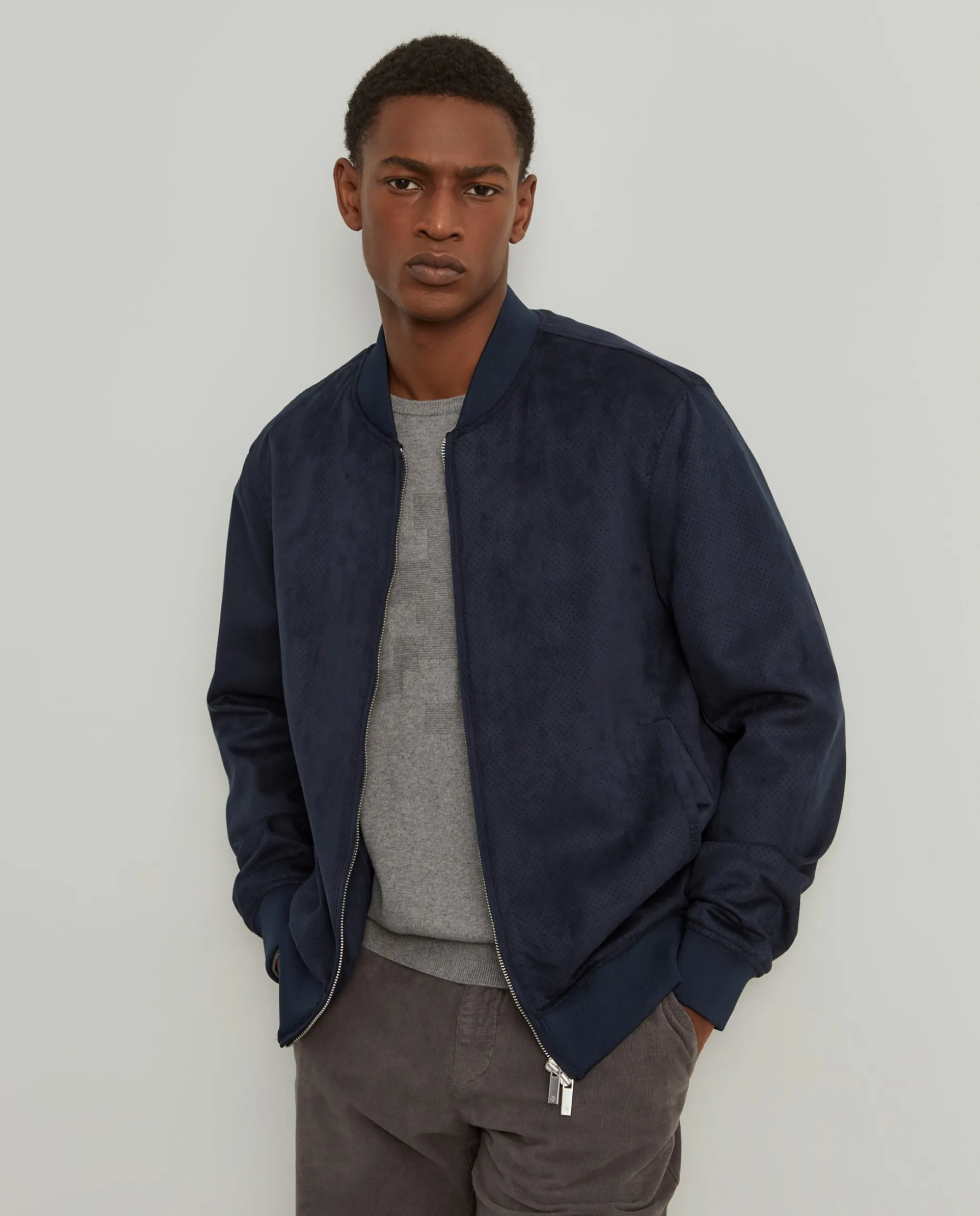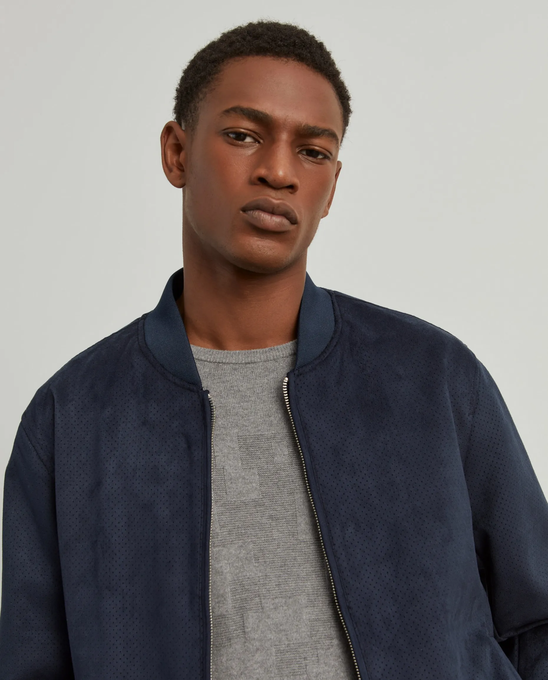 Blusão bomber, efeito camurça, com detalhes perfurados. Aperta com fecho zíper de duplo cursor e conta com bolsos laterais. Finaliza com malha canelada na cintura, nos punhos e na gola.