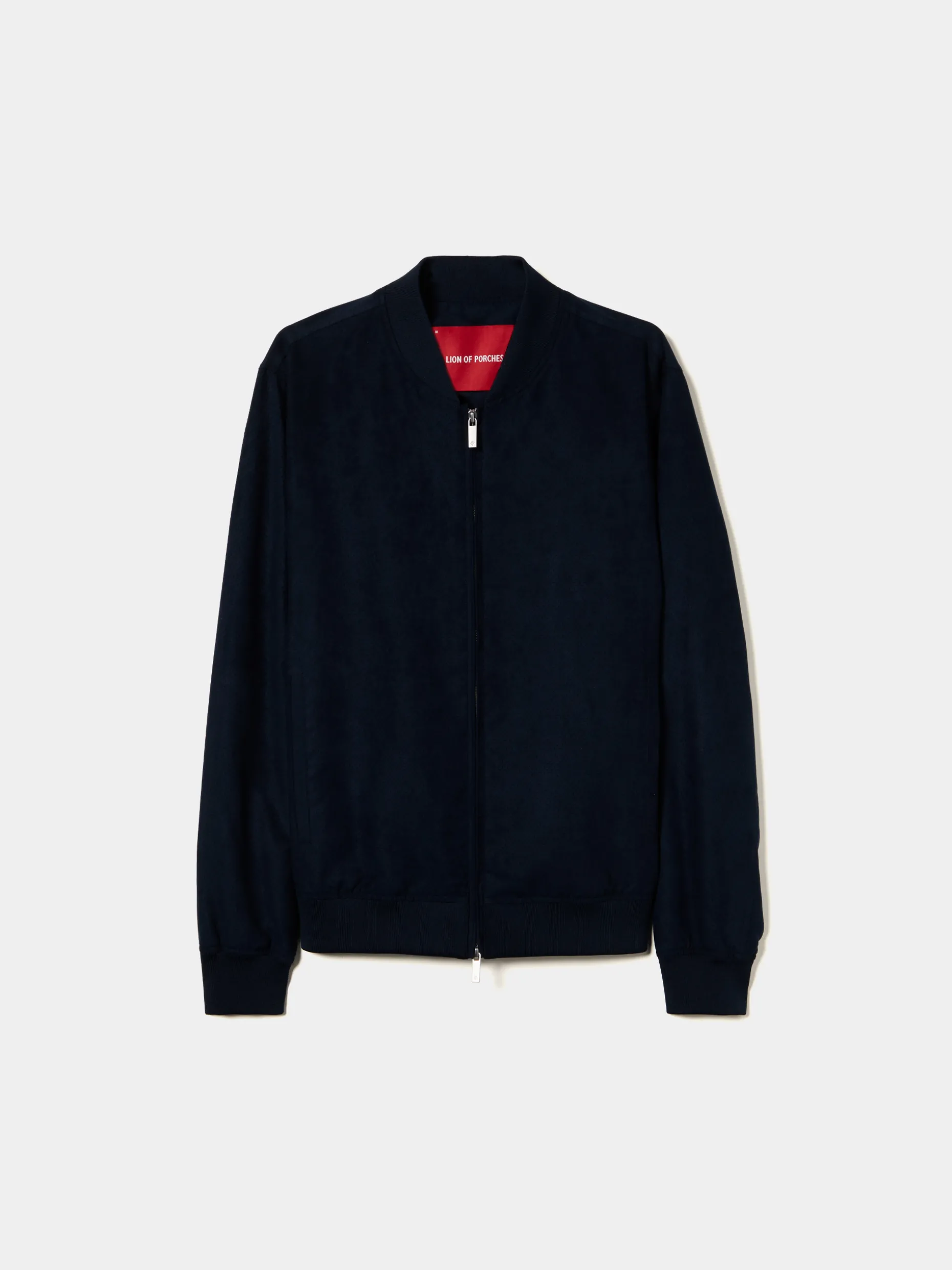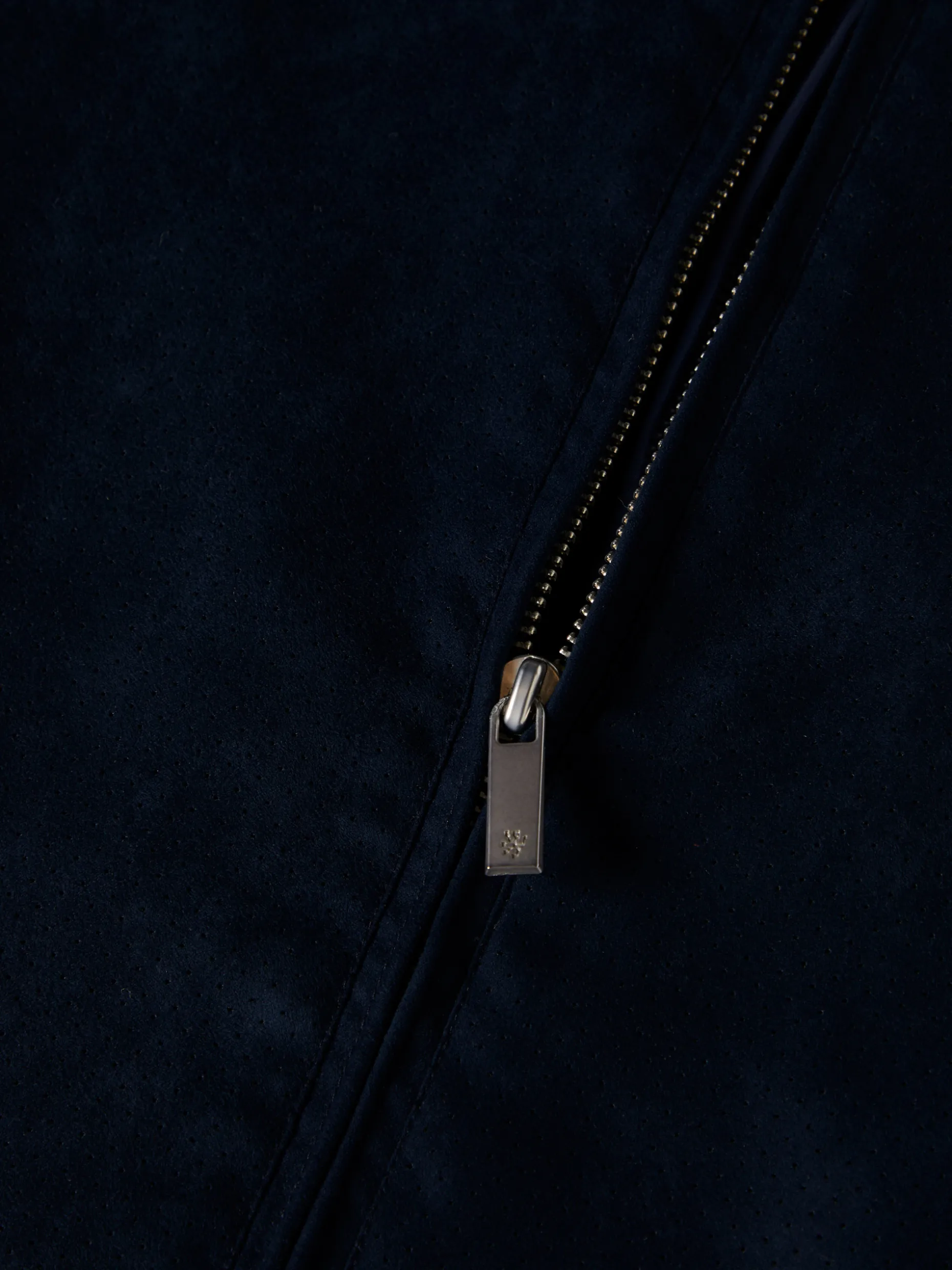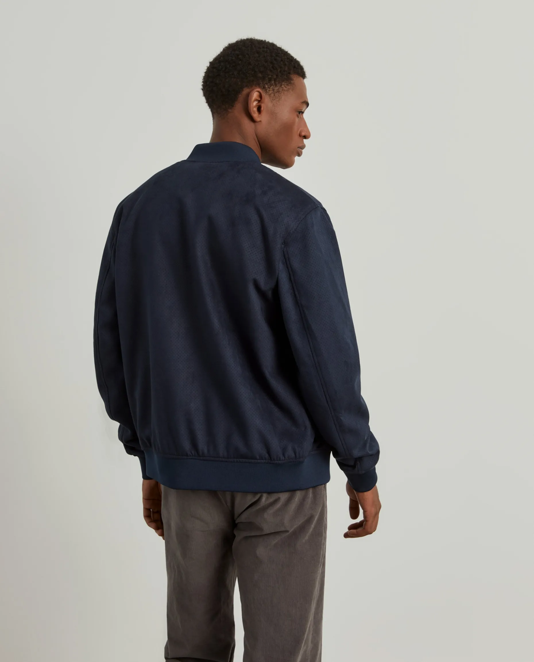 Blusão bomber, efeito camurça, com detalhes perfurados. Aperta com fecho zíper de duplo cursor e conta com bolsos laterais. Finaliza com malha canelada na cintura, nos punhos e na gola.
