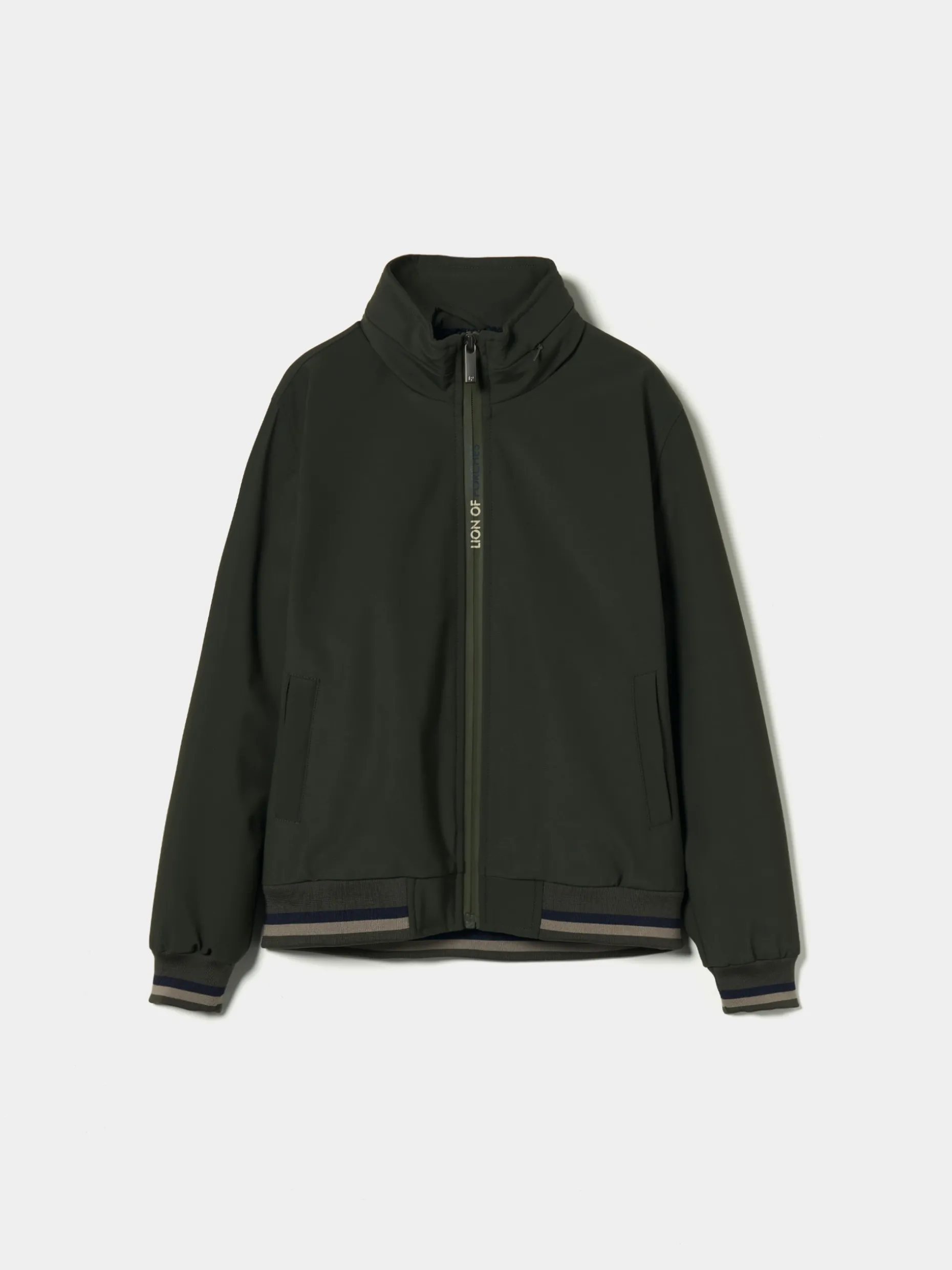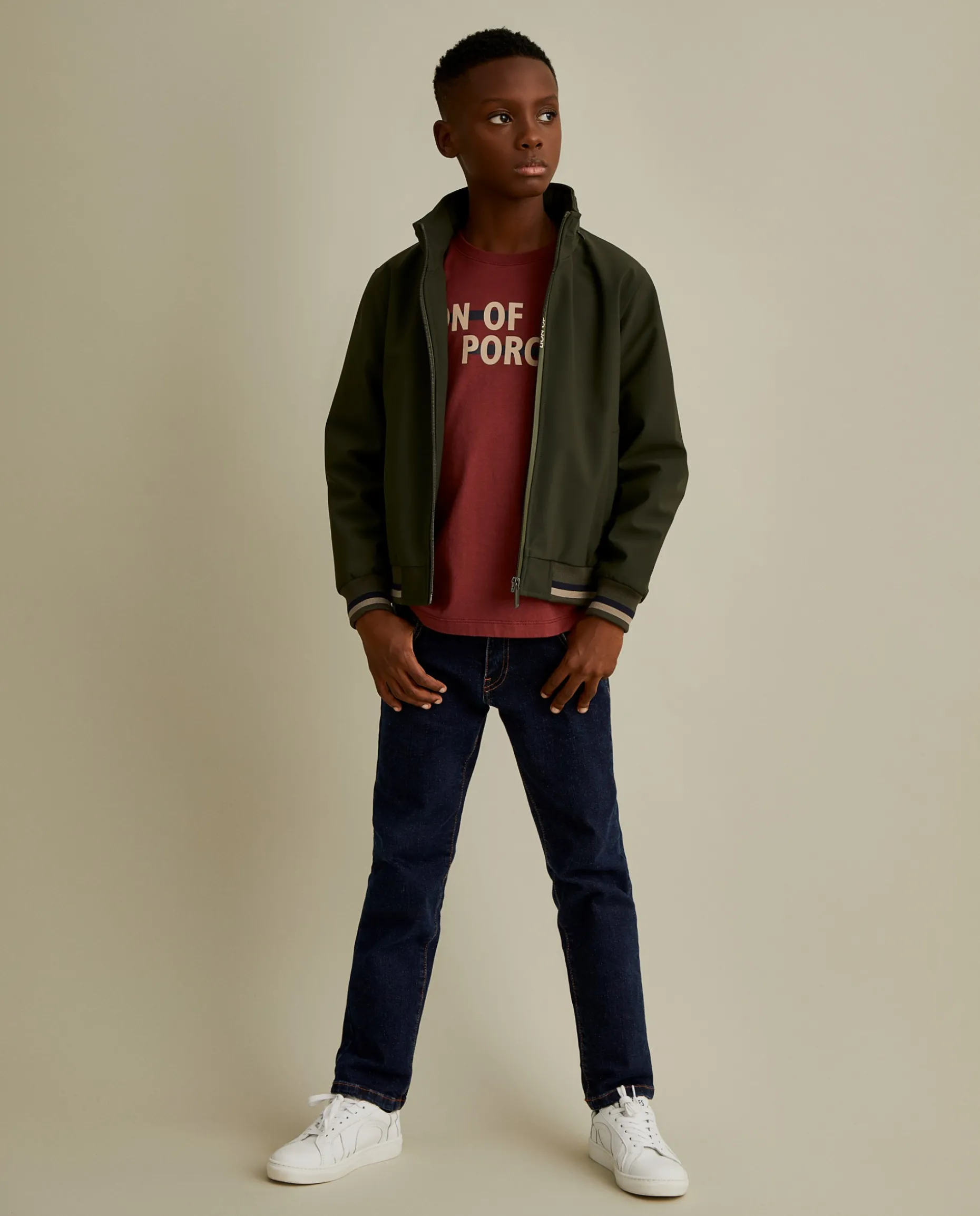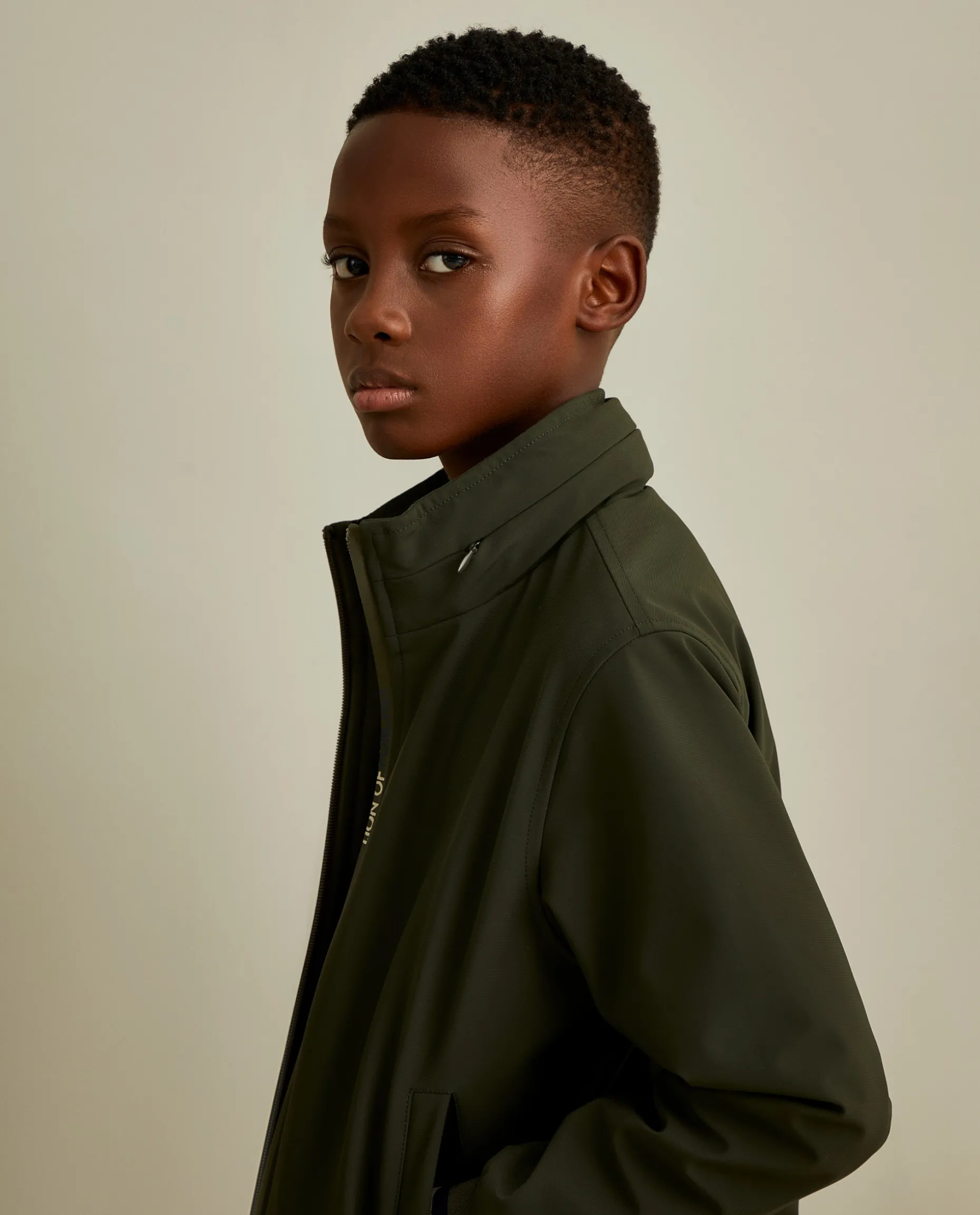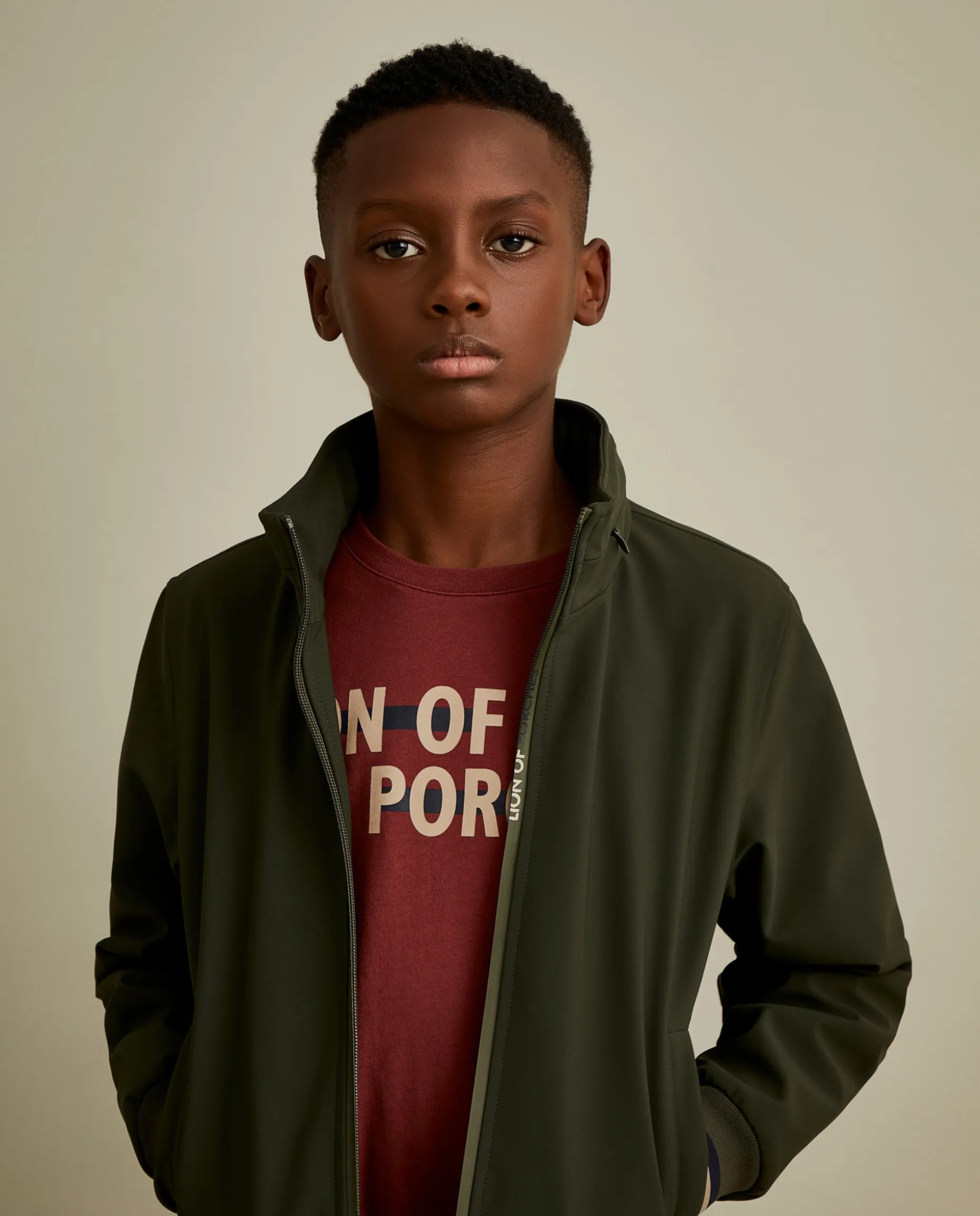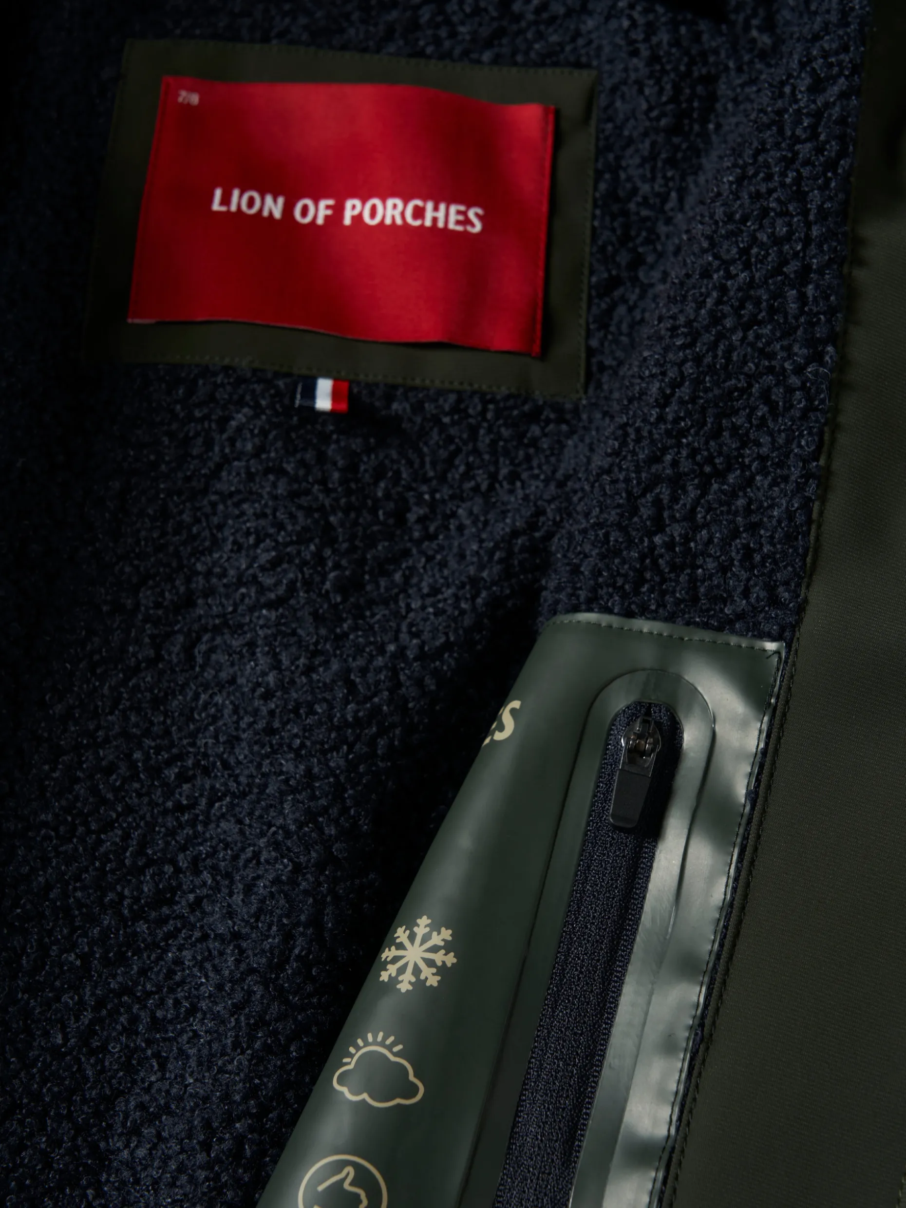 Blusão de gola subida com capuz em contraste de cor oculto na gola. O forro interior em pelo torna este casaco a peça perfeita para garantir que os miúdos estão protegidos do frio. Aperta na frente com fecho de correr vulcanizado com branding Lion of Porches. Pormenor de riscas na base e punhos canelados. No interior, estampado personalizado e bolso com fecho zíper.