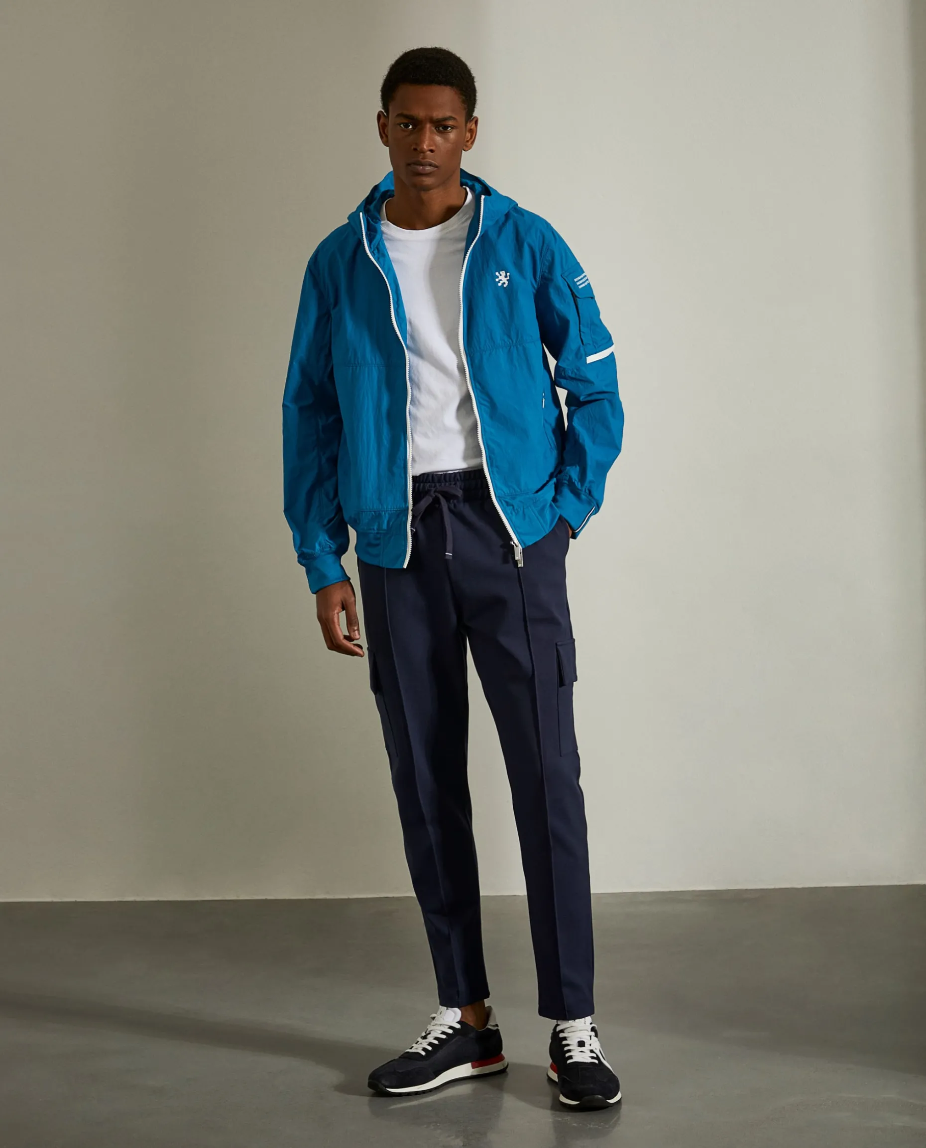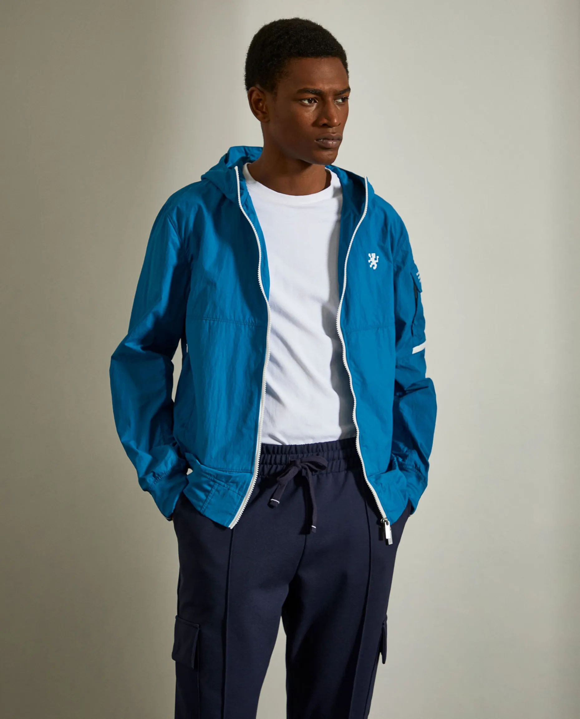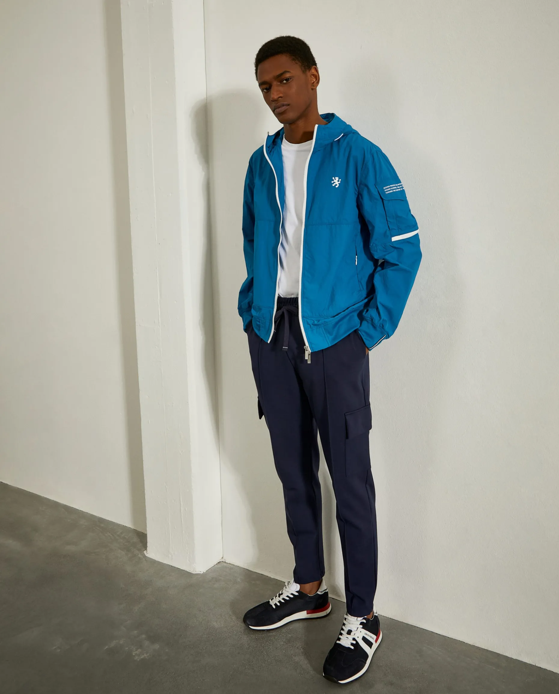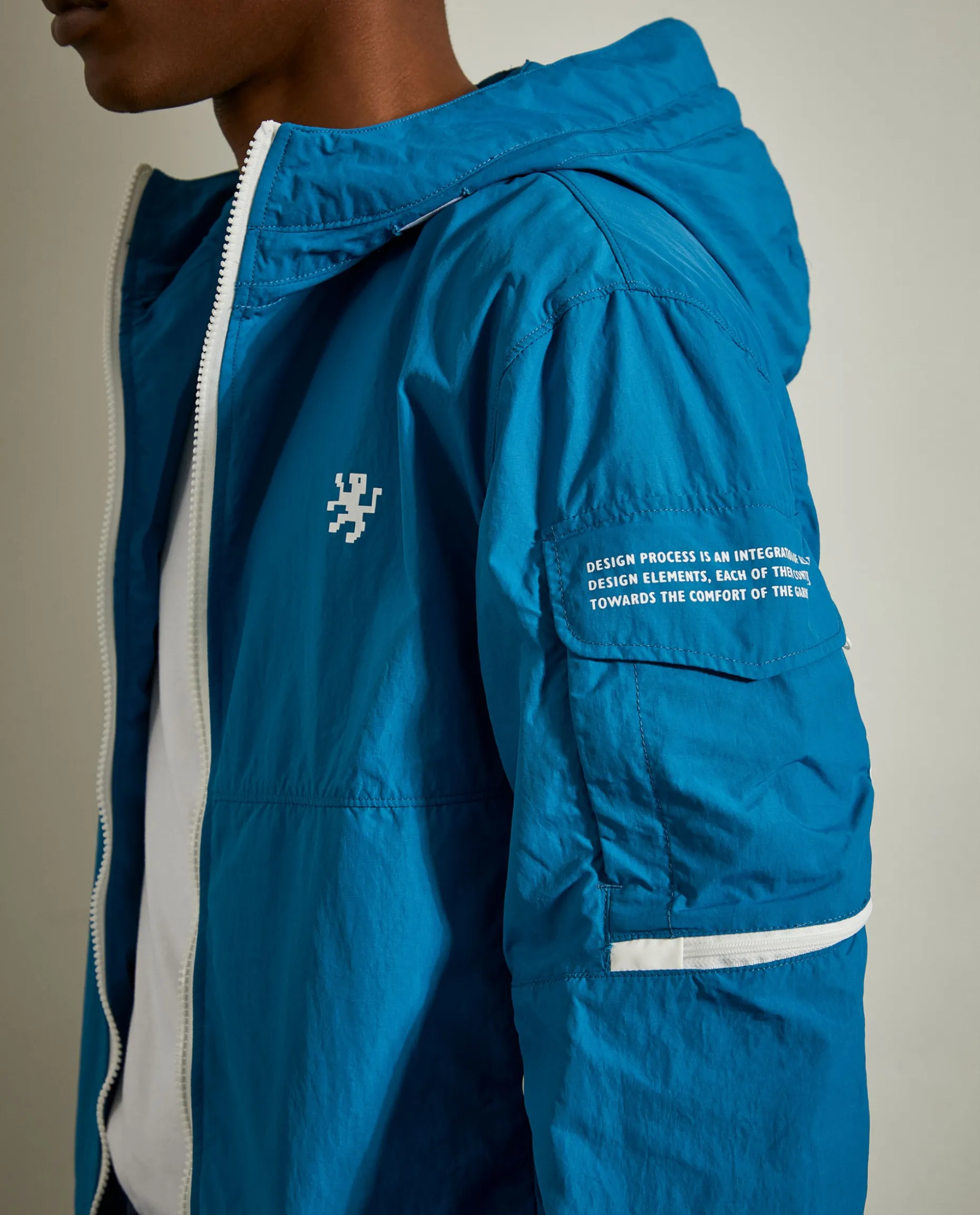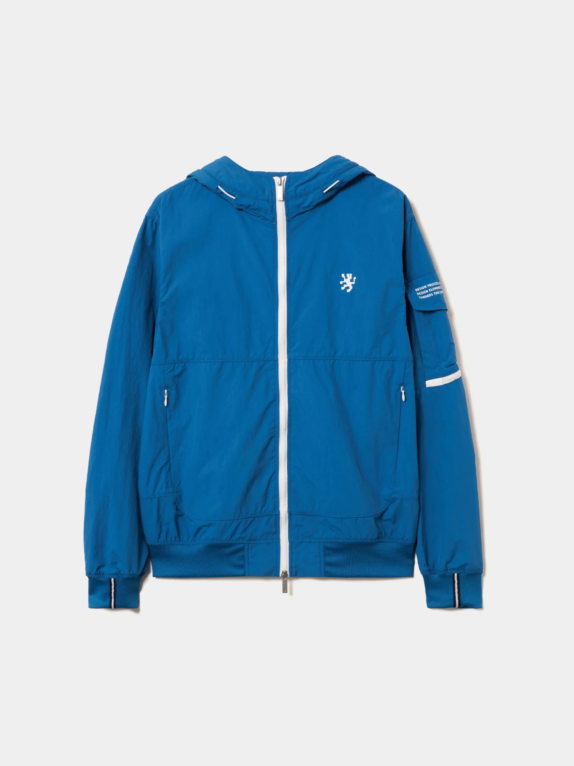 Blusão com capuz em tecido técnico. Estampado no peito. Aperta com fecho em cor contraste. Punhos em malha técnica com listas em cor contraste. Dois bolsos de fecho na frente. Bolso de chapa e pala com fecho na lateral na manga esquerda. Estampado na pala do bolso da manga.