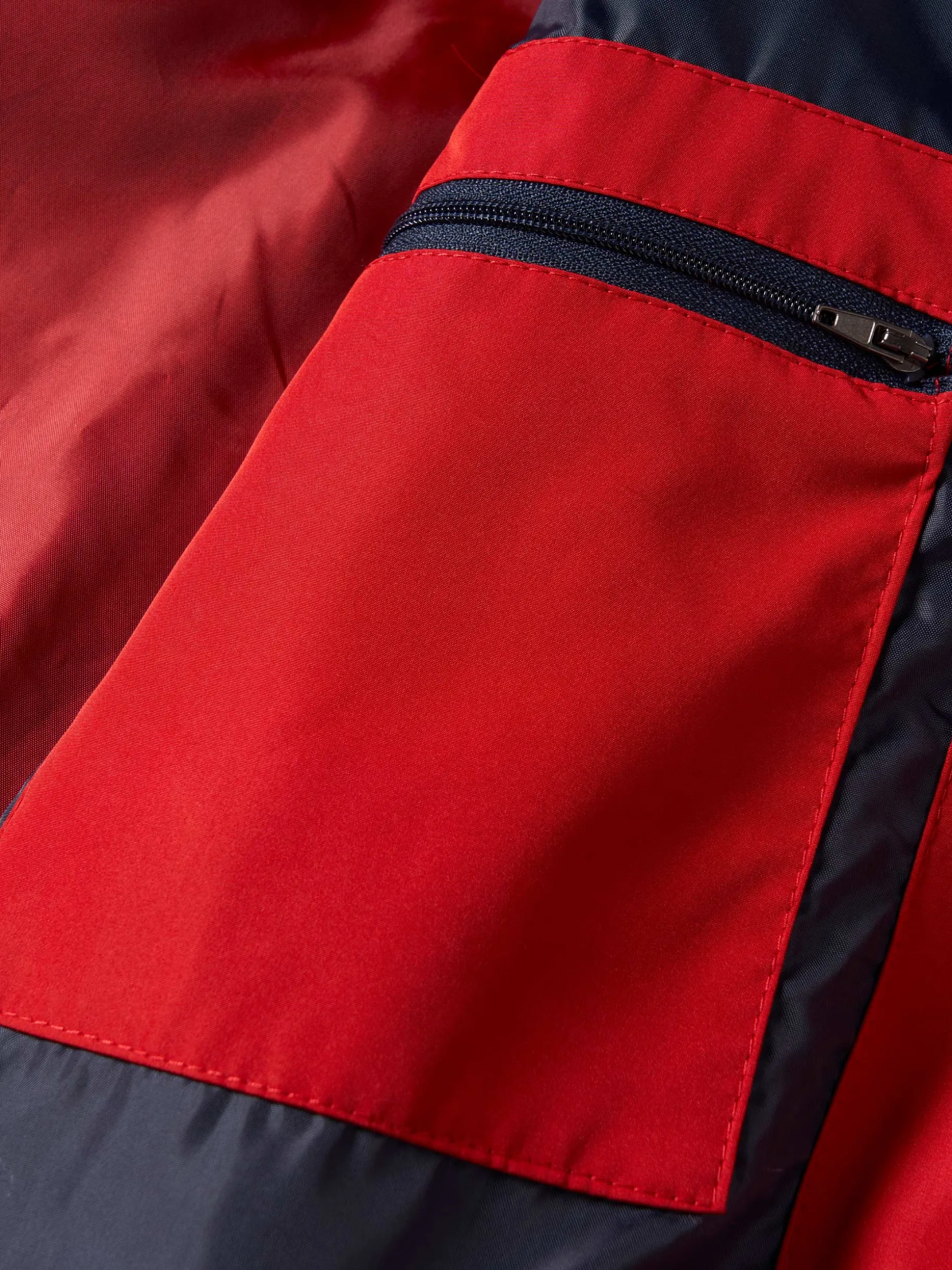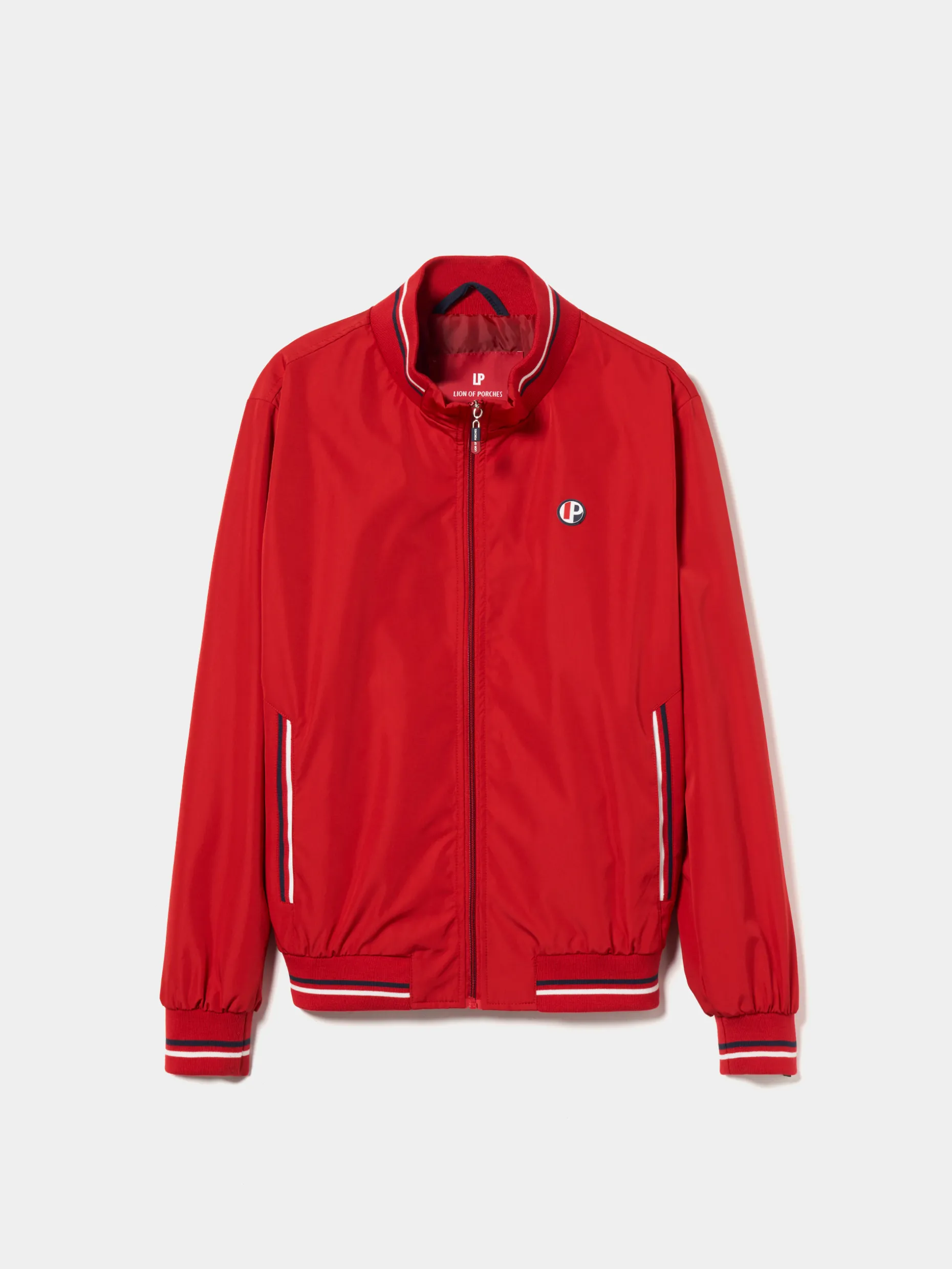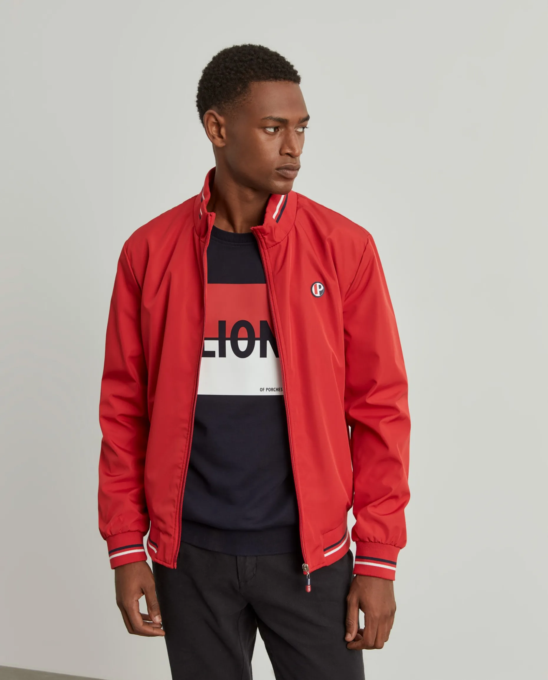 Blusão com gola subida. Em tecido técnico. Aperta com fecho central. Dois bolsos com molas de pressão. Emblema “Lion of Porches” no peito. Cinto e punhos em malhas canelada com riscas em cor contraste. Bolso de fecho no interior.